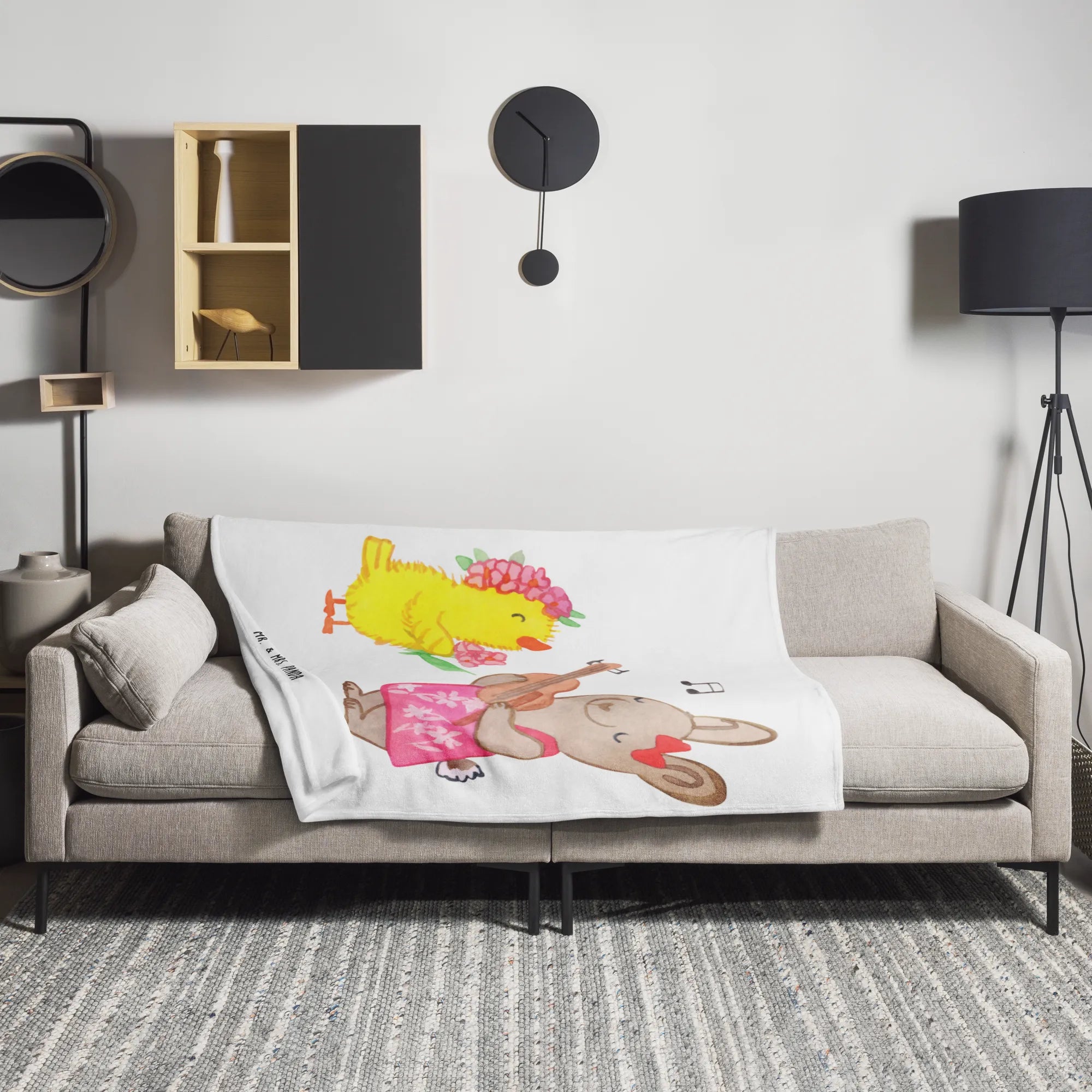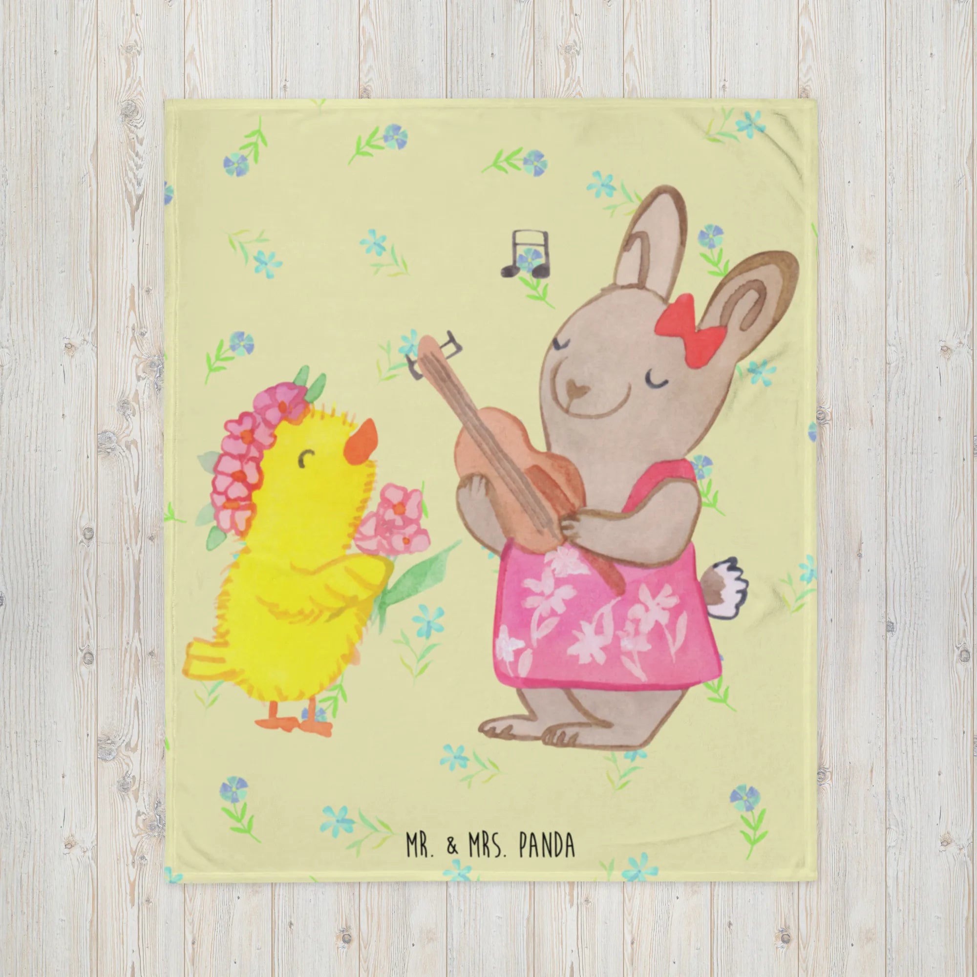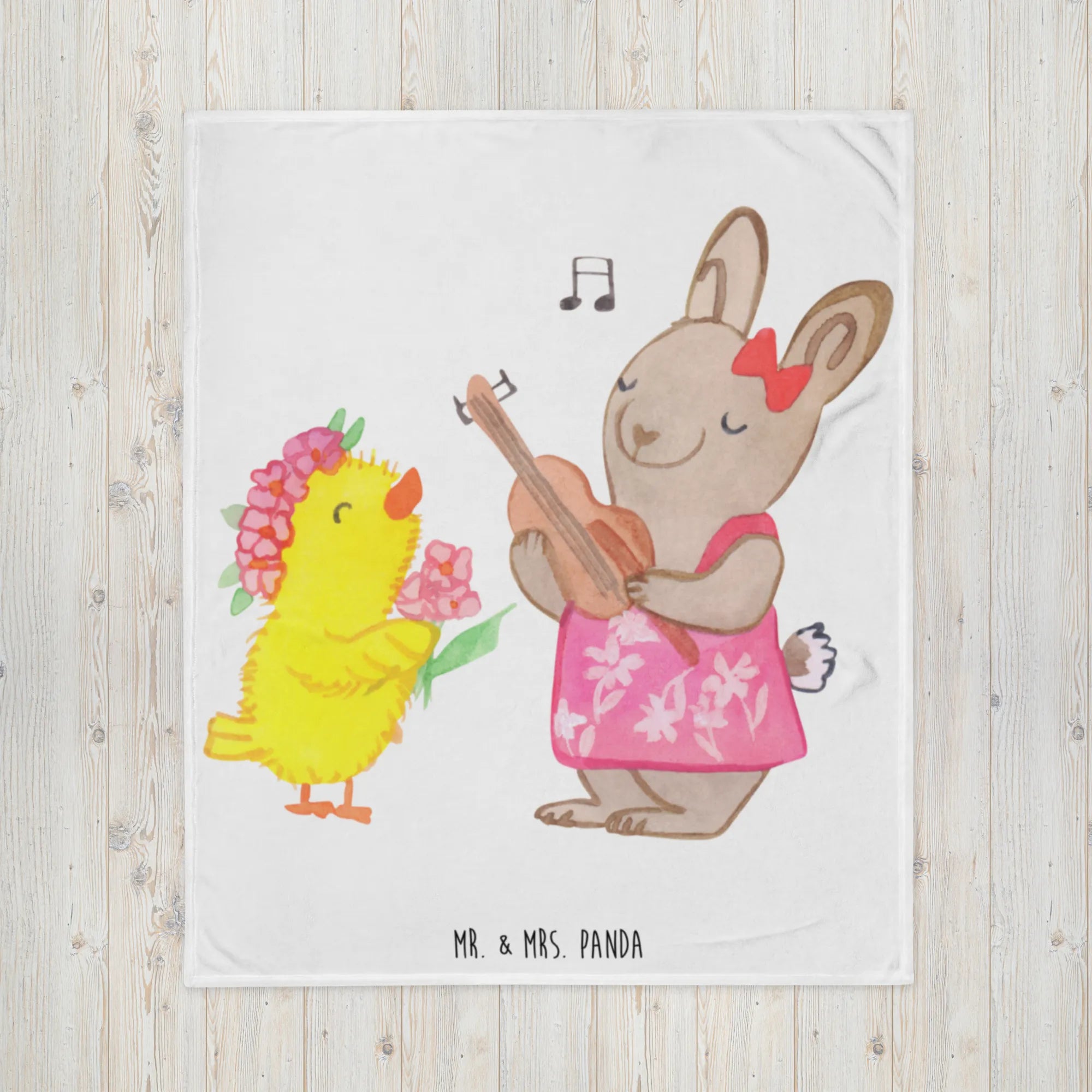 Diese hochwertige und wunderschöne Kuscheldecke ist mit einem süßen Motiv von einem fröhlichen Hasen in einem Sommerkleid, der einem niedlichen Küken ein Lied auf der Gitarre vorspielt, bedruckt. Mit ihrem einseitigen Druck und den super leuchtenden Farben bringt sie Frühlingsgefühle direkt in dein Zuhause.
