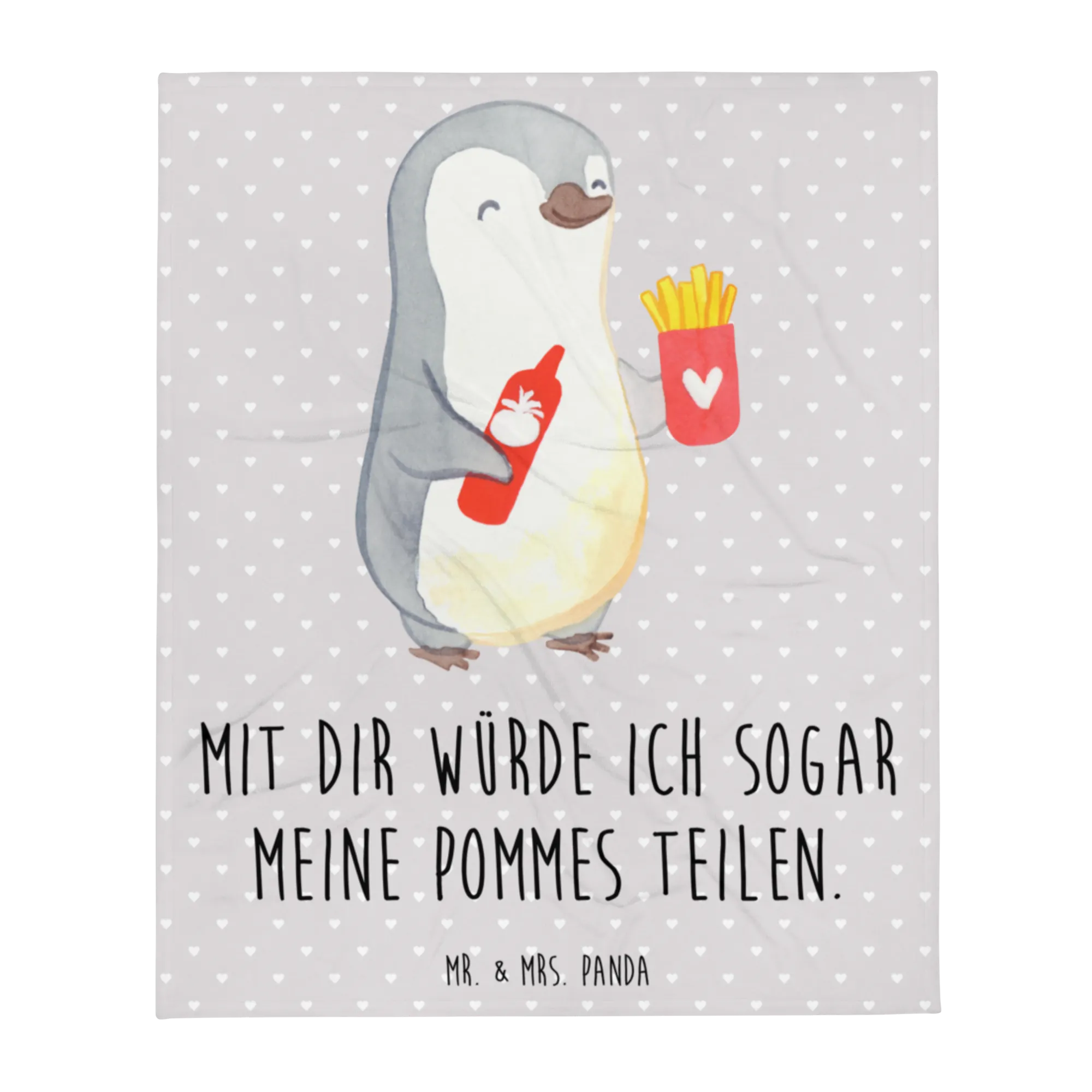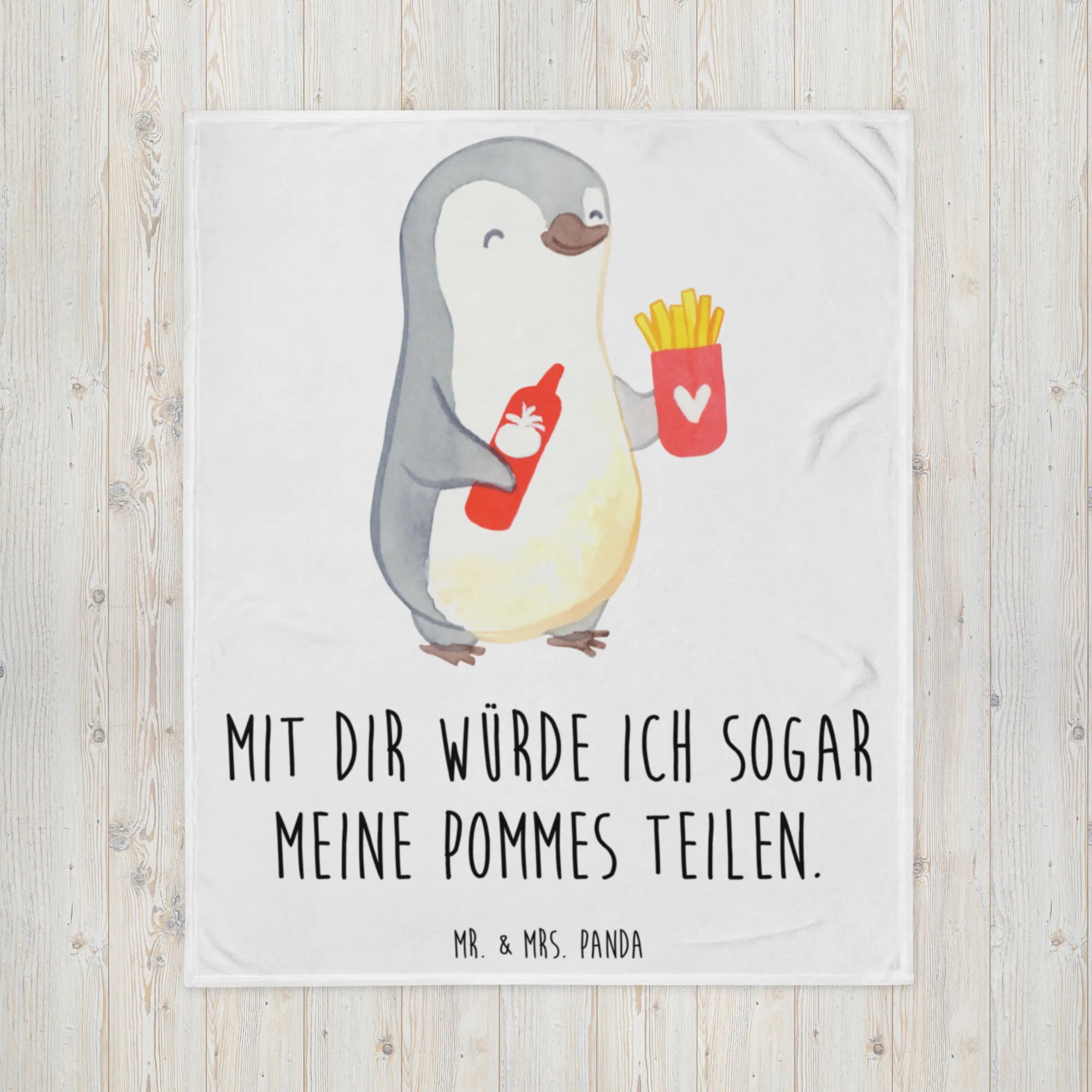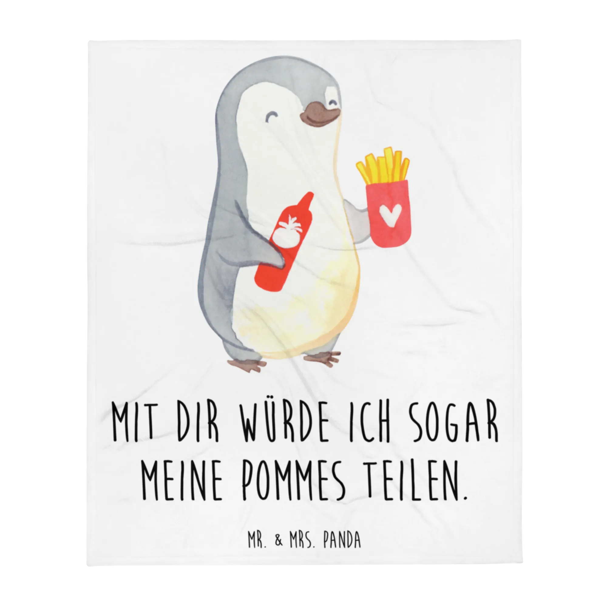 Die Kuscheldecke "Pinguin Pommes" aus der Liebe Kollektion von Mr. & Mrs. Panda ist das perfekte Geschenk für jeden Anlass, der das Herz höher schlagen lässt! Diese hochwertige und wunderschöne Decke mit dem niedlichen Pinguin, der voller Freude Pommes Frites genießt, sorgt sofort für gute Laune und воспроизводит моменты, которые вы разделяете с любимым человеком. Wenn Du auf der Suche nach einem einzigartigen Geschenk für den Valentinstag, einen Jahrestag oder den Hochzeitstag bist, dann ist diese Kuscheldecke genau das Richtige. Mit dem liebevollen Spruch "Mit dir würde ich sogar meine Pommes teilen" ist sie nicht nur ein dekoratives Element für Dein Zuhause, sondern auch ein Liebesbeweis, der über warme Worte hinausgeht.