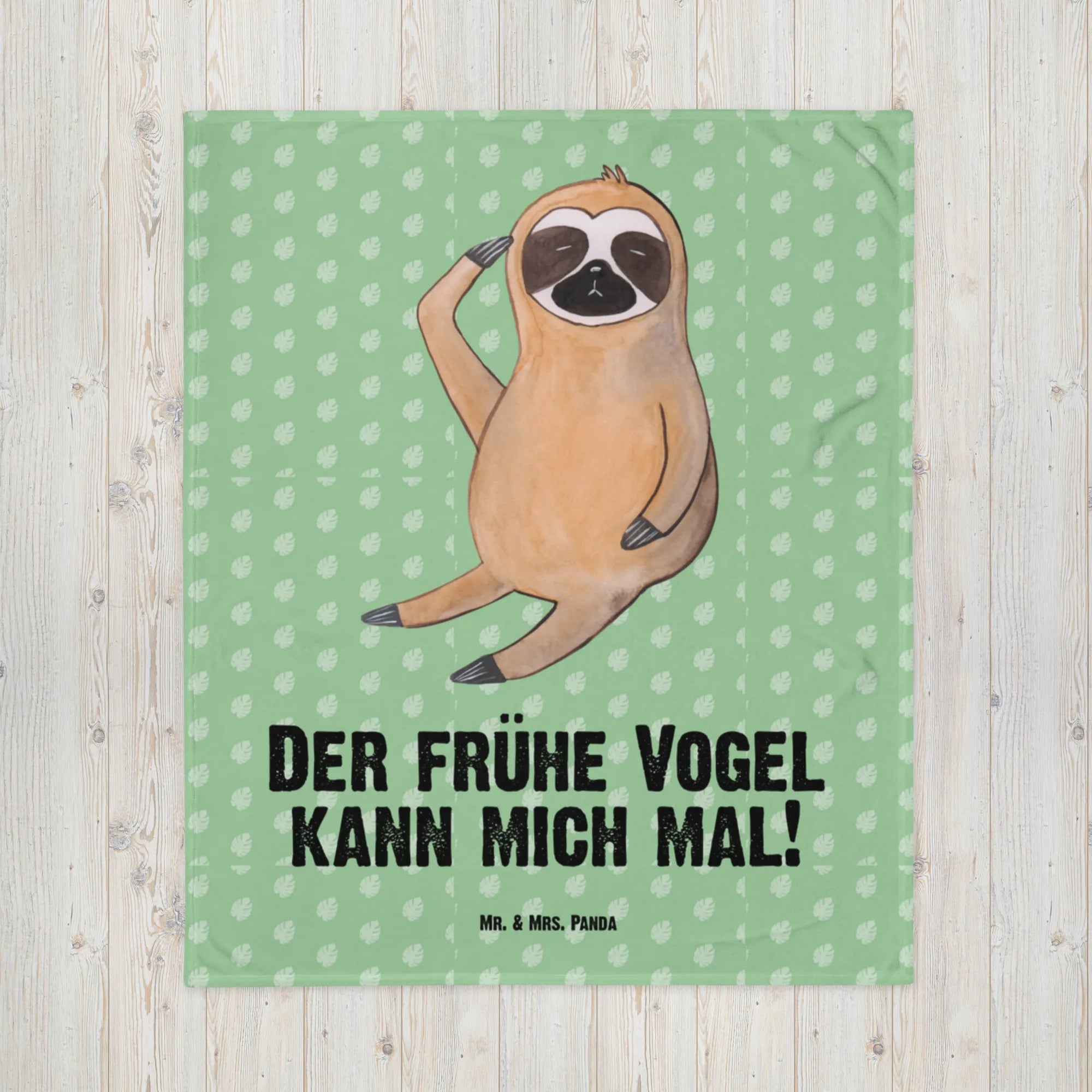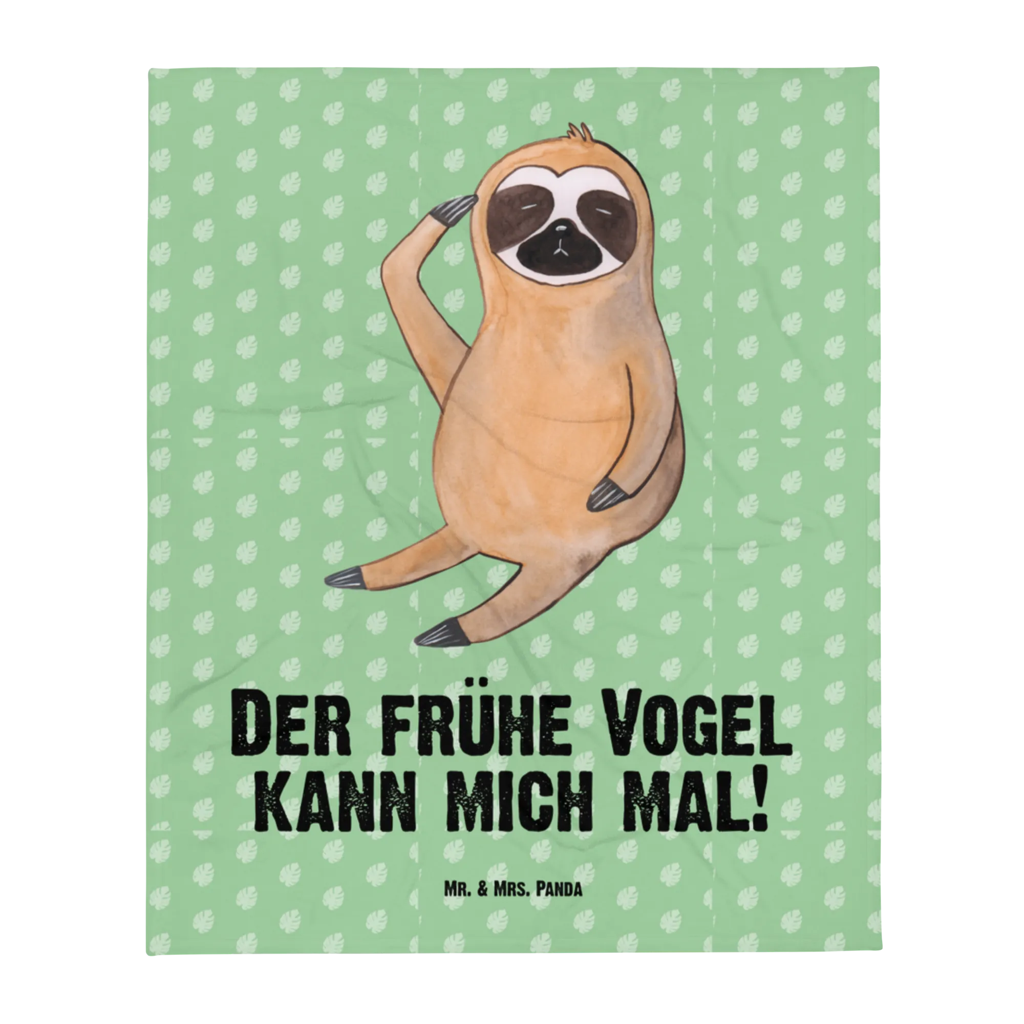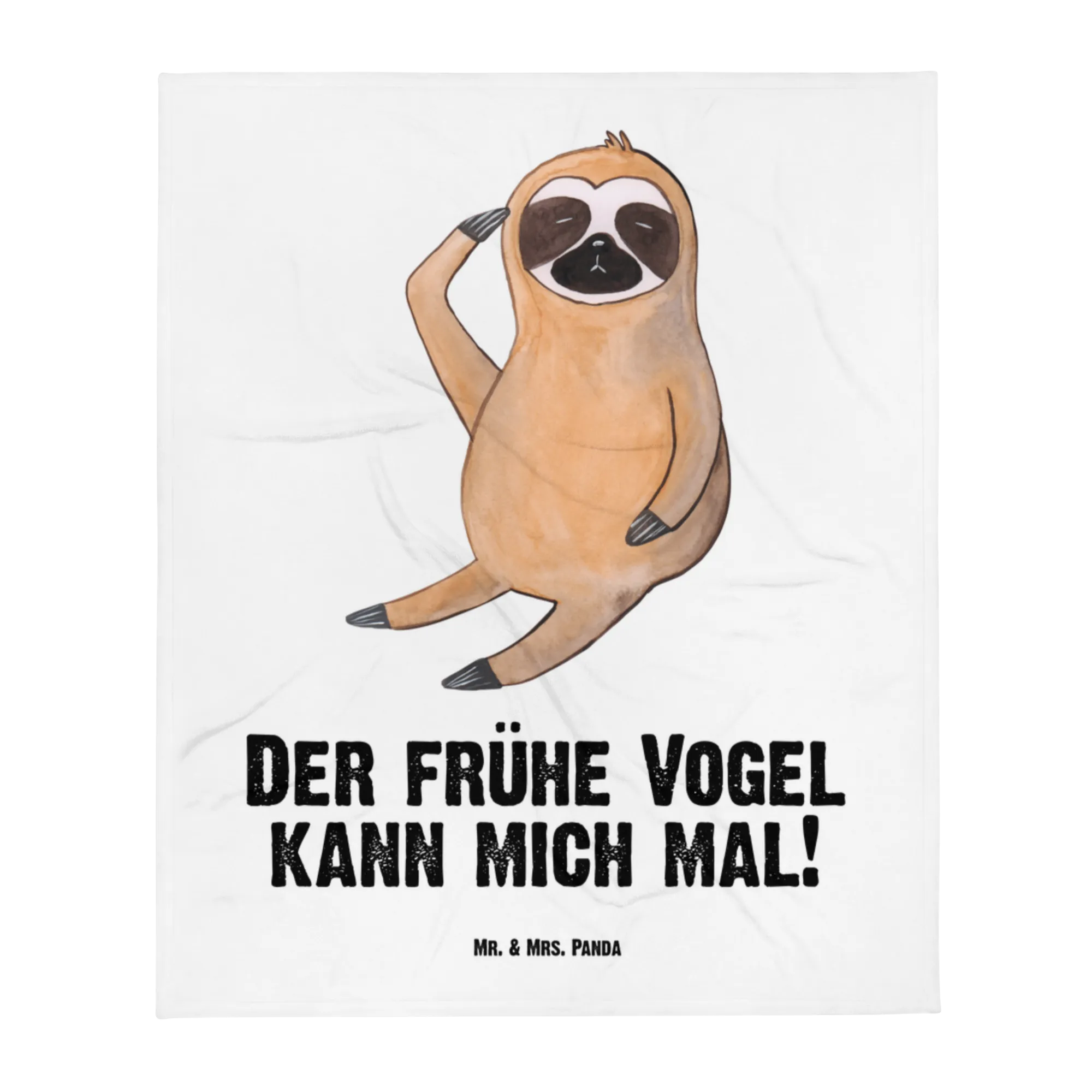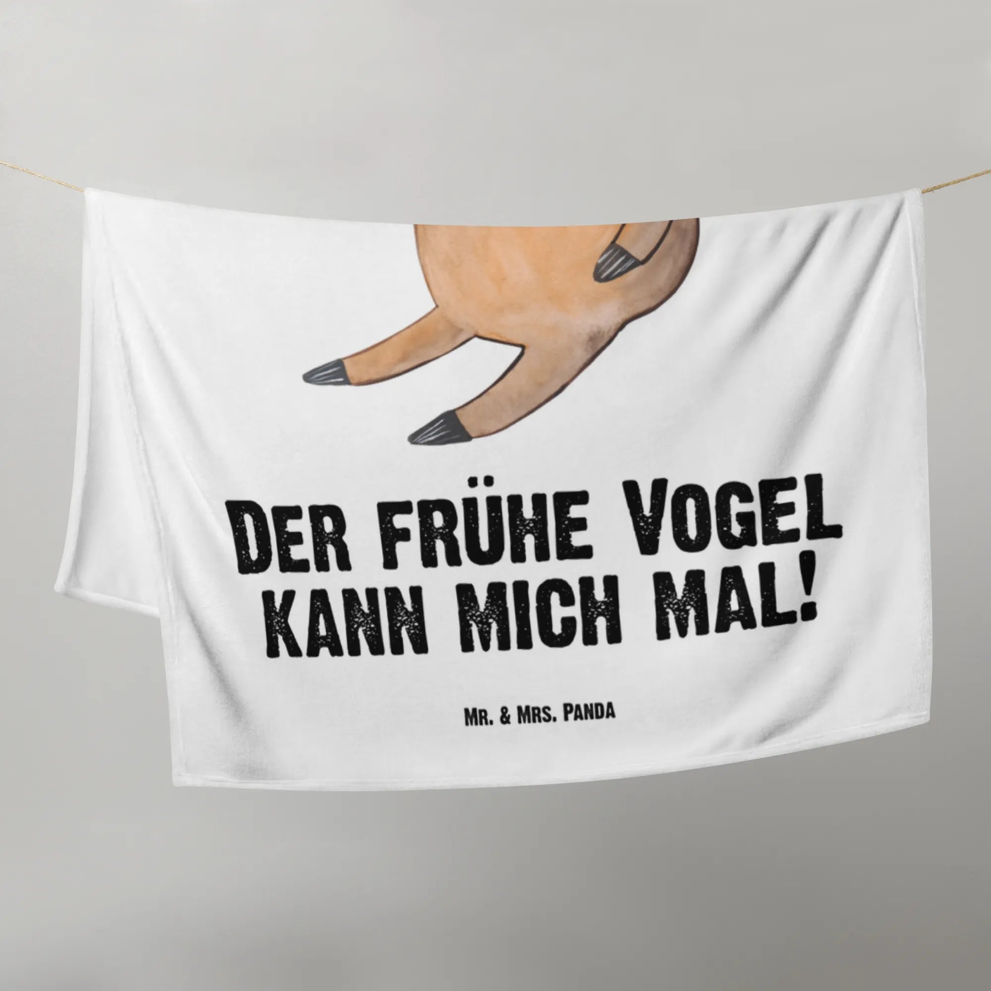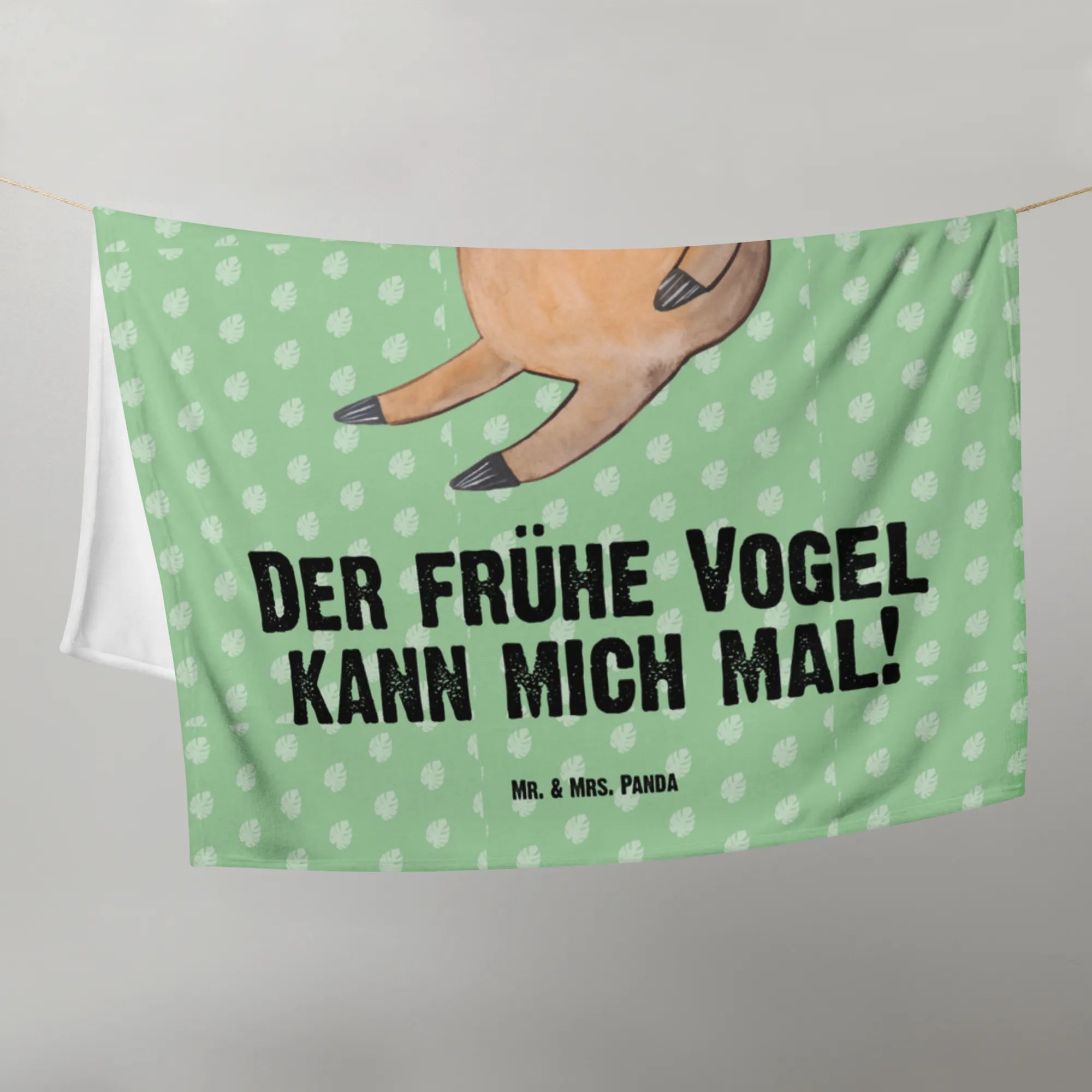 Mit unserem liebenswerten Faultier und dem frechen Spruch „Der frühe Vogel kann mich mal!“ bringst Du sofort Gemütlichkeit und ein Lächeln ins Kinderzimmer. Das von Mrs. Panda handgezeichnete Motiv zeigt ein erstauntes Faultier, das sich verschmitzt an die Schläfe tippt – ein echter Blickfang als Babydecke, Kuscheldecke oder Dekodecke.