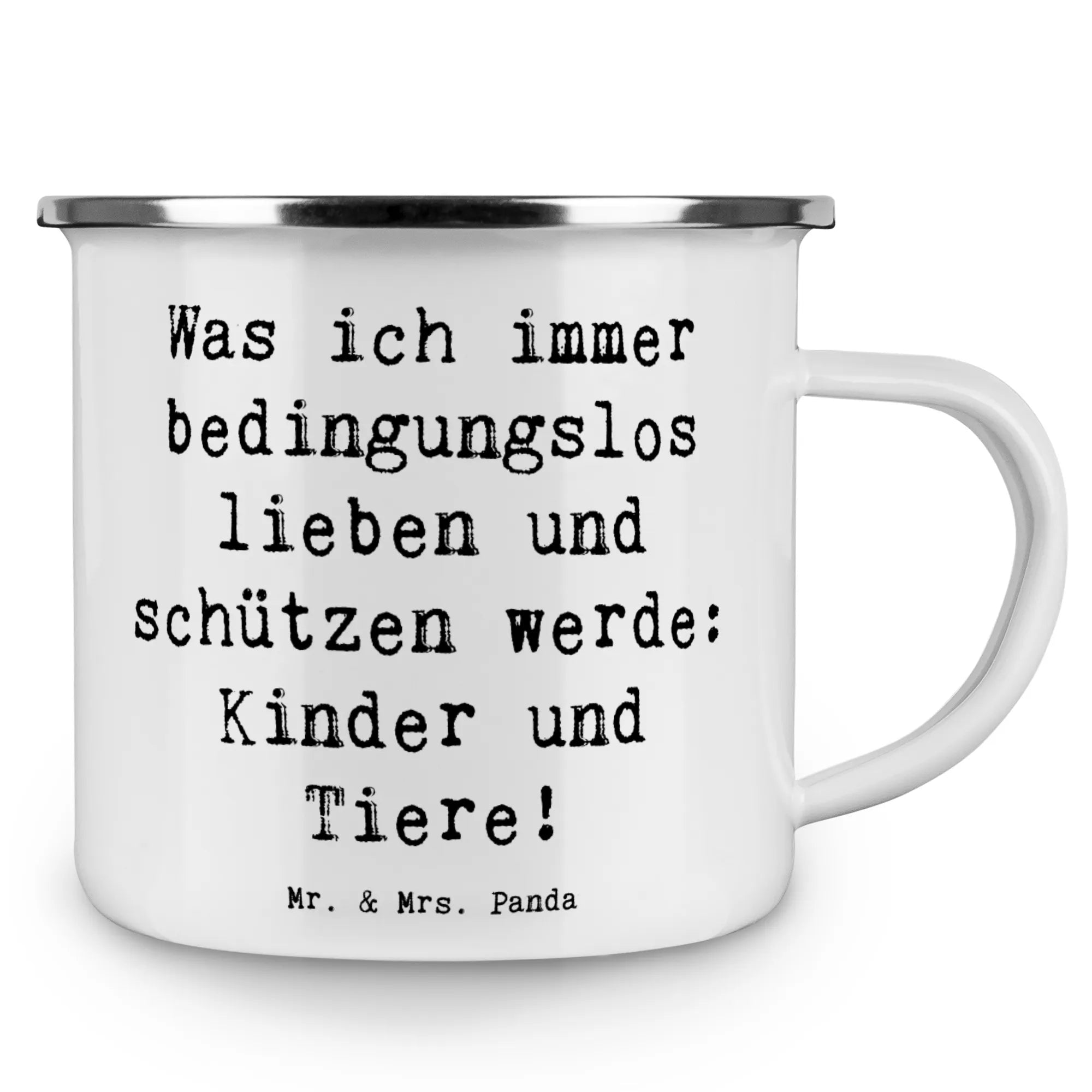 Mr. & Mrs. Panda Camping Emaille Tasse „Schutz“ – eine kleine Herzensbotschaft für jeden Tag. Auf dem hellen, weißen Hintergrund steht der liebevolle Spruch: „Was ich immer bedingungslos lieben und schützen werde: Kinder und Tiere!“. Diese Tasse vereint Funktion und Gefühl und begleitet Dich bei allen Abenteuern.
