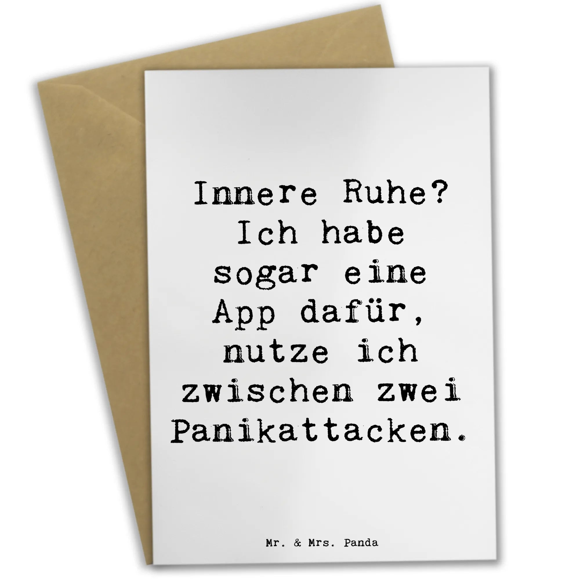 Die Vorderseite der Karte ist liebevoll mit dem Spruch "Innere Ruhe? Ich habe sogar eine App dafür, nutze ich zwischen zwei Panikattacken." gestaltet. Ein witziges und zugleich nachdenkliches Zitat, das zum Schmunzeln und Nachdenken anregt.