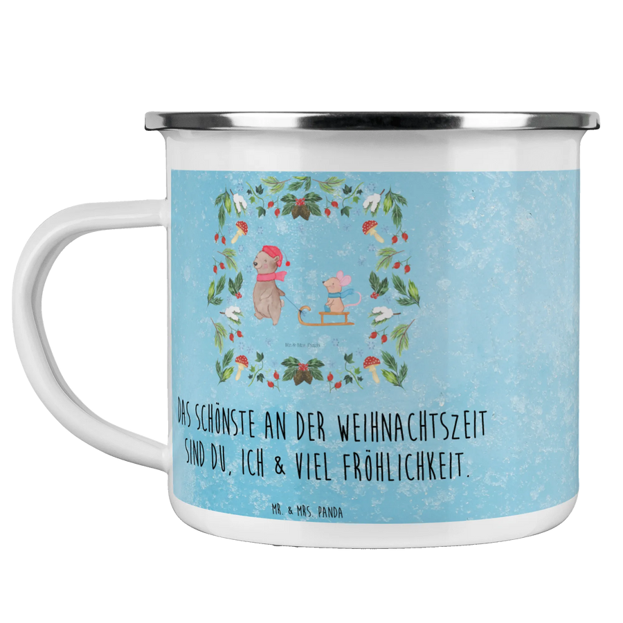 Kempingowy kubek emaliowany Niedźwiedź i Mysz sanie - z napisem - lodowoniebieski