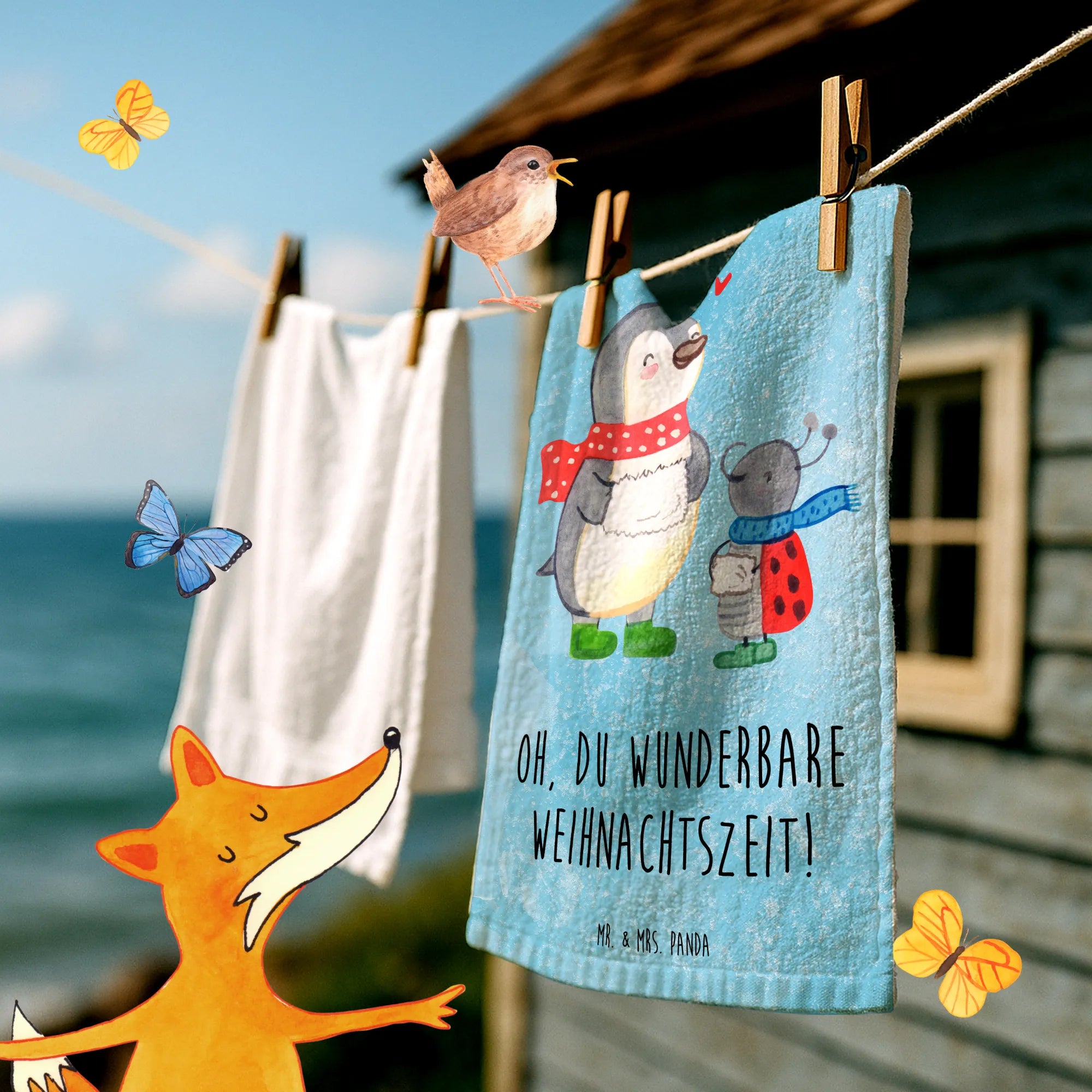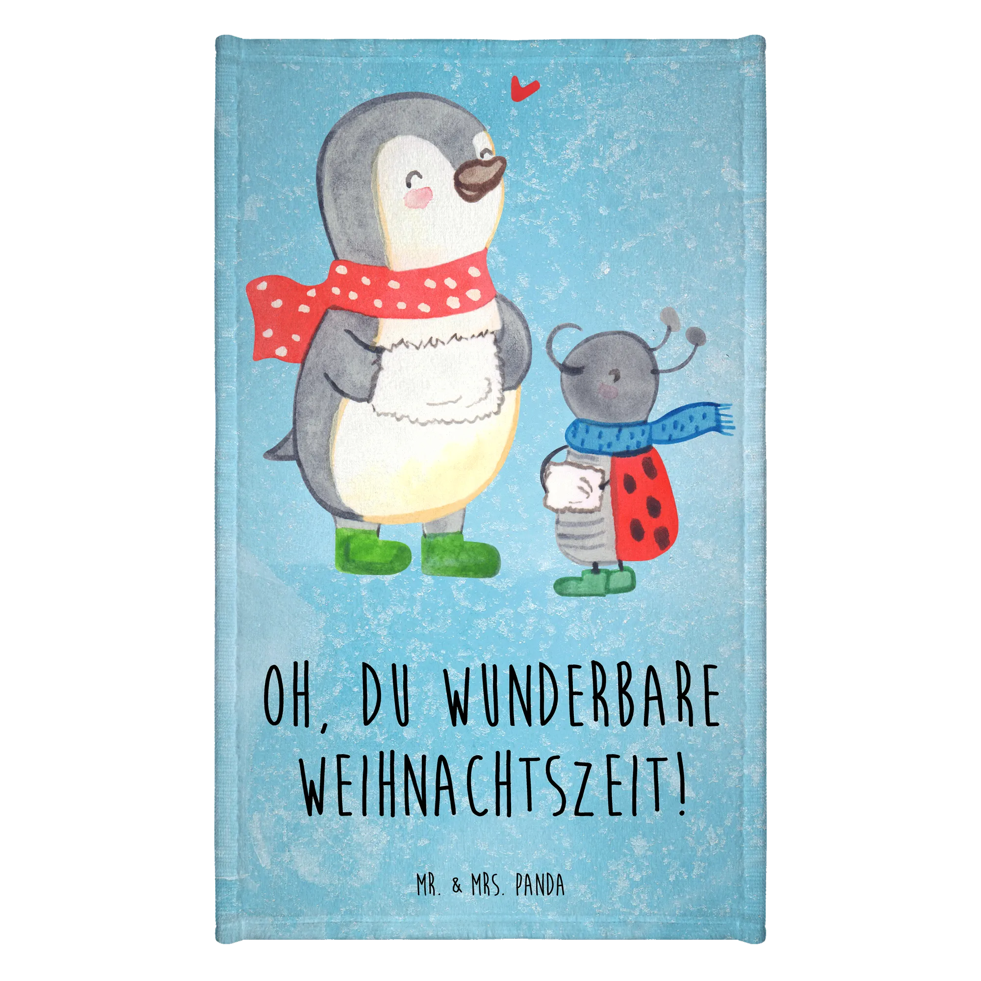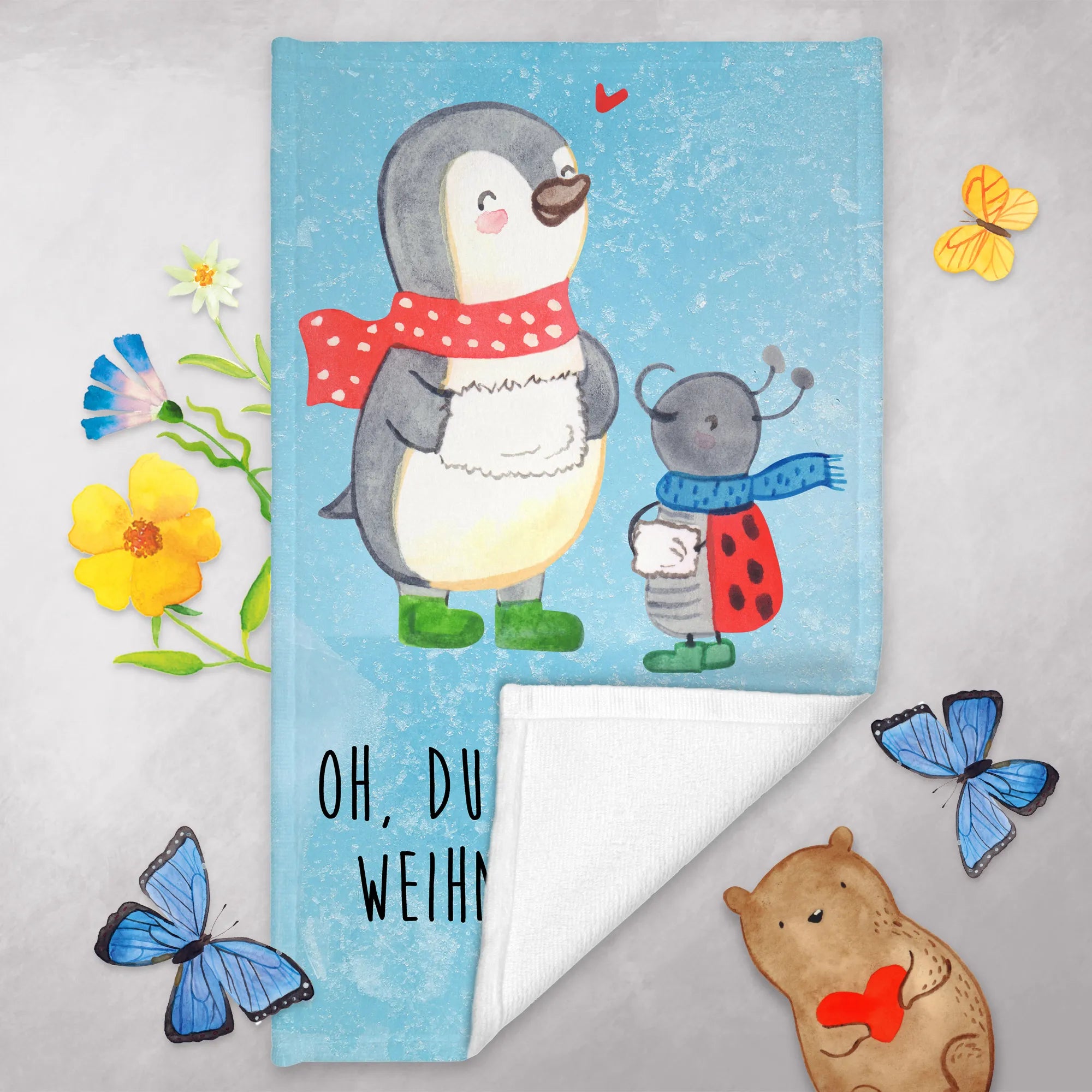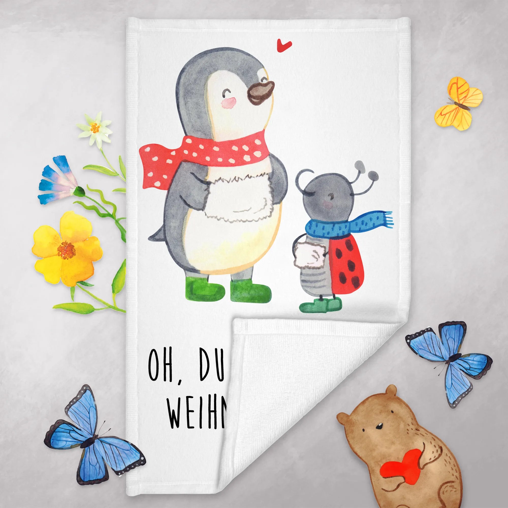 Das flauschige Handtuch misst 300 mm x 500 mm und ist aus einer hochwertigen Baumwollmischung gefertigt. Es ist besonders weich und sorgt dafür, dass sich deine Gäste rundum wohlfühlen. Das fröhliche Motiv zeigt einen Pinguin in grünen Stiefeln und seinen kleinen Freund Smörle, der wie ein Marienkäfer aussieht. Diese beiden schicken Gesellen verbreiten Freude und die Magie der Winter- und Weihnachtszeit.