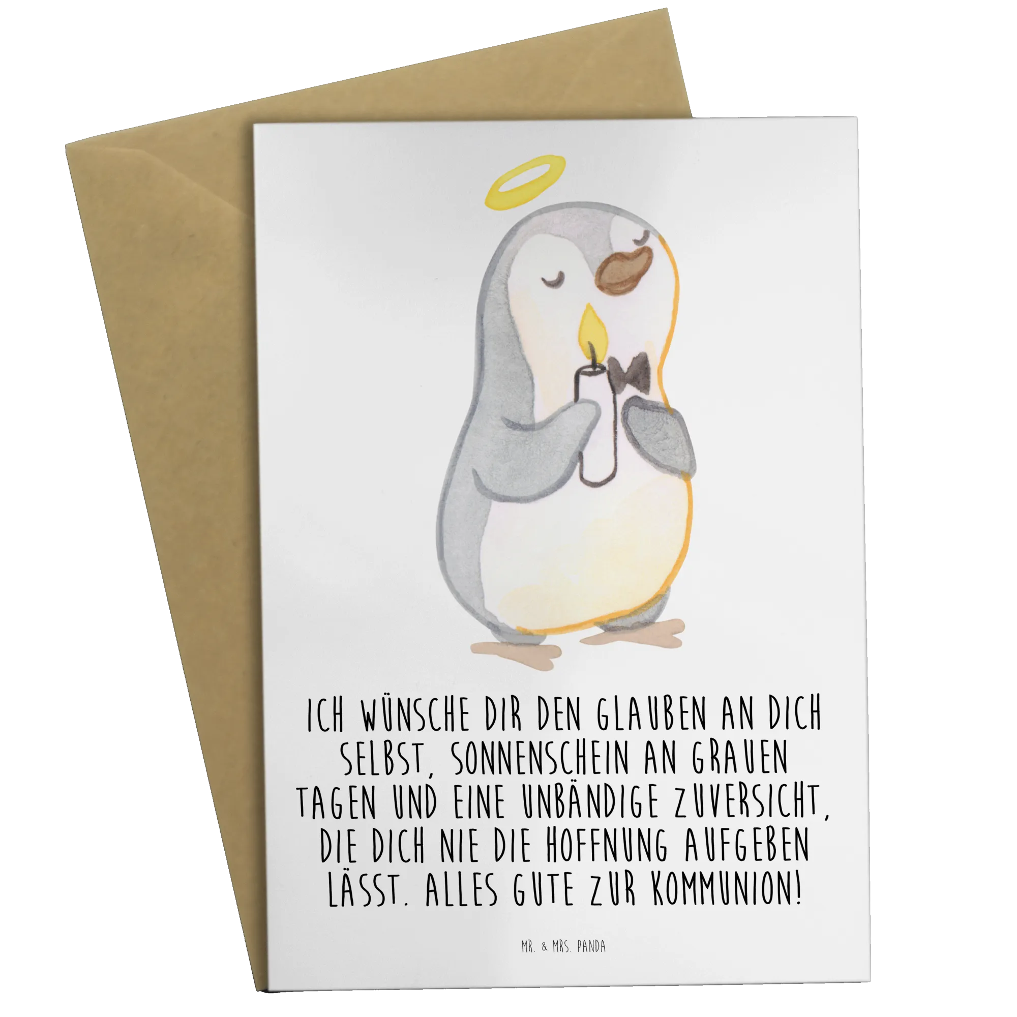 Die Grußkarte mit dem süßen Pinguin-Motiv zur Kommunion von Mr. & Mrs. Panda ist der perfekte Weg, um Freude und Liebe zu einem besonderen Anlass auszudrücken. Mit dem liebevoll gestalteten Motiv eines kleinen Pinguins, der stolz eine brennende Kerze in der Hand hält und einen Heiligenschein trägt, bringt diese Karte ein Lächeln auf jedes Gesicht. Egal, ob du die Karte für die eigene Kommunion auswählst oder sie als Geschenk für ein Kind in deinem Freundes- oder Familienkreis besorgst, sie wird sicherlich ein Hit sein!