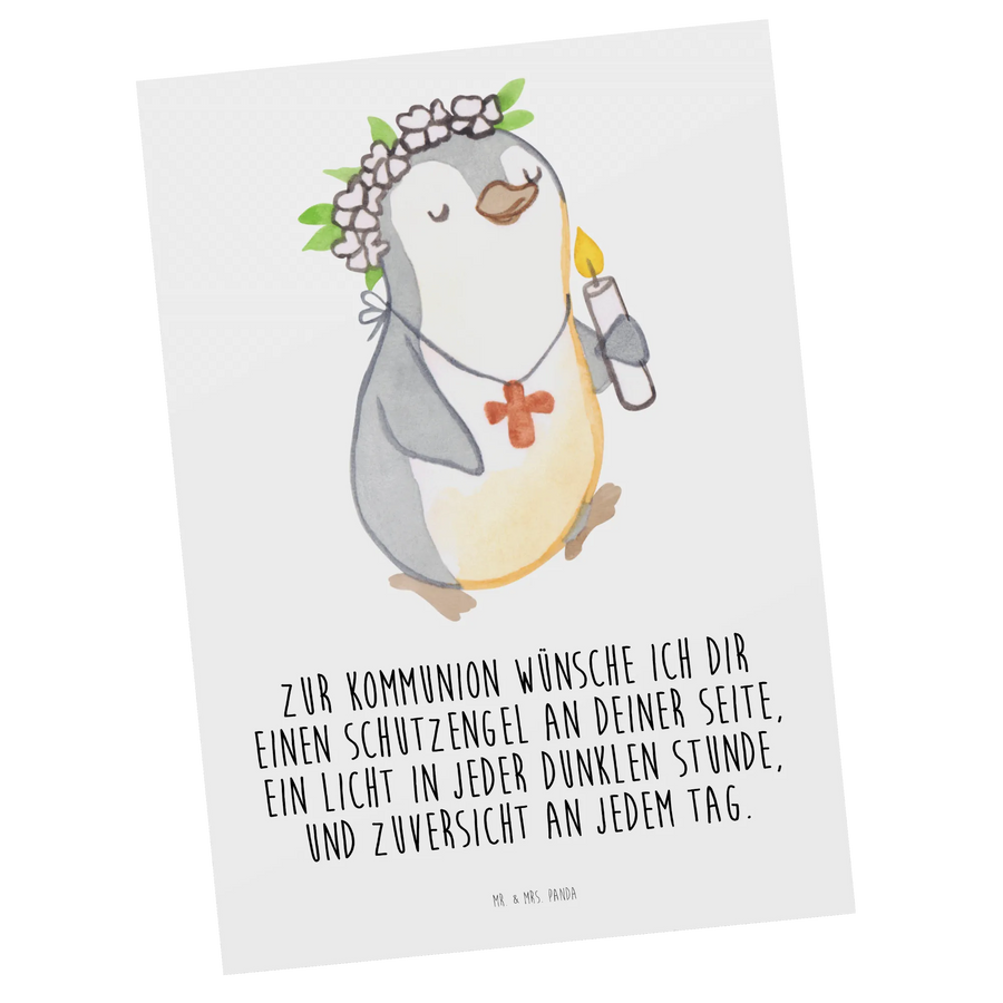 Diese bezaubernde Postkarte mit dem süßen Pinguin Mädchen ist das perfekte Geschenk für die Kommunion oder Konfirmation. Sie wurde liebevoll von Mr. & Mrs. Panda entworfen und zeigt ein strahlendes Pinguin Mädchen mit Blumen im Haar, einer Halskette mit einem Kreuz und einer Kerze in der Hand.