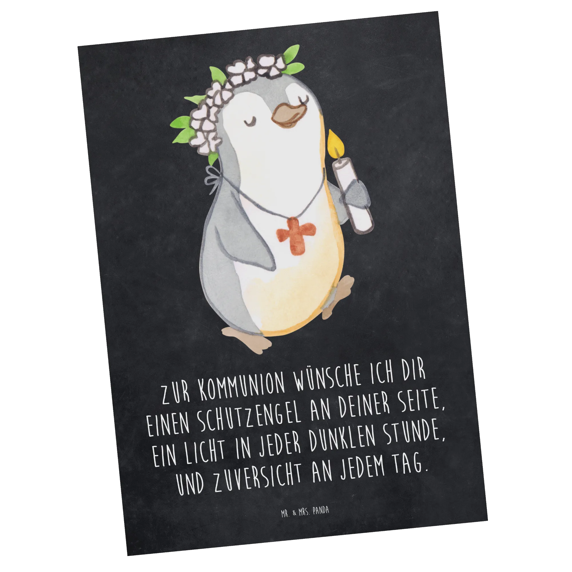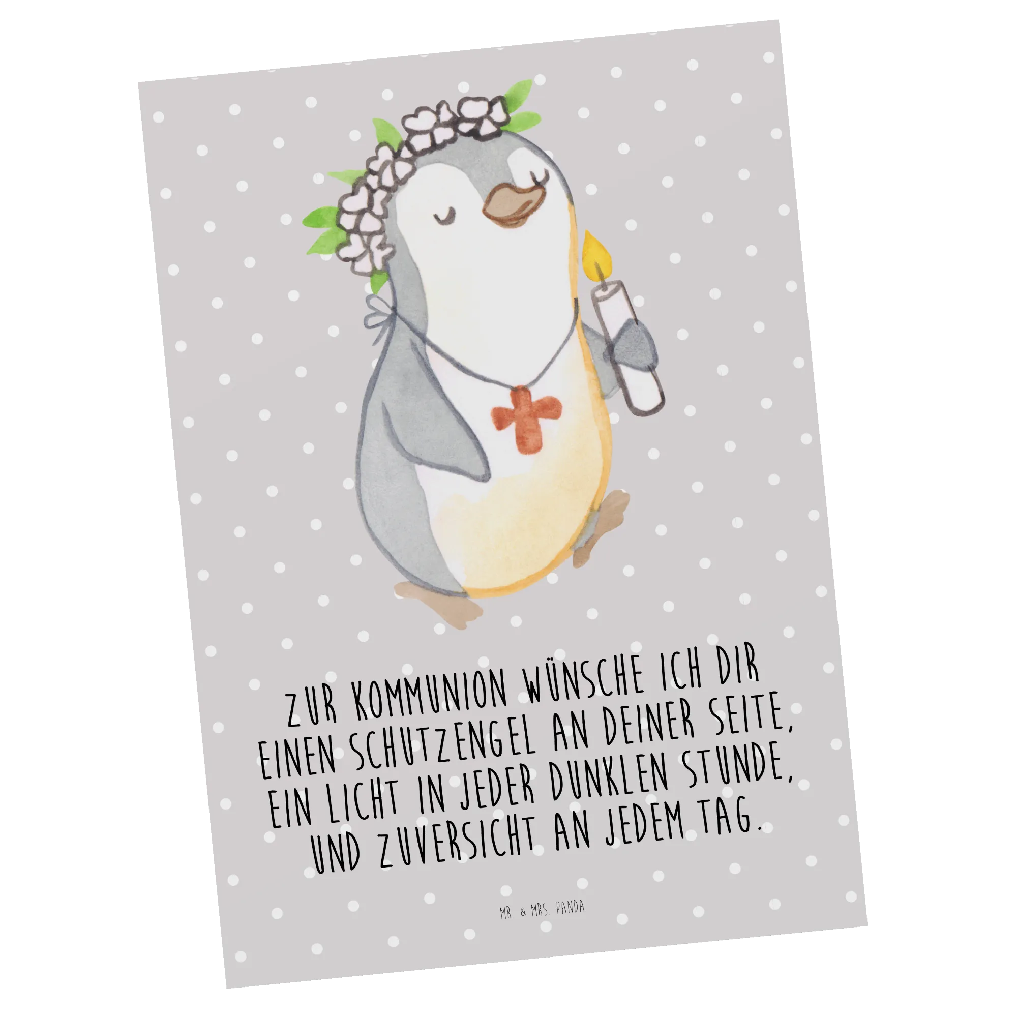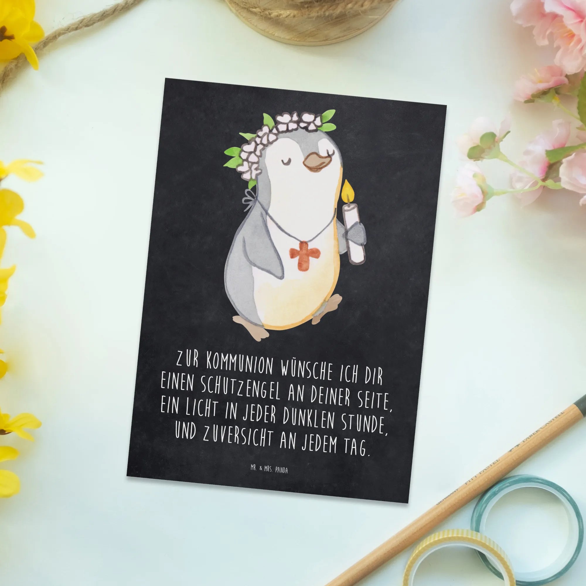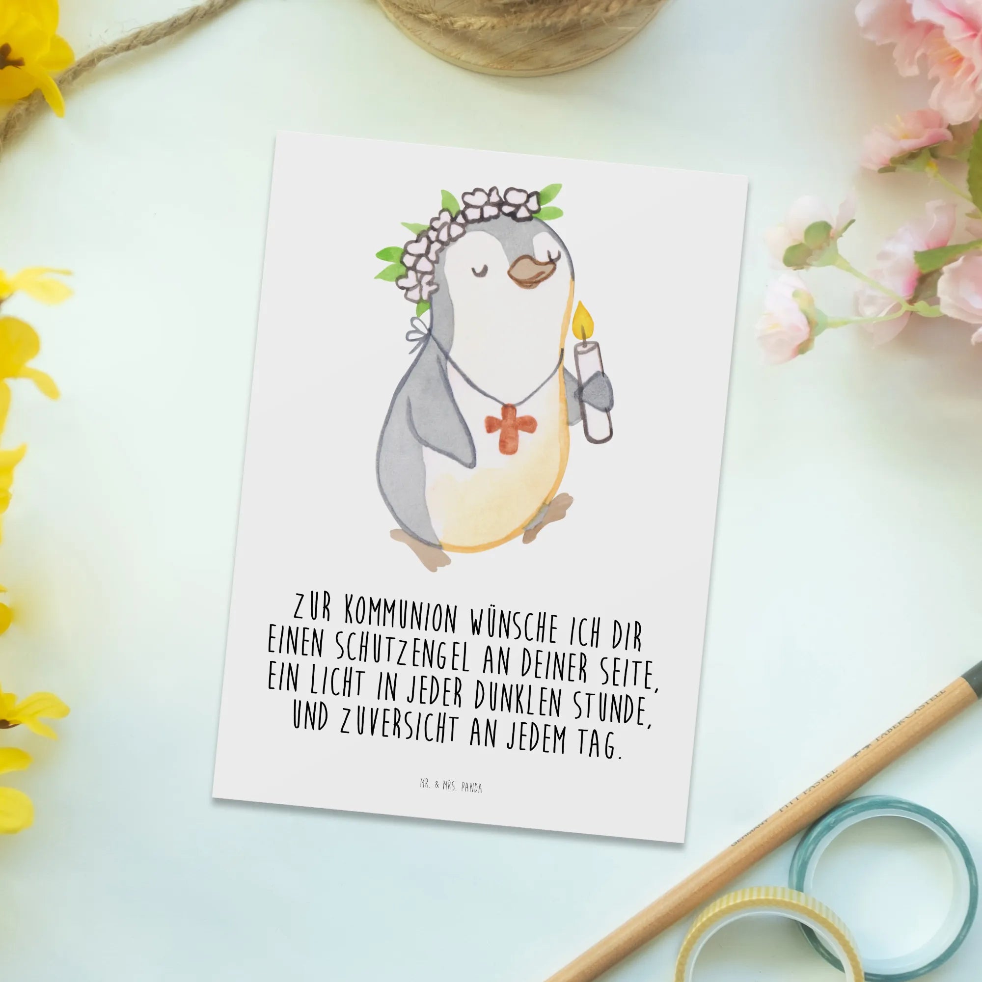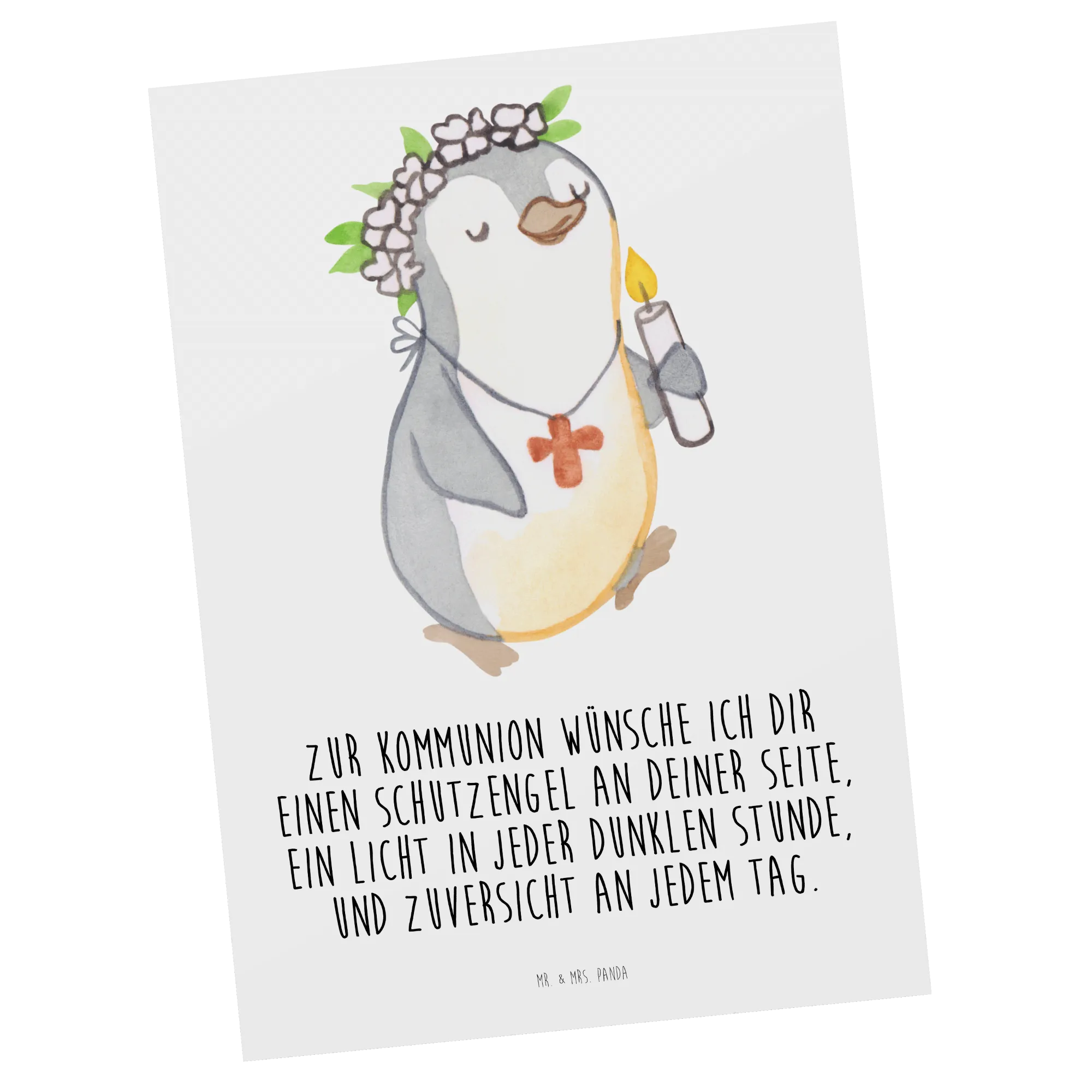 Diese bezaubernde Postkarte mit dem süßen Pinguin Mädchen ist das perfekte Geschenk für die Kommunion oder Konfirmation. Sie wurde liebevoll von Mr. & Mrs. Panda entworfen und zeigt ein strahlendes Pinguin Mädchen mit Blumen im Haar, einer Halskette mit einem Kreuz und einer Kerze in der Hand.