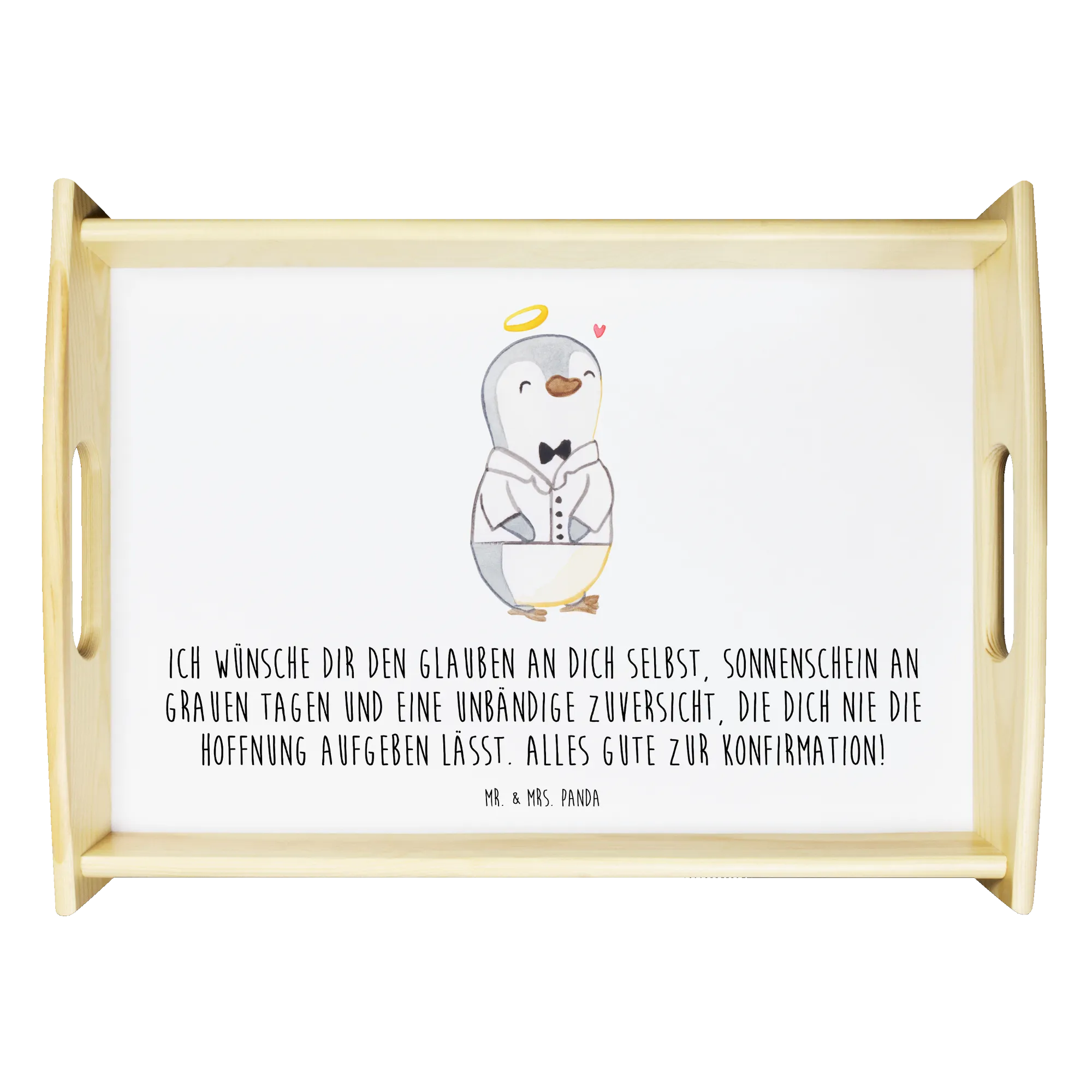 Ein liebevolles Geschenk zur Konfirmation: Das Serviertablett „Pinguin Konfirmation Hemd“ von Mr. & Mrs. Panda vereint eine zarte Aquarell-Illustration mit einem tröstenden Spruch und praktischem Nutzen. Ein kleiner Pinguin im weißen Hemd, mit Heiligenschein, strahlt Ruhe und Herzlichkeit aus. Der mitgedruckte Text lautet: „Ich wünsche dir den Glauben an dich selbst, Sonnenschein an grauen Tagen und eine unbändige Zuversicht, die dich nie die Hoffnung aufgeben lässt. Alles Gute zur Konfirmation!“