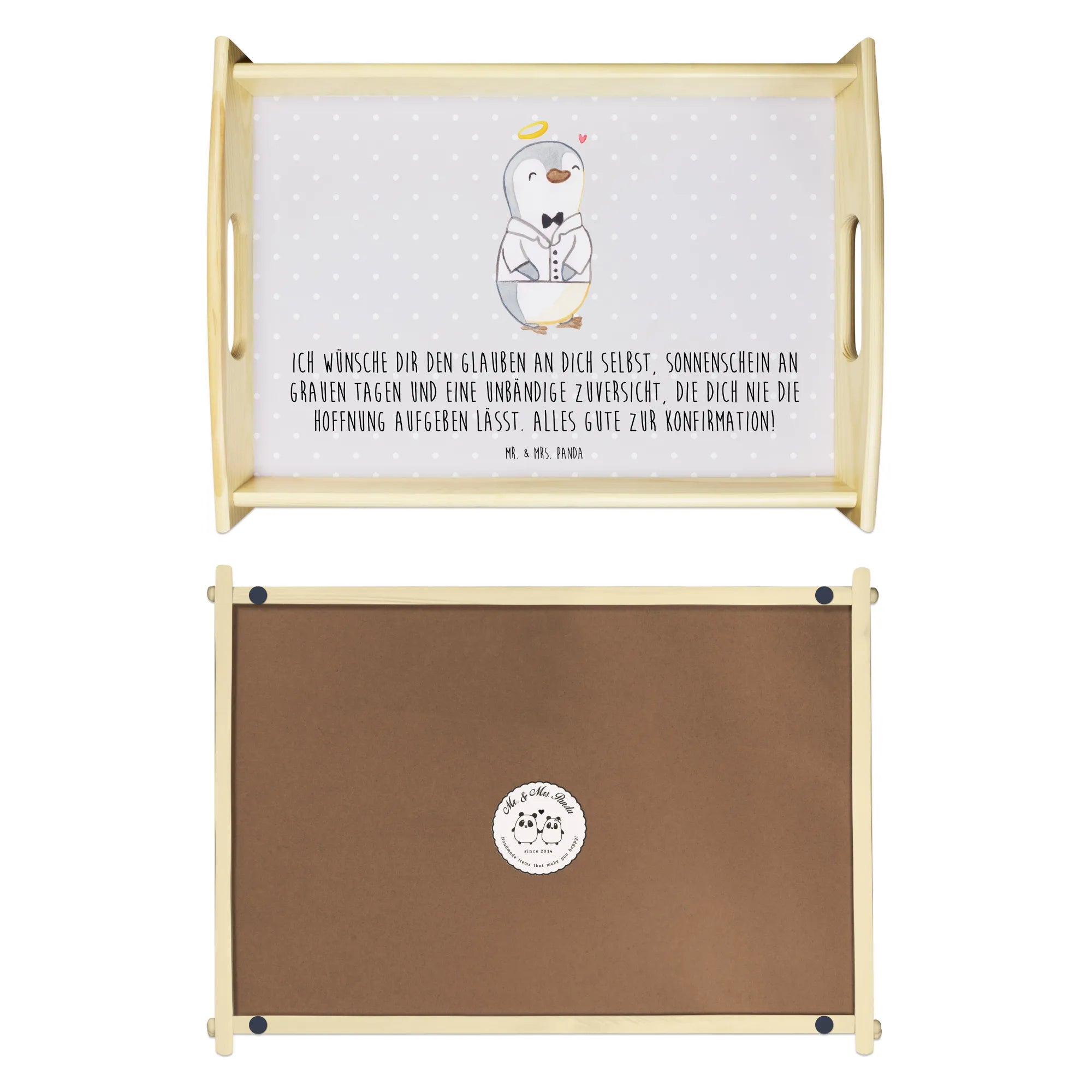 Ein liebevoll gestaltetes Erinnerungsstück: Aus der Kollektion Konfirmation & Kommunion von Mr. & Mrs. Panda stammend, ist dieses Tablett ein kleines Kunstwerk, das Vertrauen, Hoffnung, Sonnenschein und Zuversicht in einem praktischen Geschenk vereint. Hinweis: Aufgrund der aufwändigen Herstellung kann die Anfertigungszeit etwas länger sein – dafür hältst Du ein hochwertiges Unikat in den Händen.