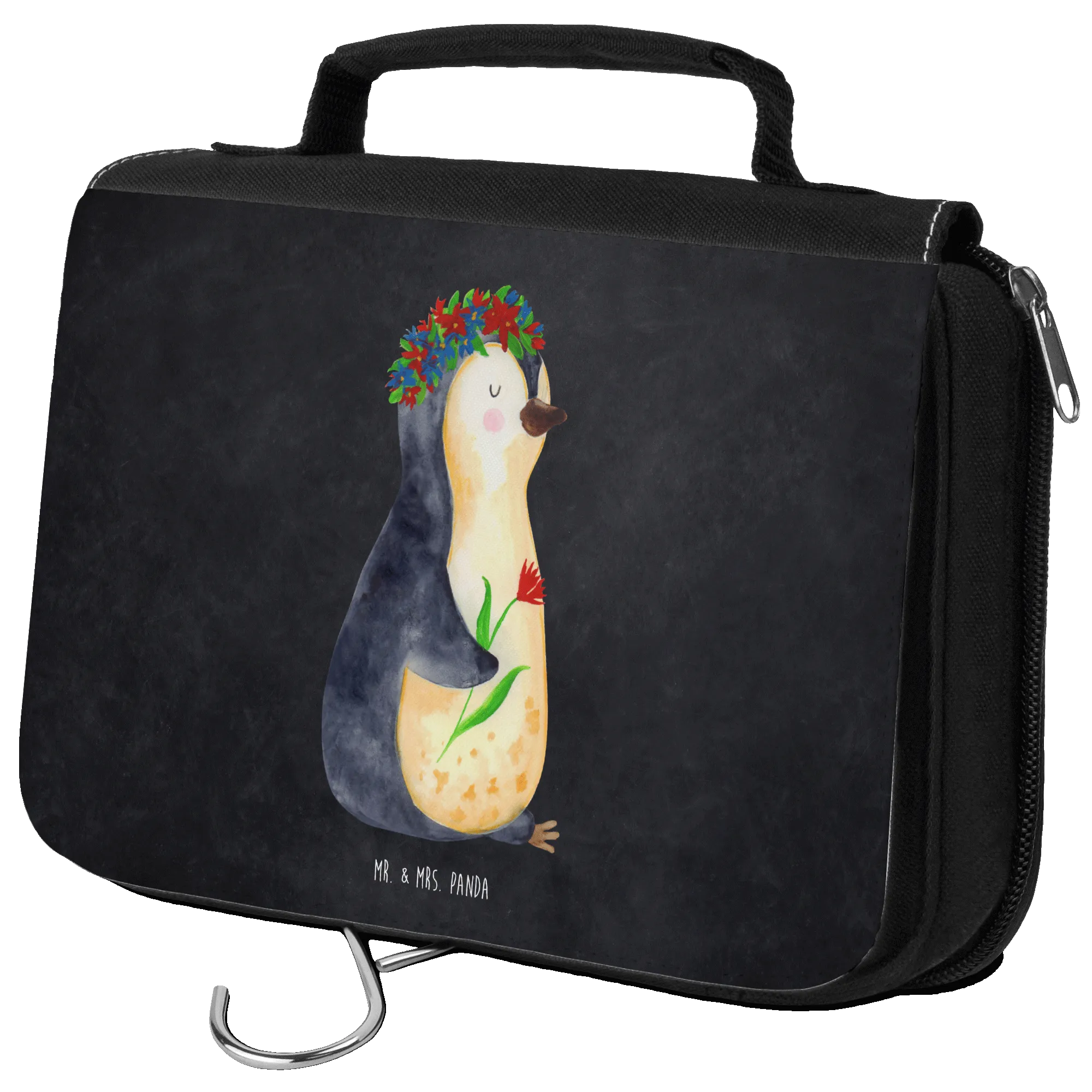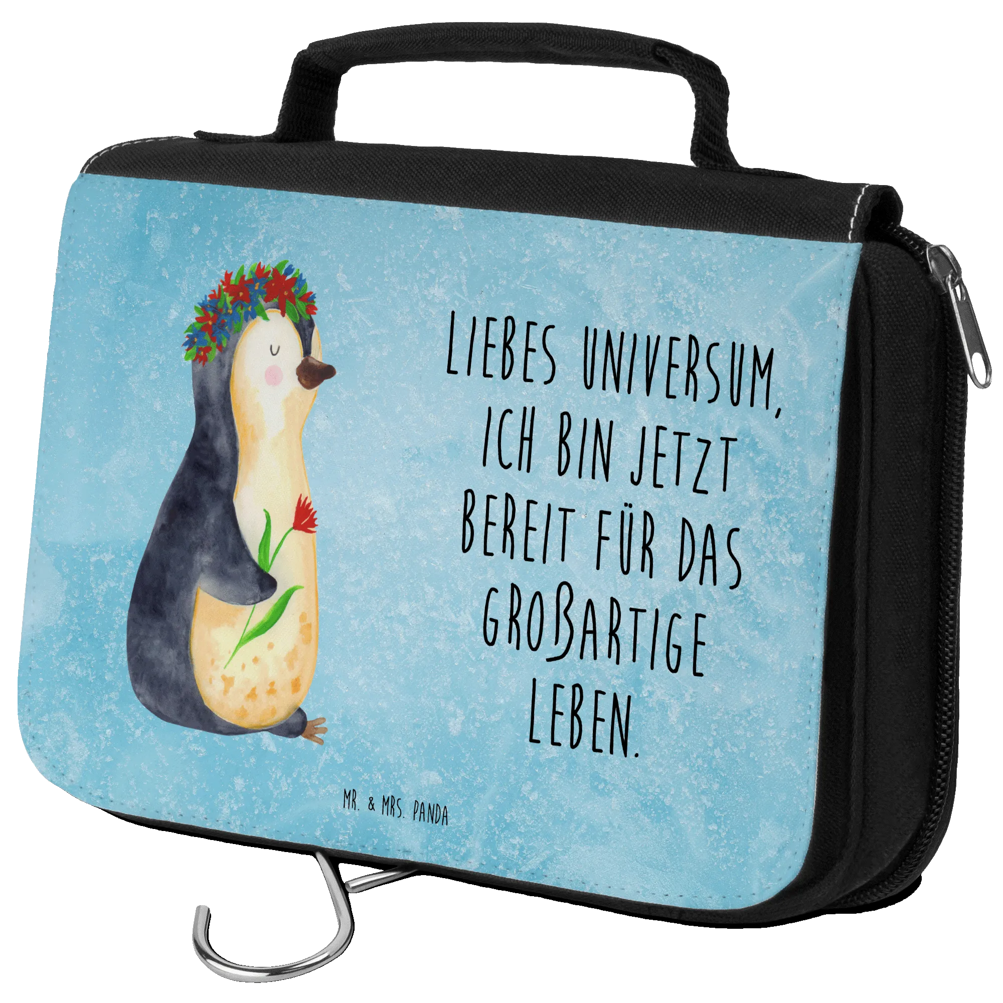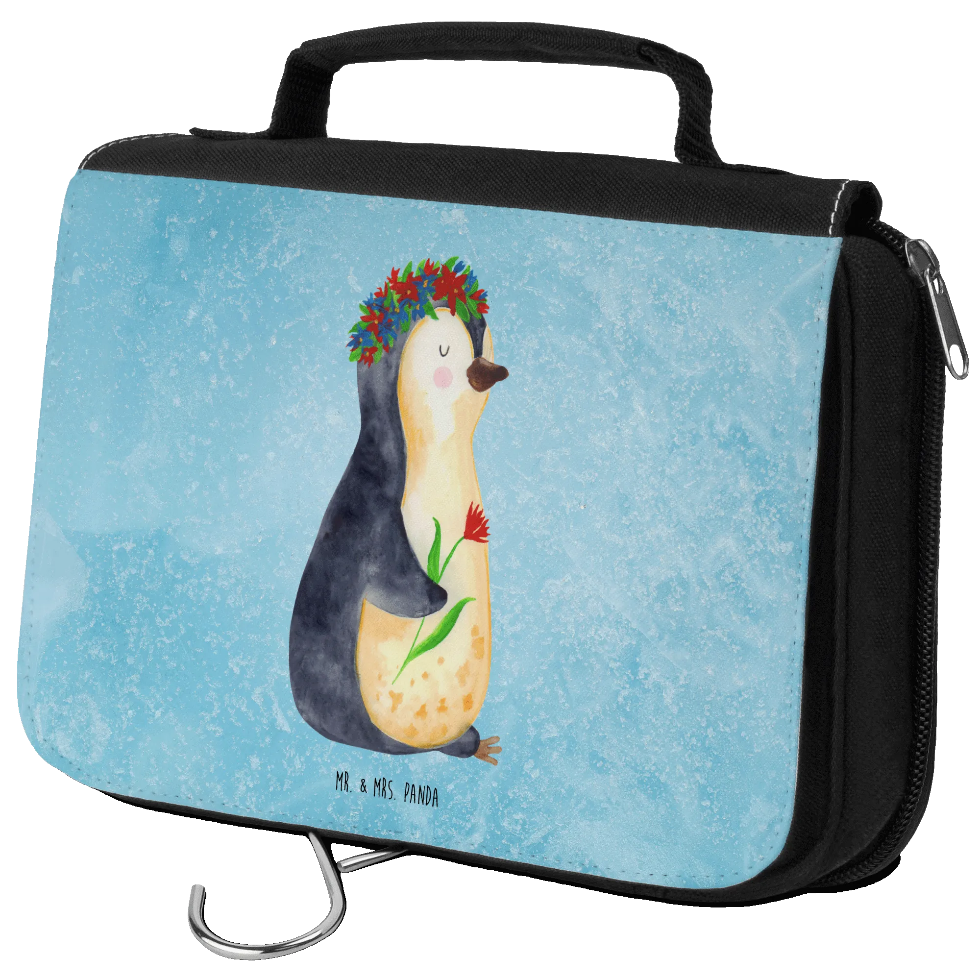 Kosmetyczka pingwin kwiaty - z napisem - lodowoniebieski