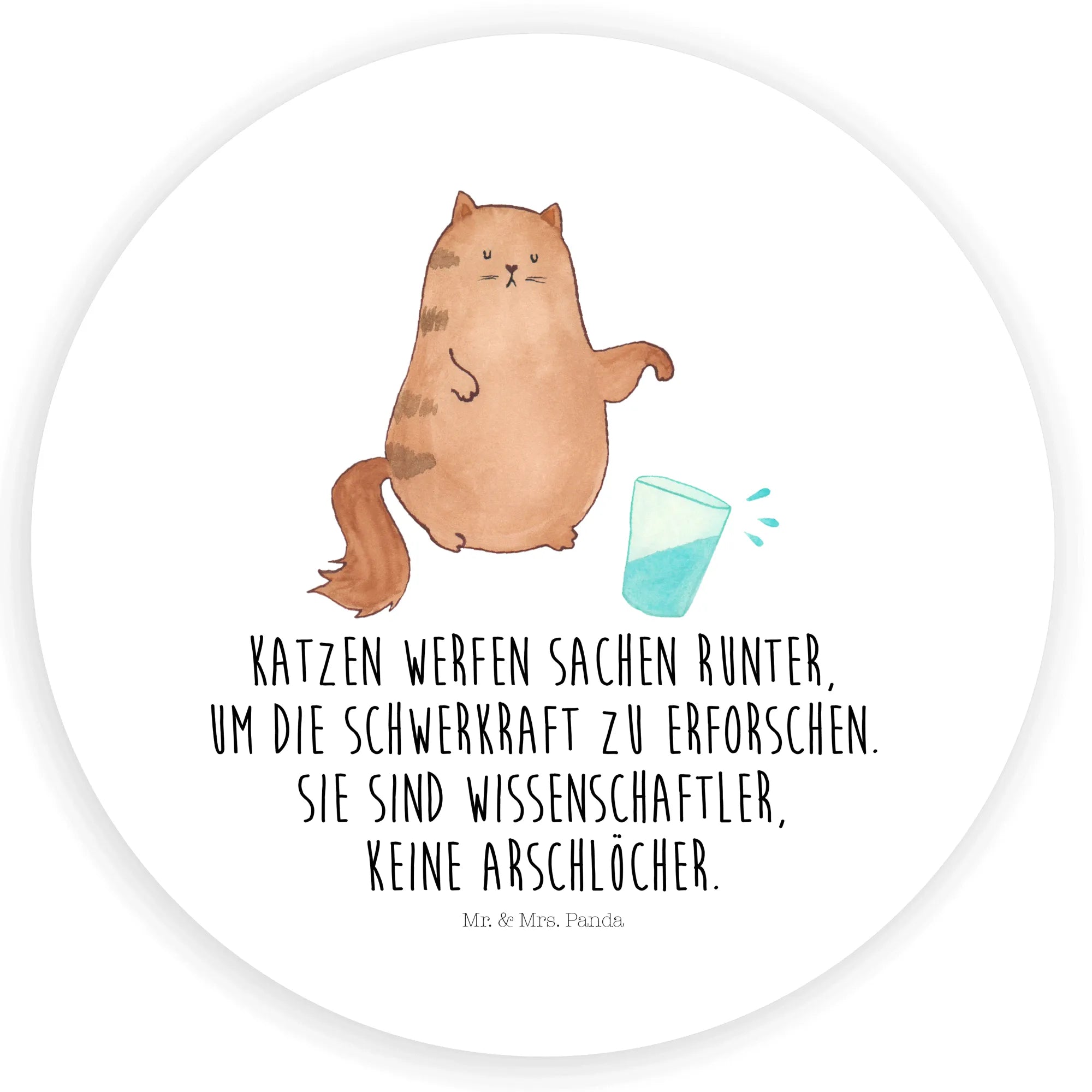 Unsere Katzen sind wie echte Katzen: frech, charmant und manchmal ein bisschen hintergründig. Der runde Aufkleber „Katze Wasserglas“ zeigt eine kleine, freche Mietze, die gerade ein Wasserglas umstößt – ein typisches Katzenmanöver, das jeder Katzenhalter kennt. Dazu der freche Spruch: „Katzen werfen Sachen runter, um die Schwerkraft zu erforschen. Sie sind Wissenschaftler, keine Arschlöcher.“ Ein Statement mit Augenzwinkern, das gut gelaunte Lacher garantiert.