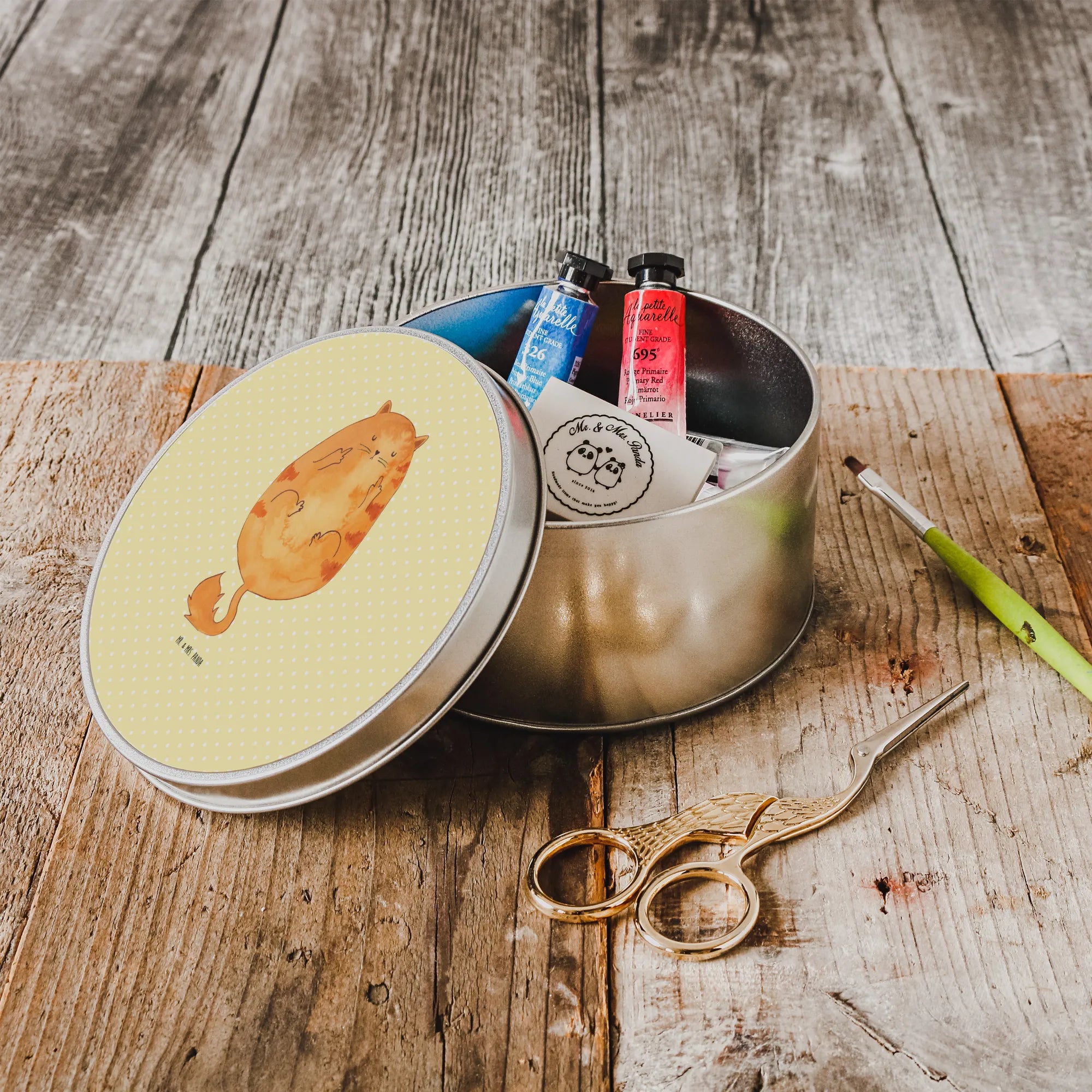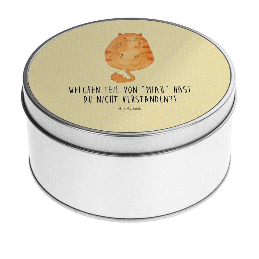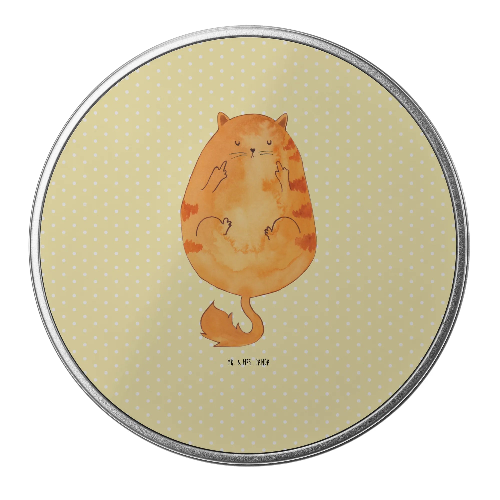 okrągła puszka z blachy kot środkowy palec - z napisem