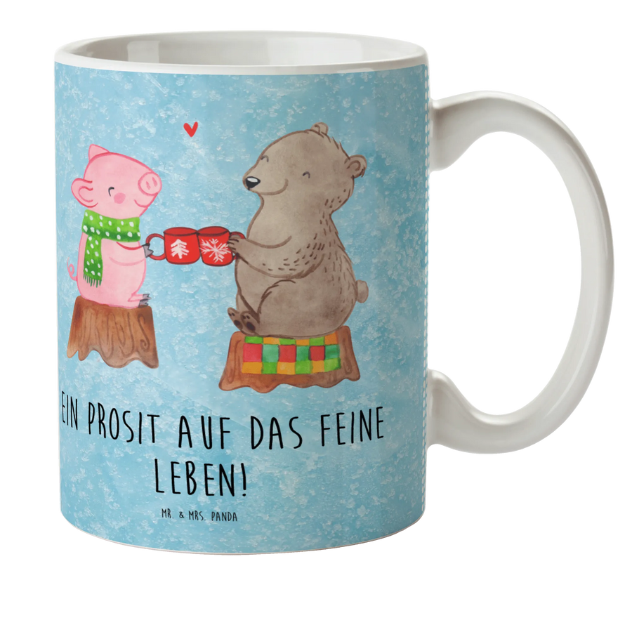 Das liebevoll gestaltete Motiv zeigt ein niedliches Schweinchen mit einem Schal und einen Bären, die sich mit einer Tasse zuprosten - eine herzliche Geste, die den Geist der Weihnacht widerspiegelt. Der Slogan "Ein Prosit auf das feine Leben!" ermuntert nicht nur zum Feiern, sondern ist auch eine wunderbare Erinnerung an die schönen Momente im Leben.