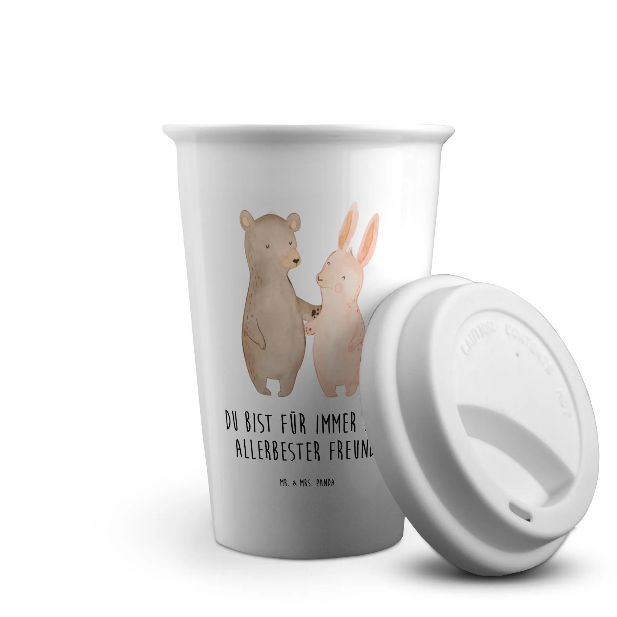 Der Mr. & Mrs. Panda To Go Becher mit dem liebevollen Motiv "Bär Hase Umarmen" ist das ideale Geschenk für alle, die ihre Getränke stilvoll und warm mitnehmen möchten. Ob für den besten Freund, die Freundin oder den Ehepartner - dieser Becher bringt nicht nur Freude, sondern auch eine persönliche Note in den Alltag. Der Slogan "Du bist für immer mein allerbester Freund!" verleiht dem Becher eine besondere Bedeutung und macht ihn zu einem perfekten Liebesgeschenk. Ob zum Jahrestag, zur Verlobung oder einfach zwischendurch – dieser hochwertige Thermobecher aus doppelwandiger Keramik hält Dein Getränk länger heiß und sorgt dafür, dass Du Deinen Kaffee to go in vollen Zügen genießen kannst.