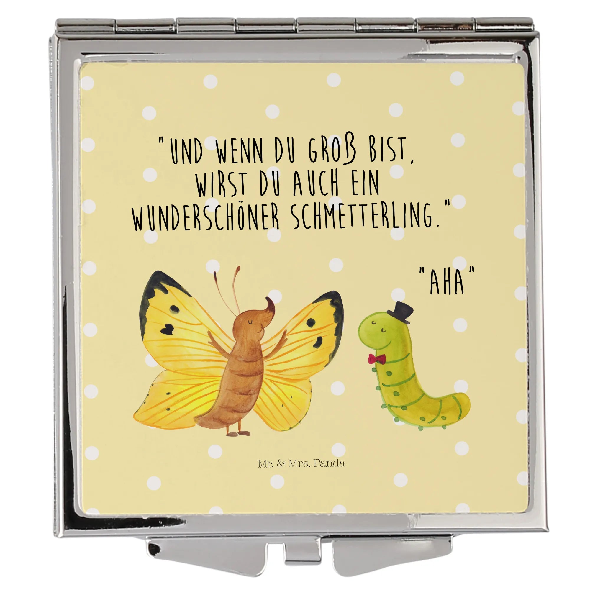 Ein liebevoller Begleiter für unterwegs: Der quadratische Handtaschenspiegel von Mr. & Mrs. Panda aus der Small World Kollektion vereint Funktionalität und Herz. Das Motiv Raupe & Schmetterling erzählt von Veränderung und Zuversicht und wird von dem charmanten Spruch „Und wenn du groß bist, wirst du auch ein wunderschöner Schmetterling.“ „Aha.“ begleitet.