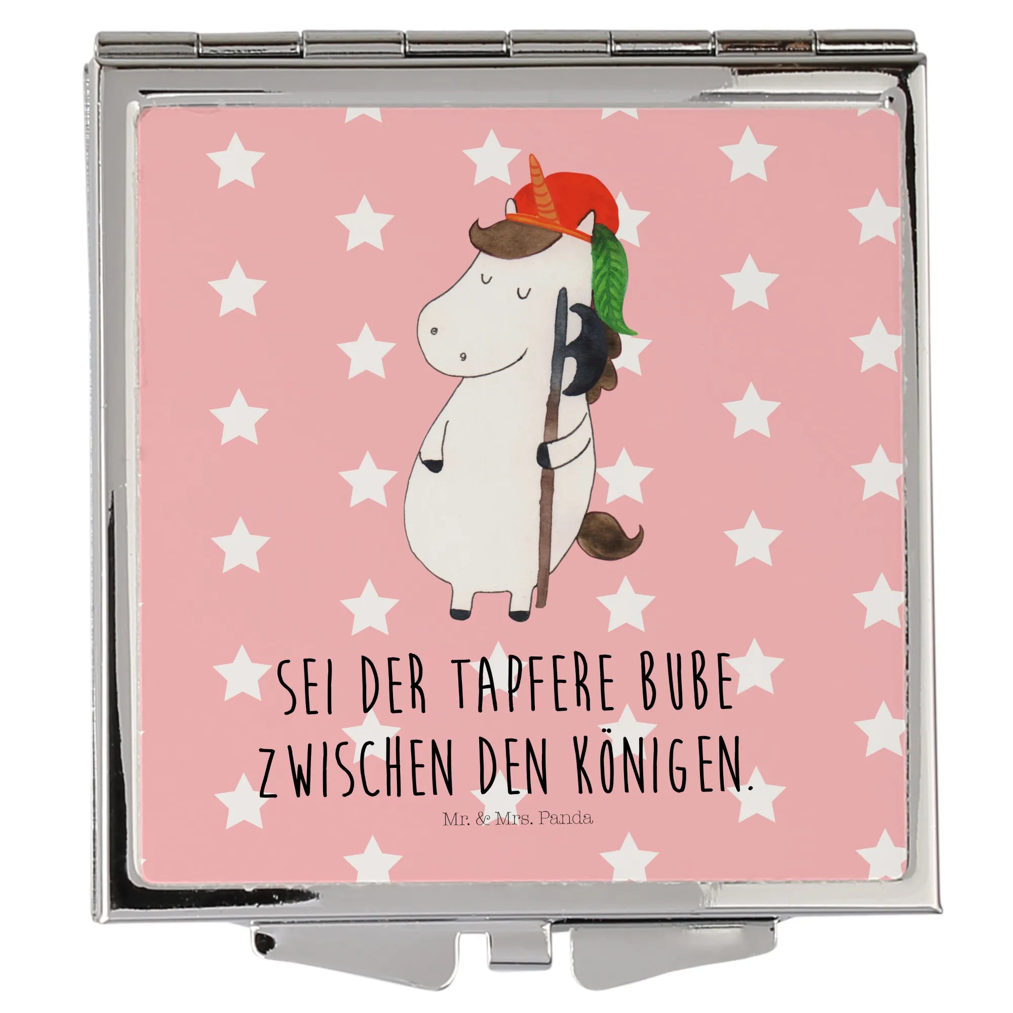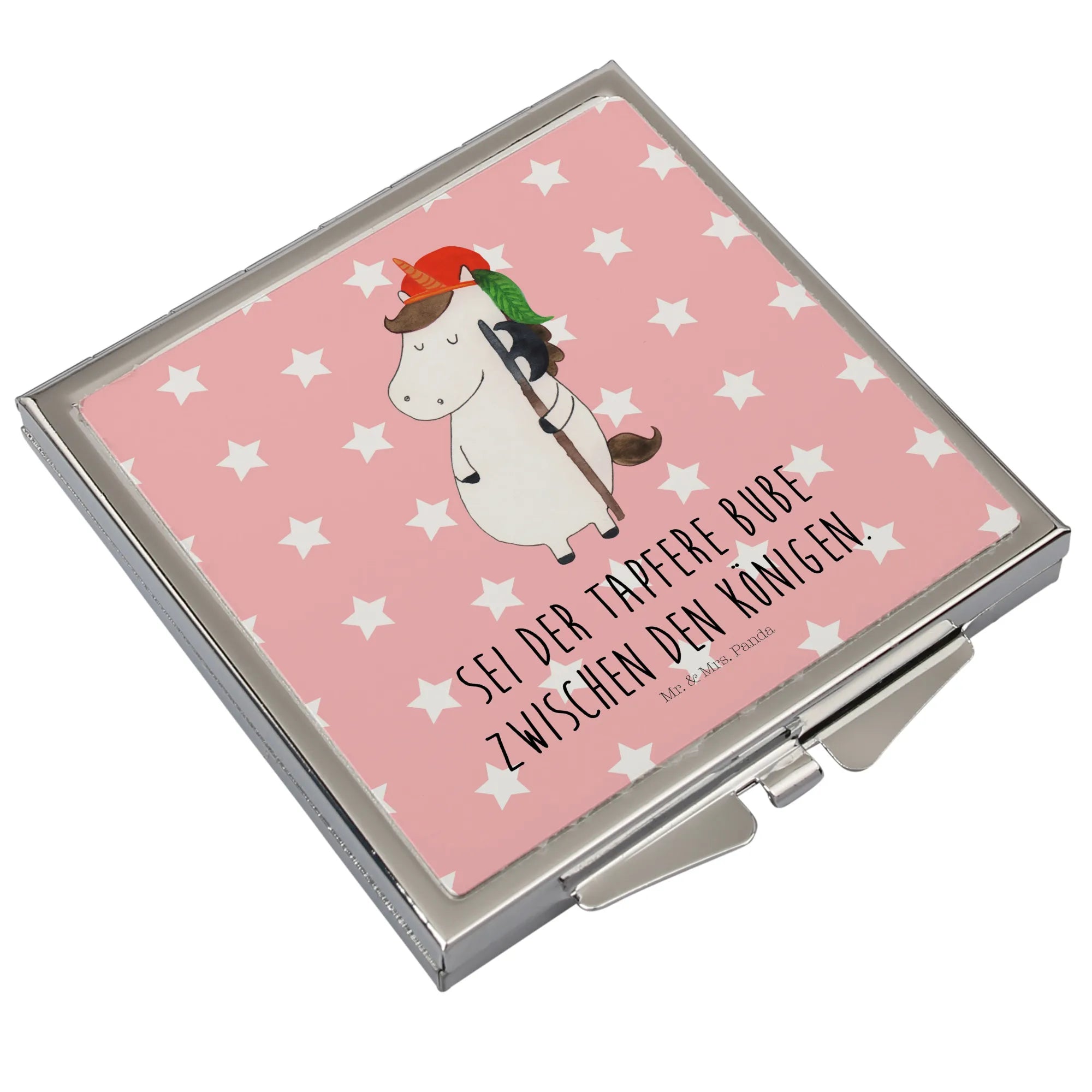 Kleines Glück für Deine Tasche: Du liebst Einhörner? Dann wirst Du unseren Handtaschenspiegel quadratisch Einhorn Bube von Mr. & Mrs. Panda lieben. Dieser kompakte Klappspiegel vereint zauberhaftes Design mit praktischer Funktion – ideal als Schminkspiegel To Go oder Reise Spiegel.