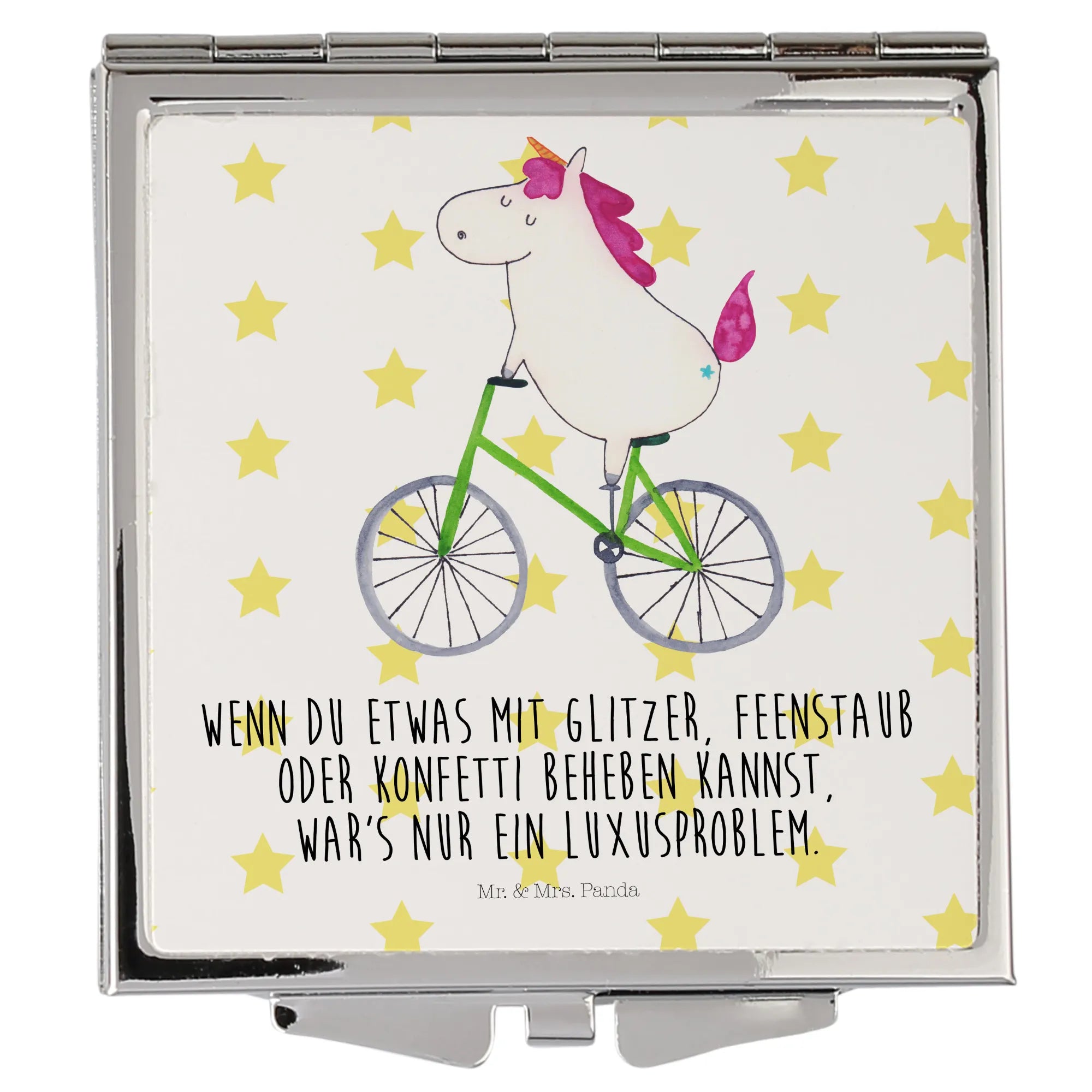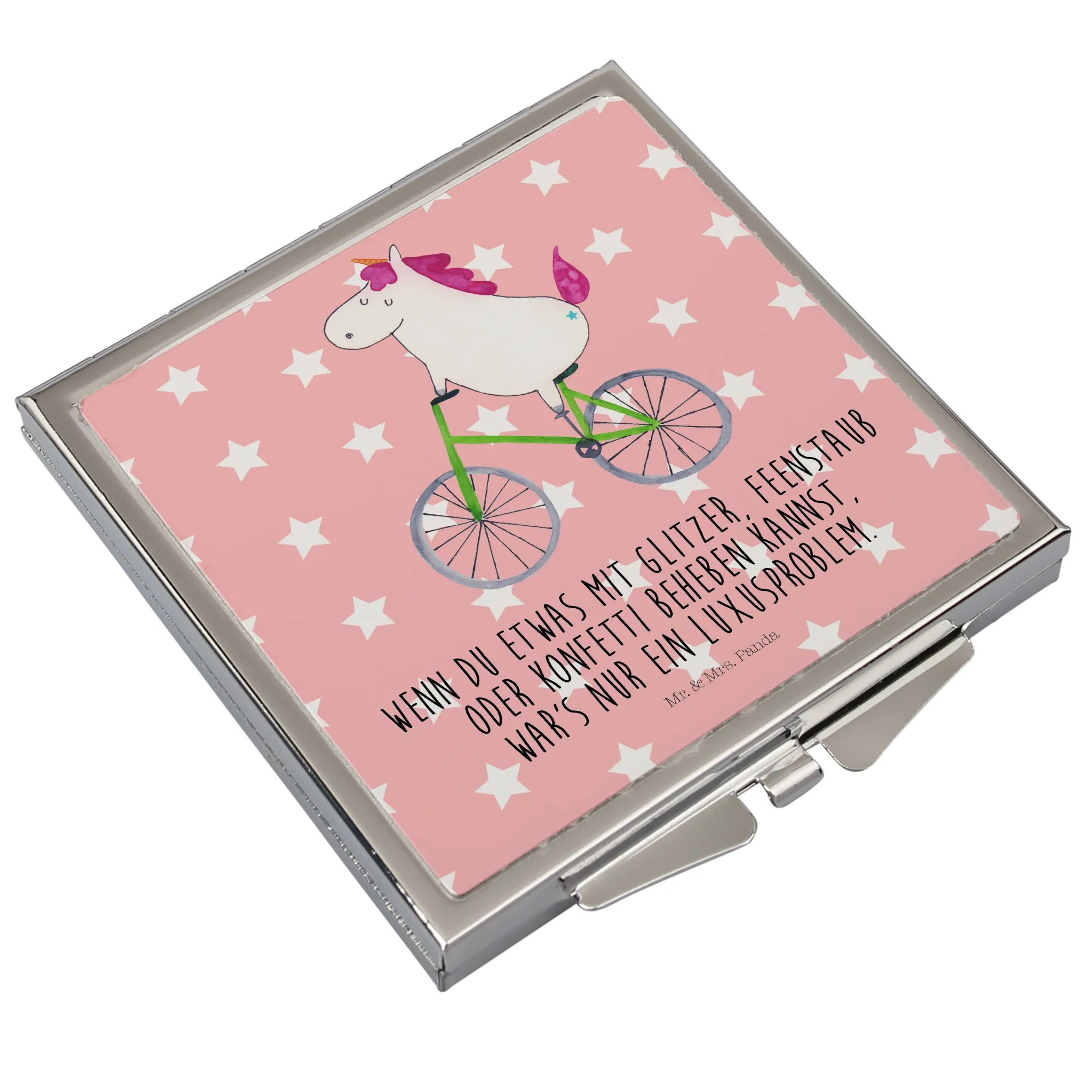 Zauberhaft, praktisch und immer dabei: Der quadratische Handtaschenspiegel von Mr. & Mrs. Panda mit dem fröhlichen Einhorn Radfahrer-Motiv ist das perfekte Accessoire für Einhorn-Liebhaberinnen und modebewusste Frauen, die einen kompakten Schminkspiegel für unterwegs suchen.