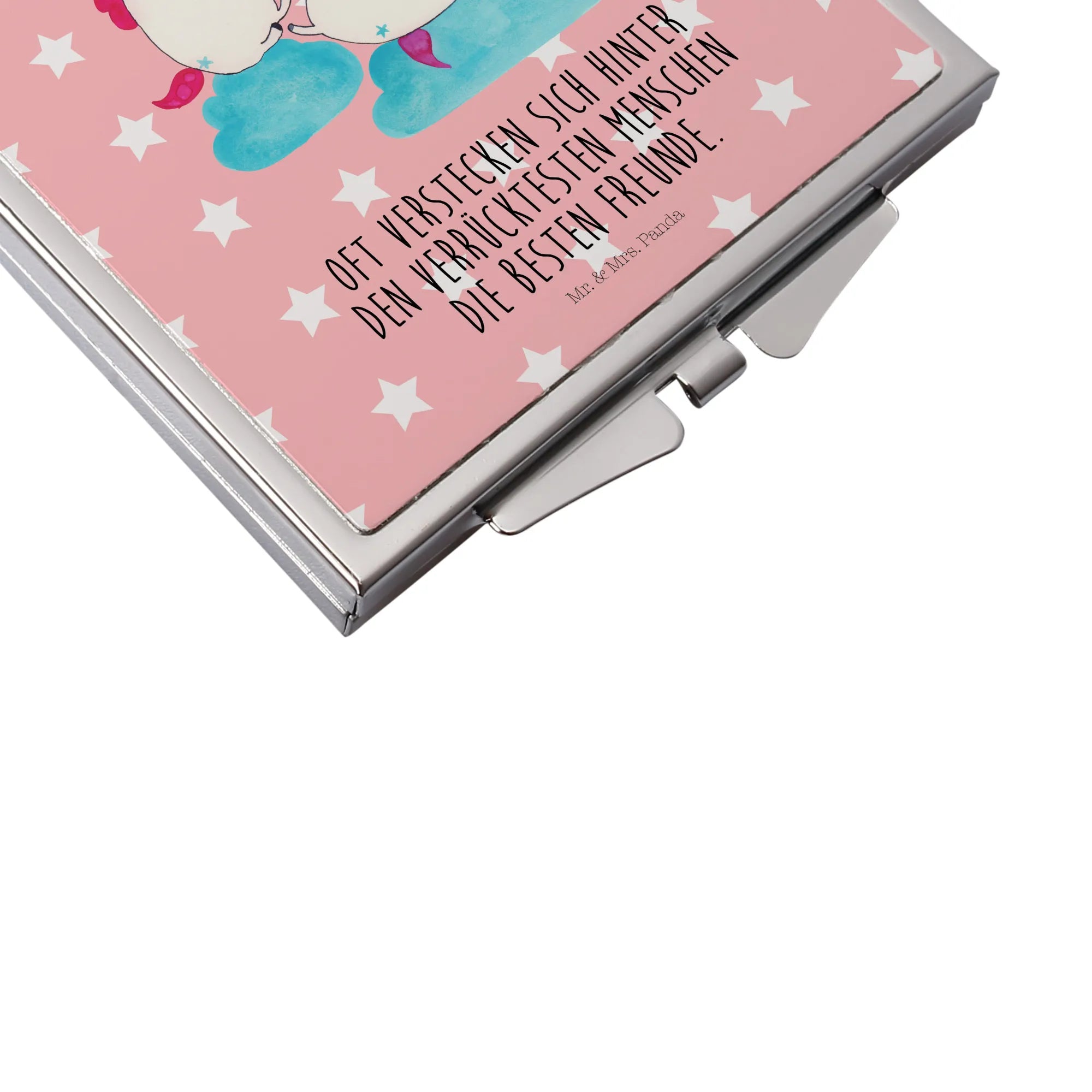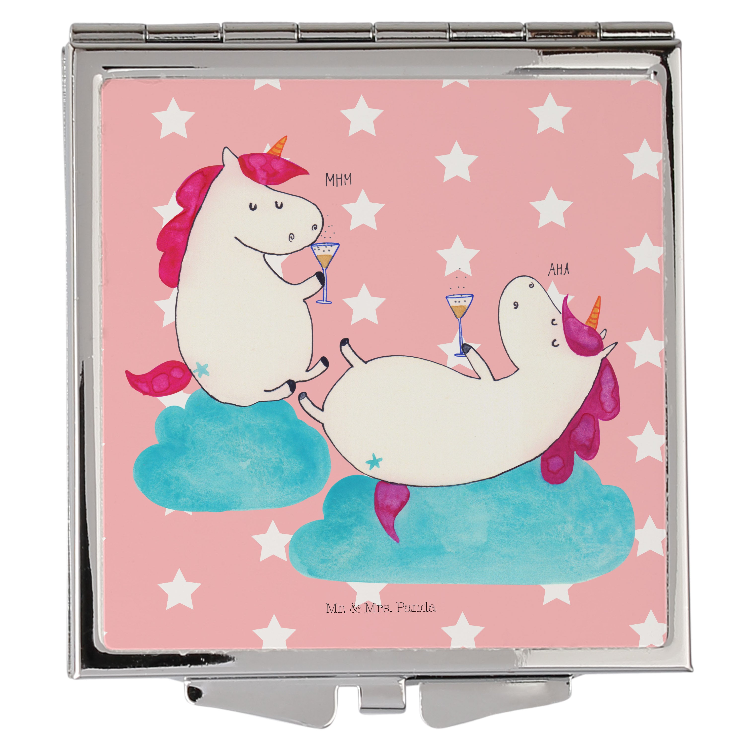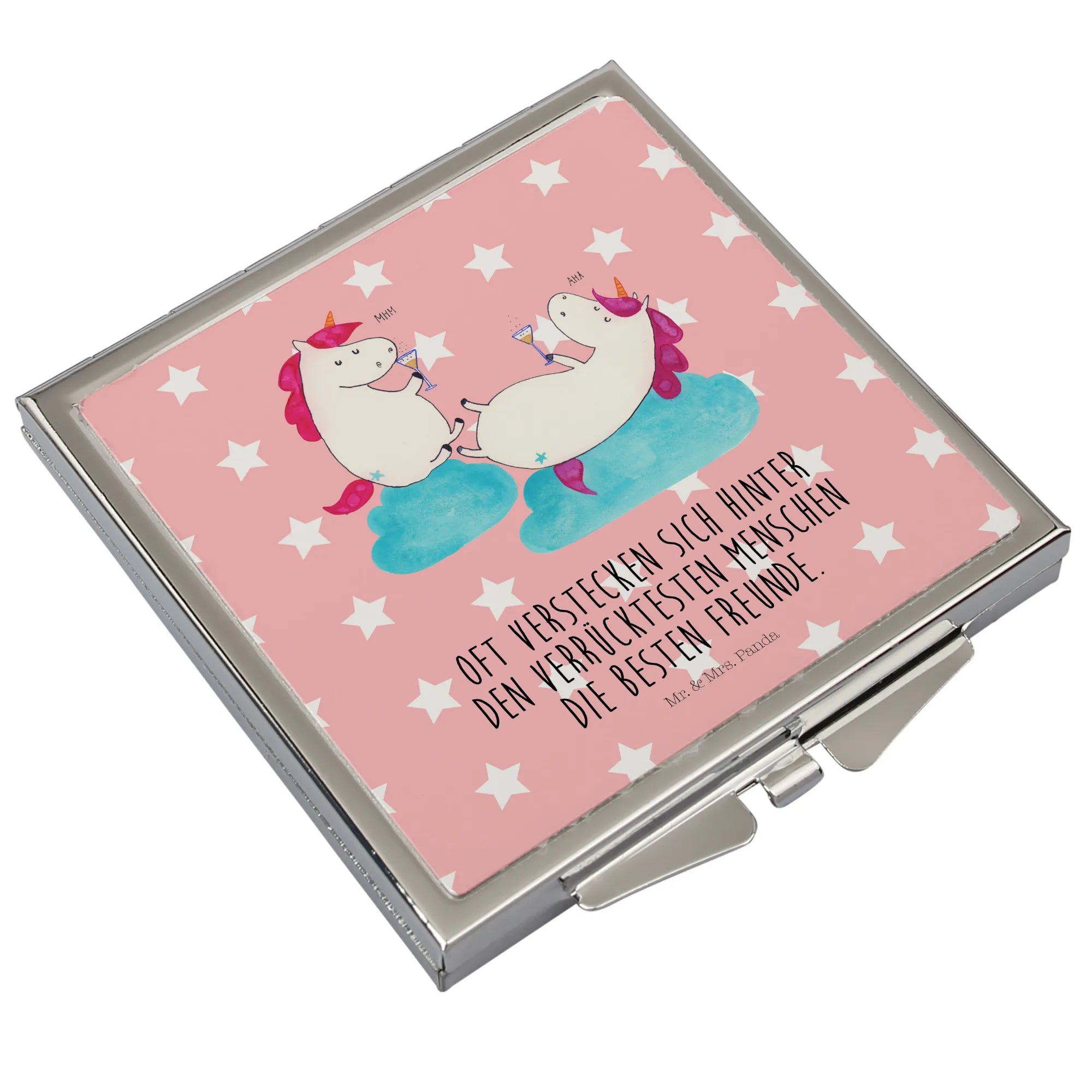 Ein kleiner Spiegel, große Freude: Der quadratische Handtaschenspiegel „Einhörner Sekt“ von Mr. & Mrs. Panda bringt Glitzer, Spaß und praktische Funktion in Deinen Alltag. Zwei Einhörner, die gemeinsam Sekt schlürfen, zieren die Vorderseite und machen ihn zum perfekten Begleiter für Mädelsabend, Party oder als Geschenk für die beste Freundin.