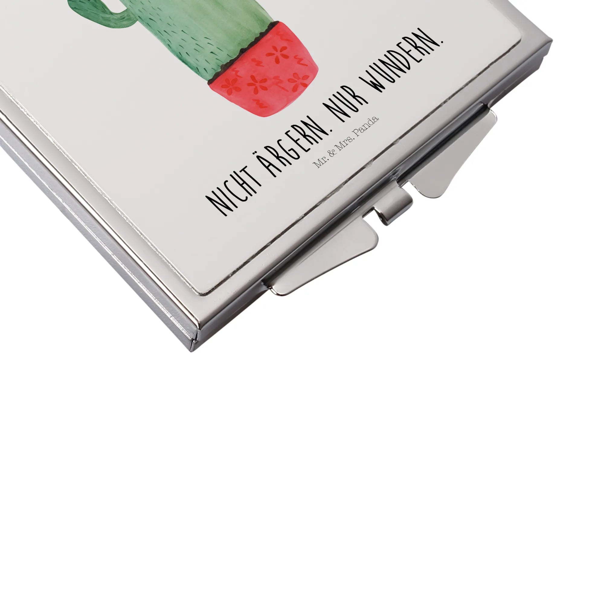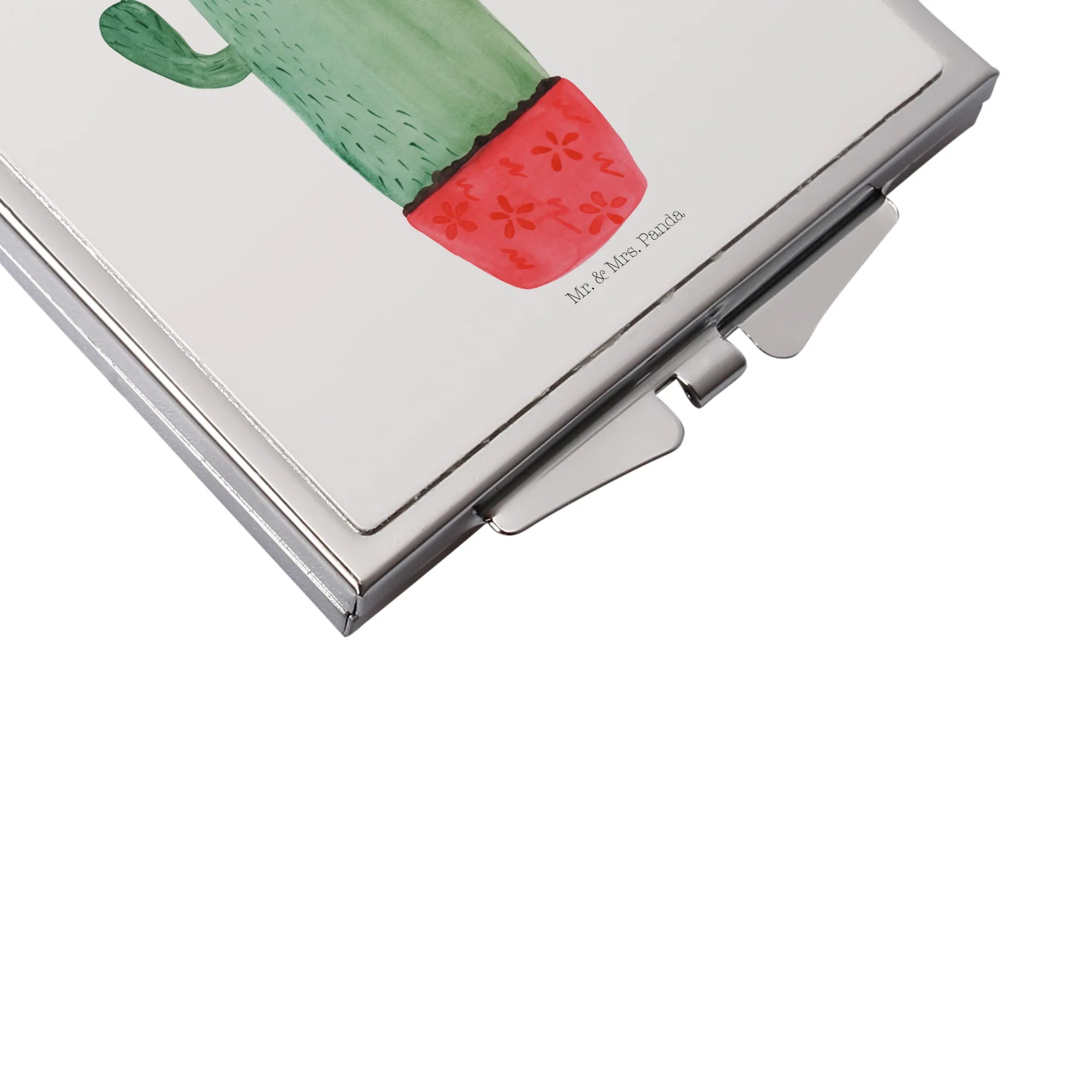 Besondere Merkmale: Klappbarer Handspiegel mit schützendem Verschluss, hübsches Aquarellmotiv „Kaktus wütend“, edle Versilberung am Rand, ideal als Spiegel für Handtasche oder Make-up Tasche.