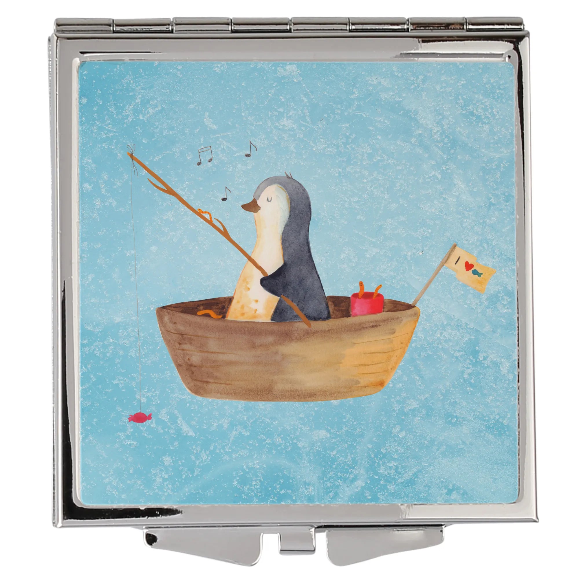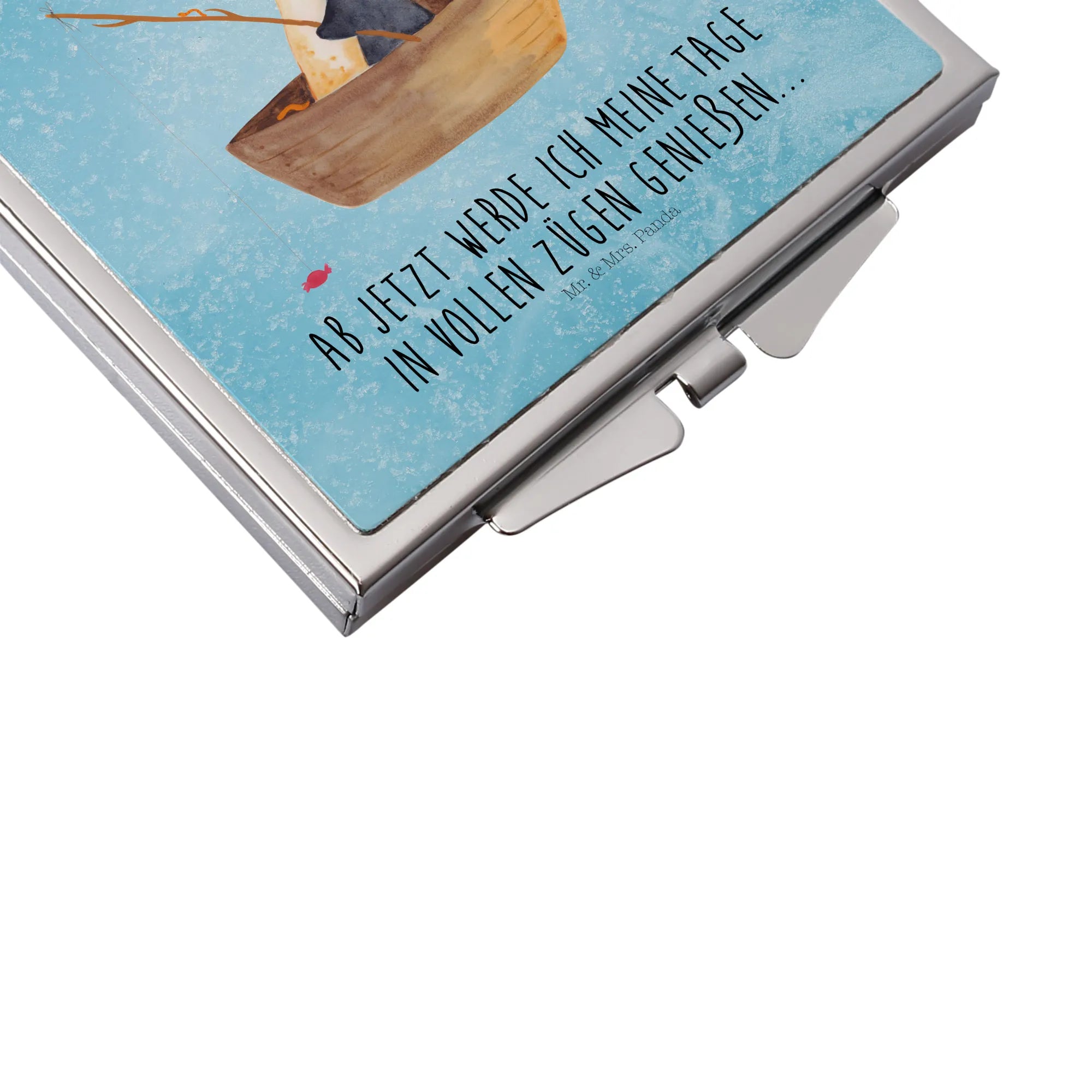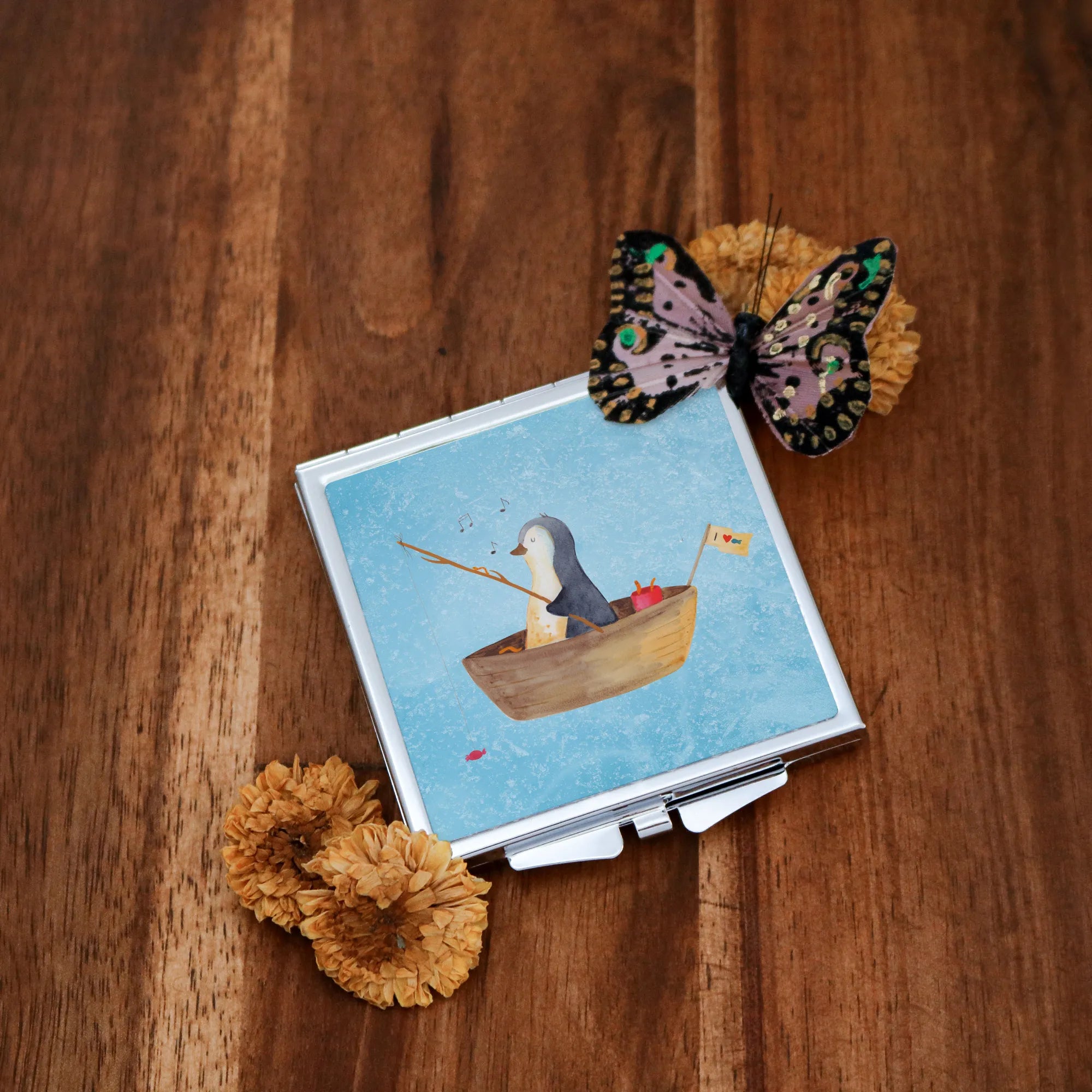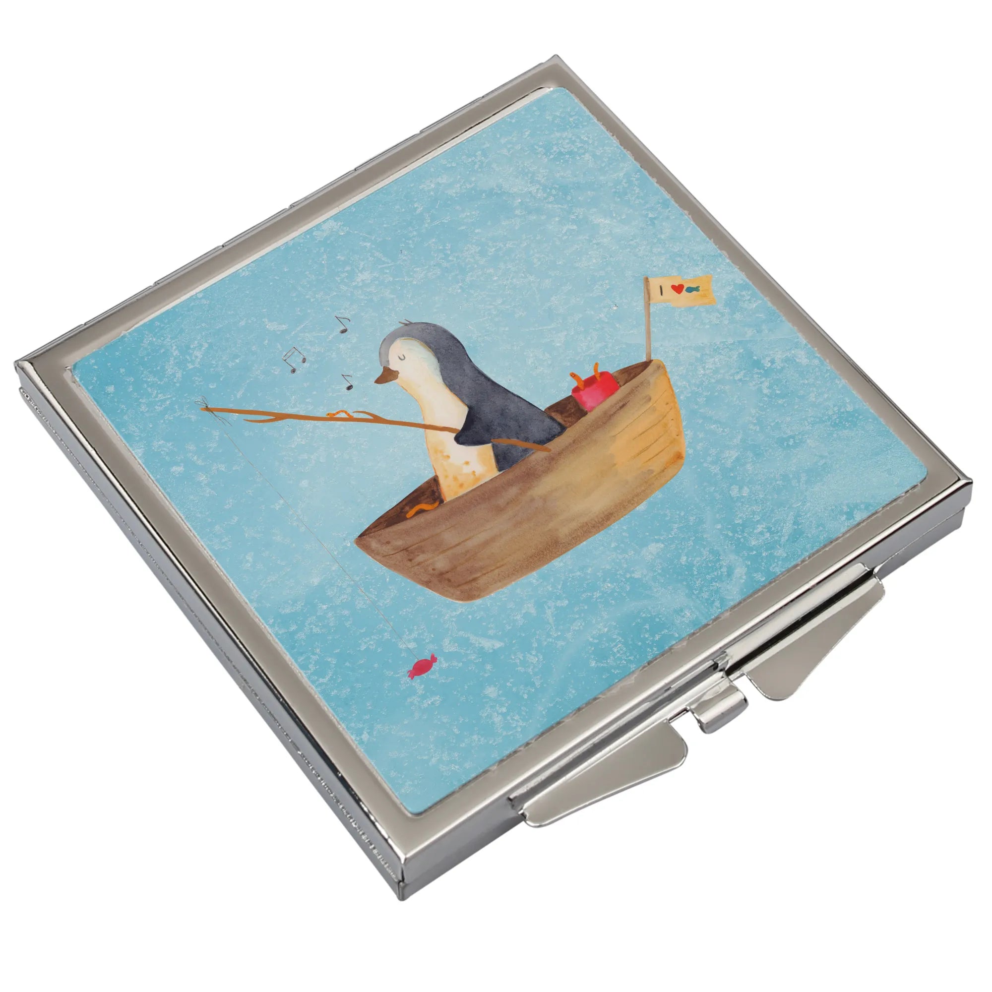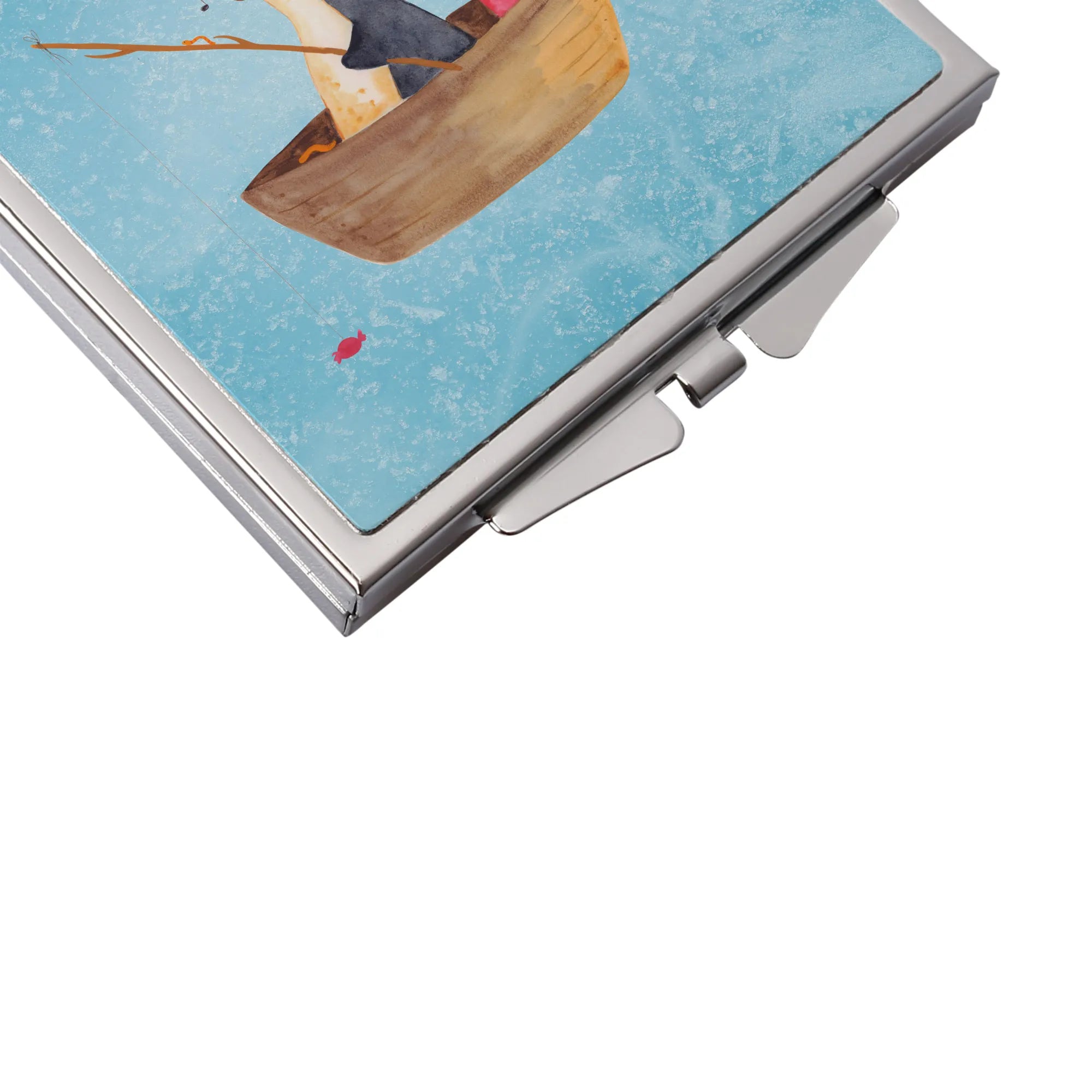 Kwadratowe lusterko do torebki pingwin łódka wędkarska - z napisem - Eisblau
