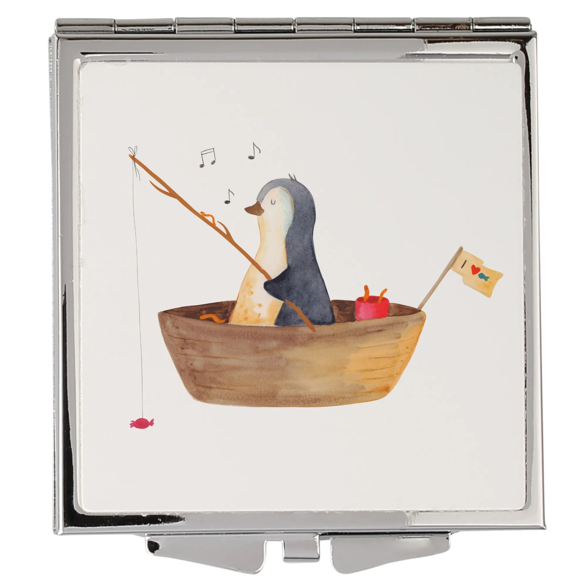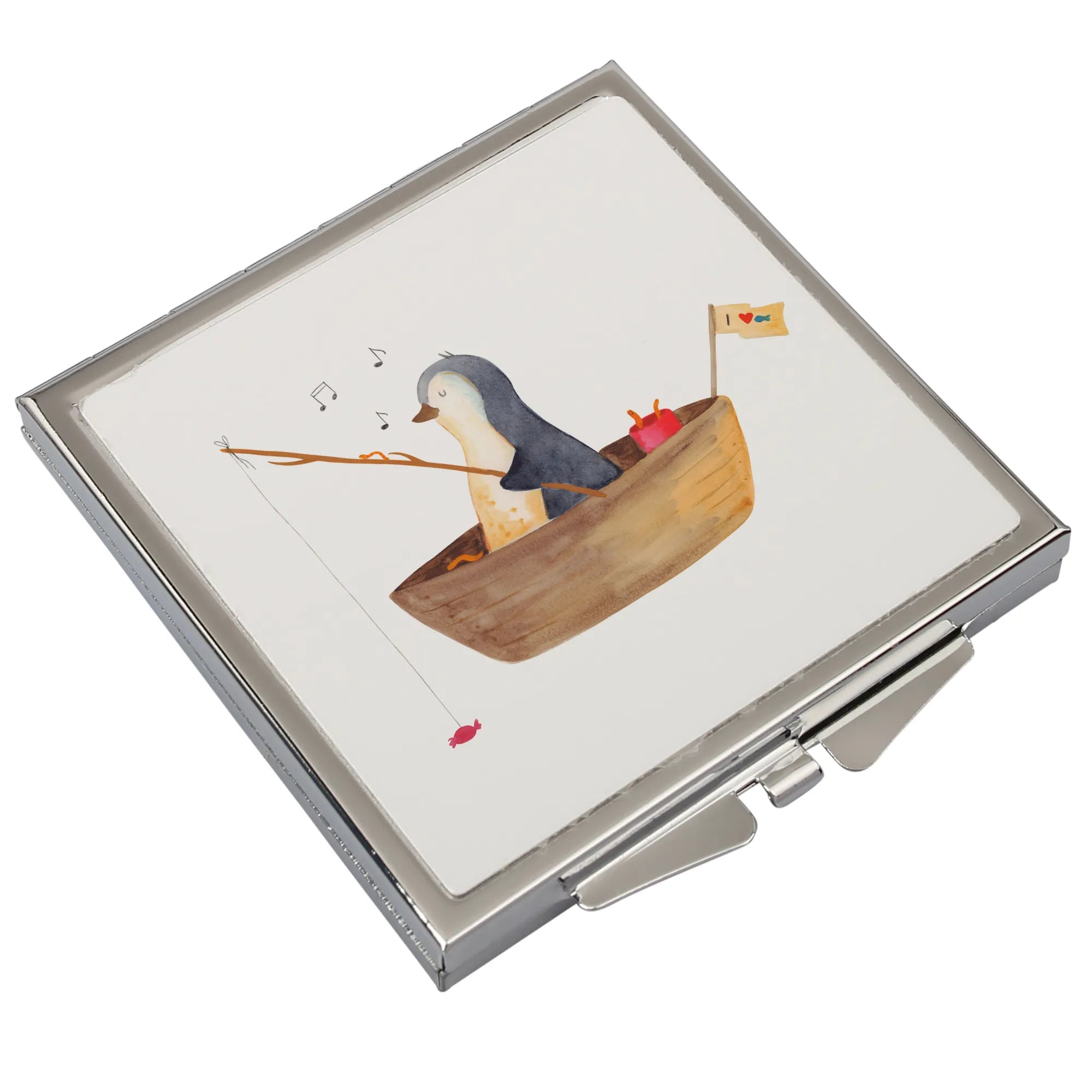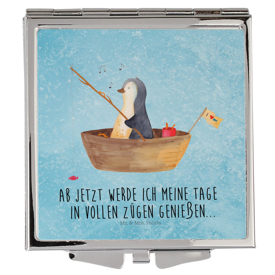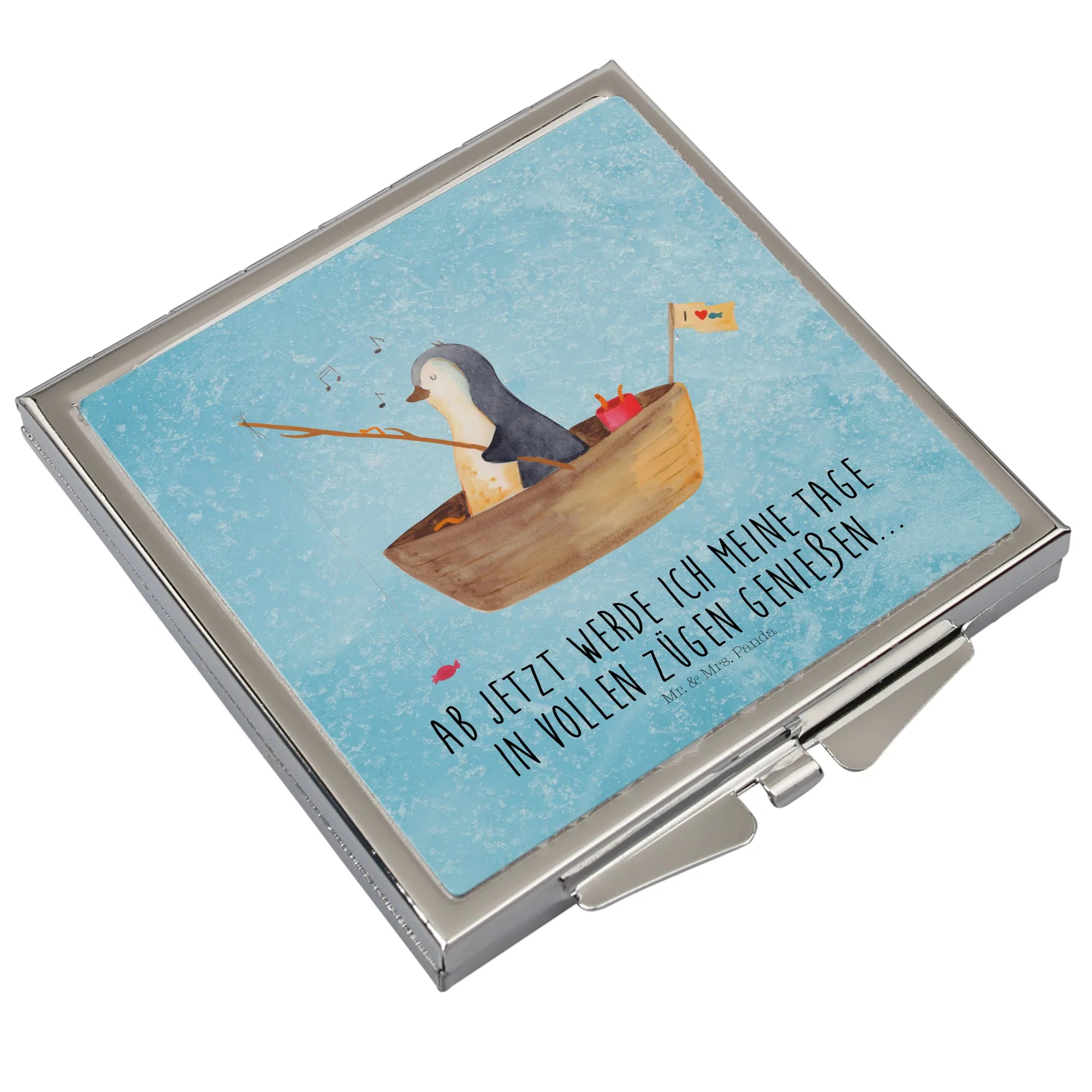 Kwadratowe lusterko do torebki pingwin łódka wędkarska - z napisem - Eisblau