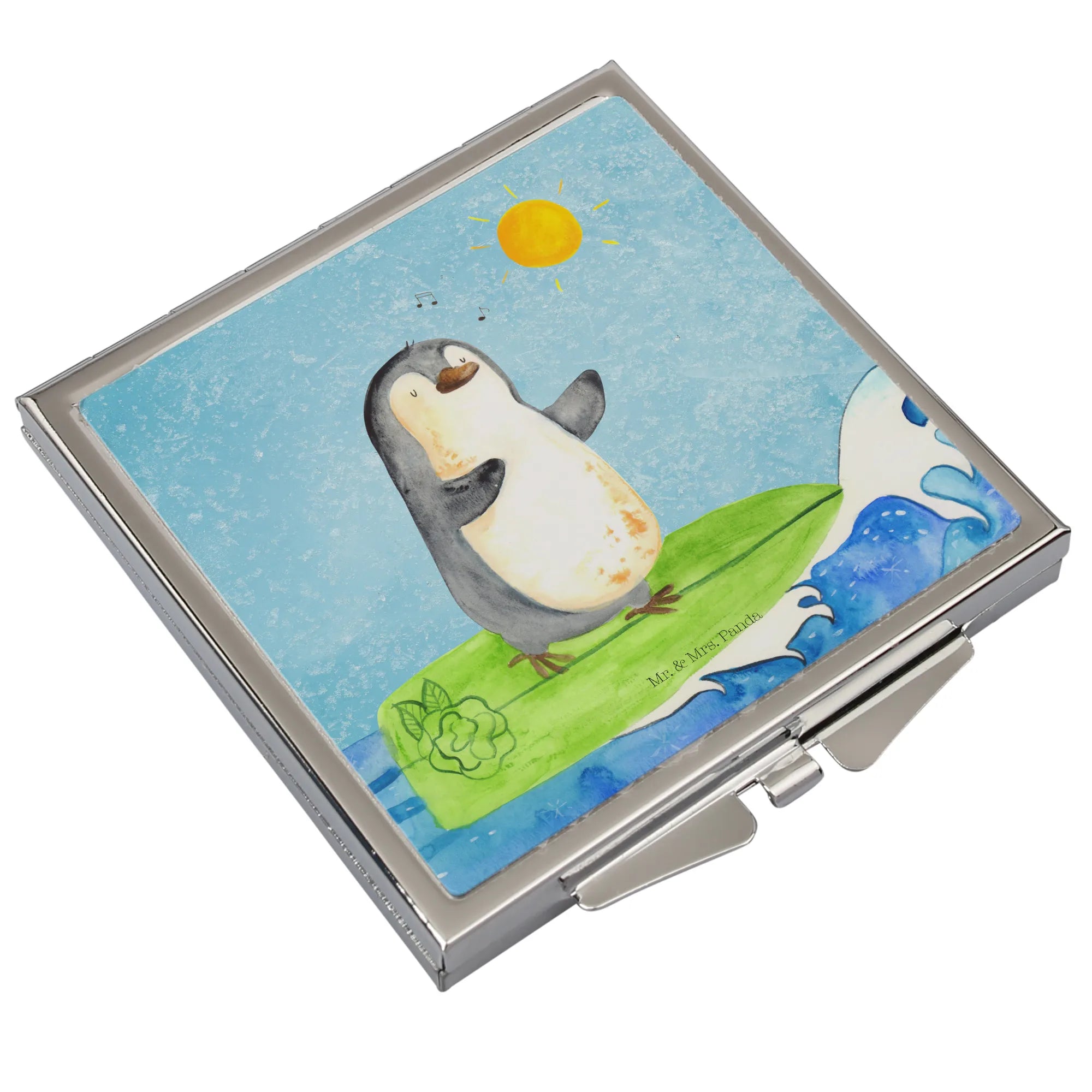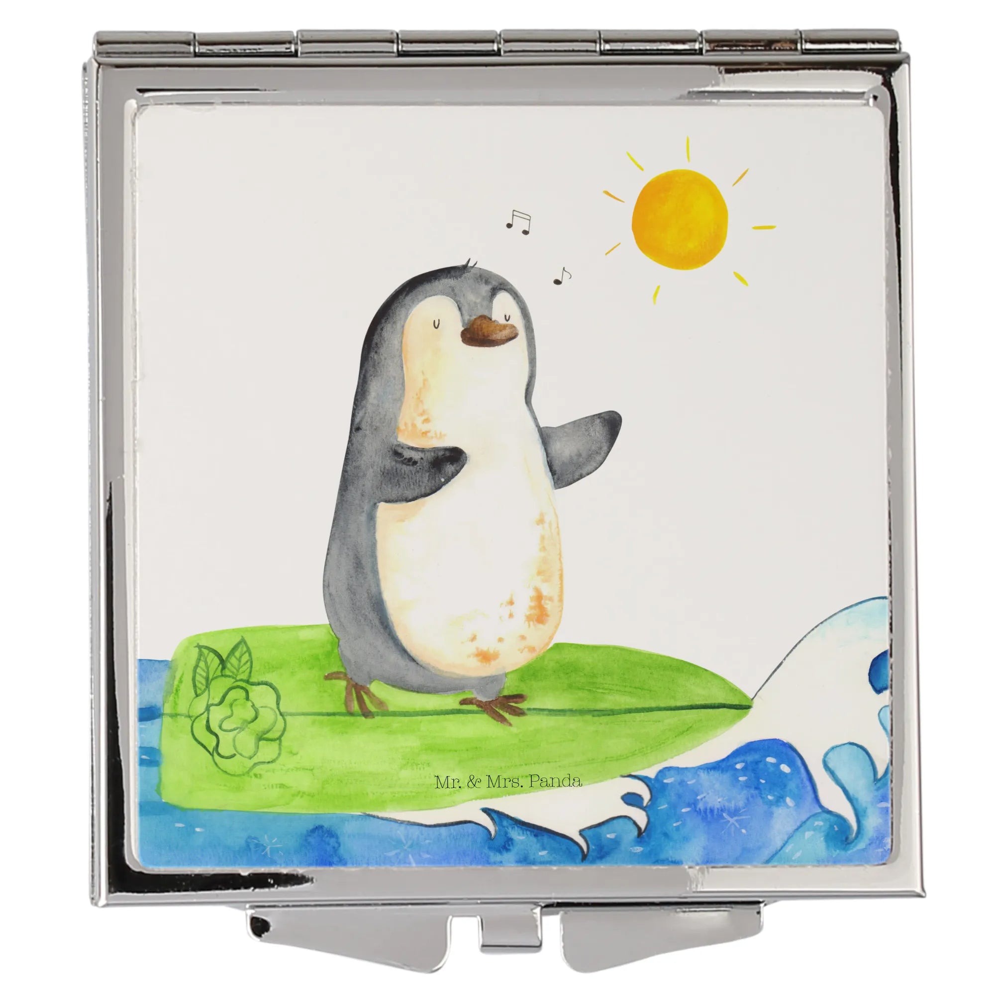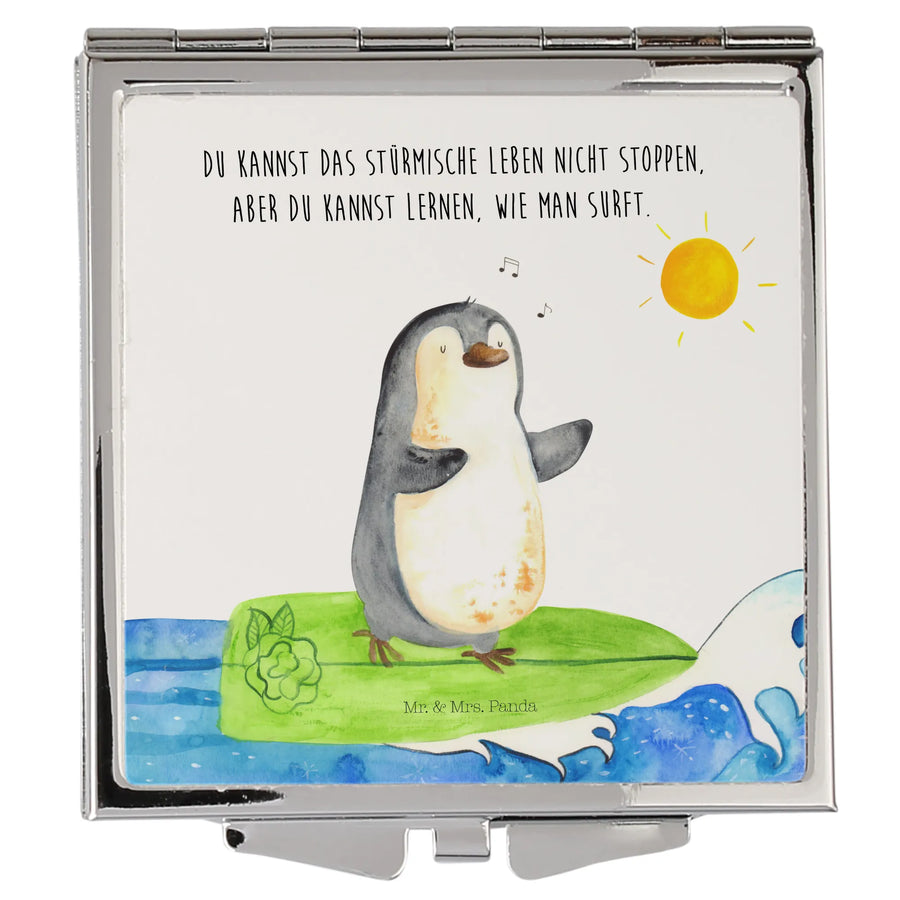 Kwadratowe lusterko do torebki Pingwin surfista - z napisem - biały