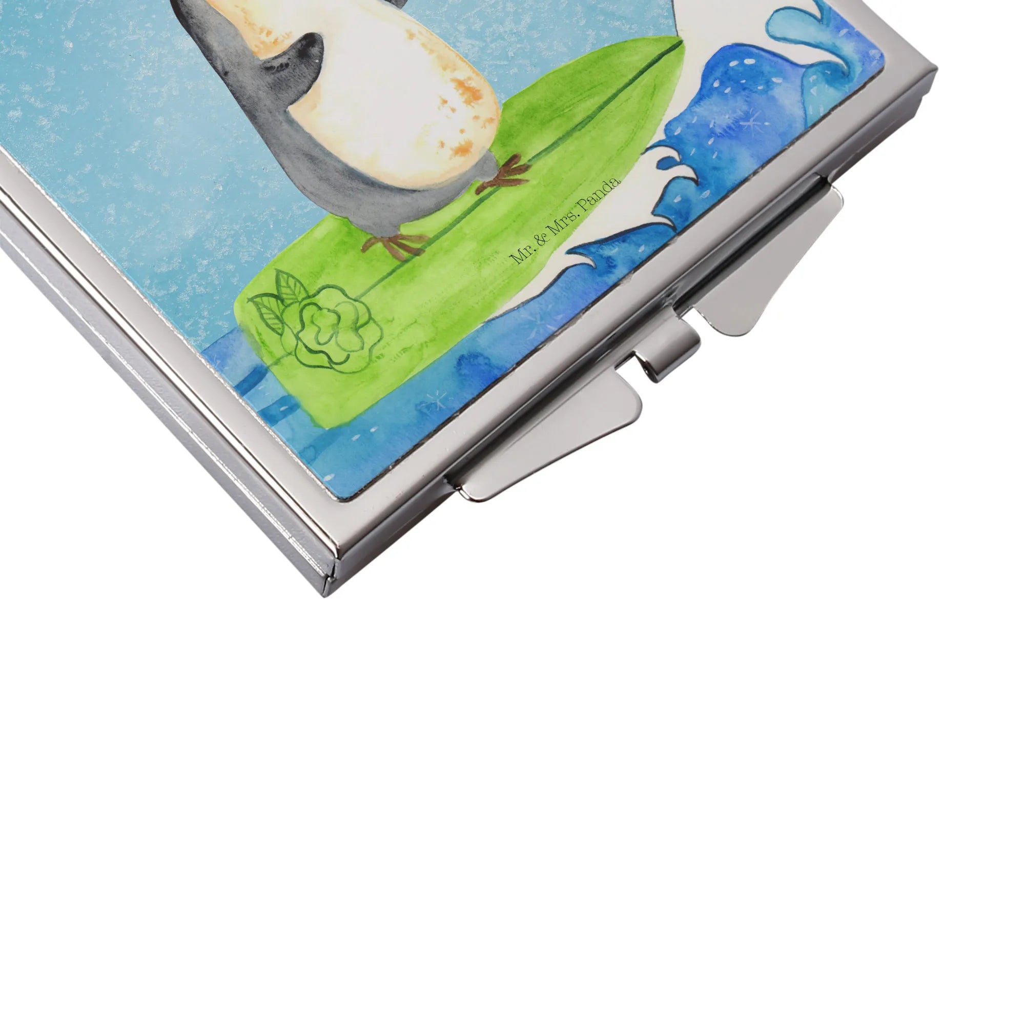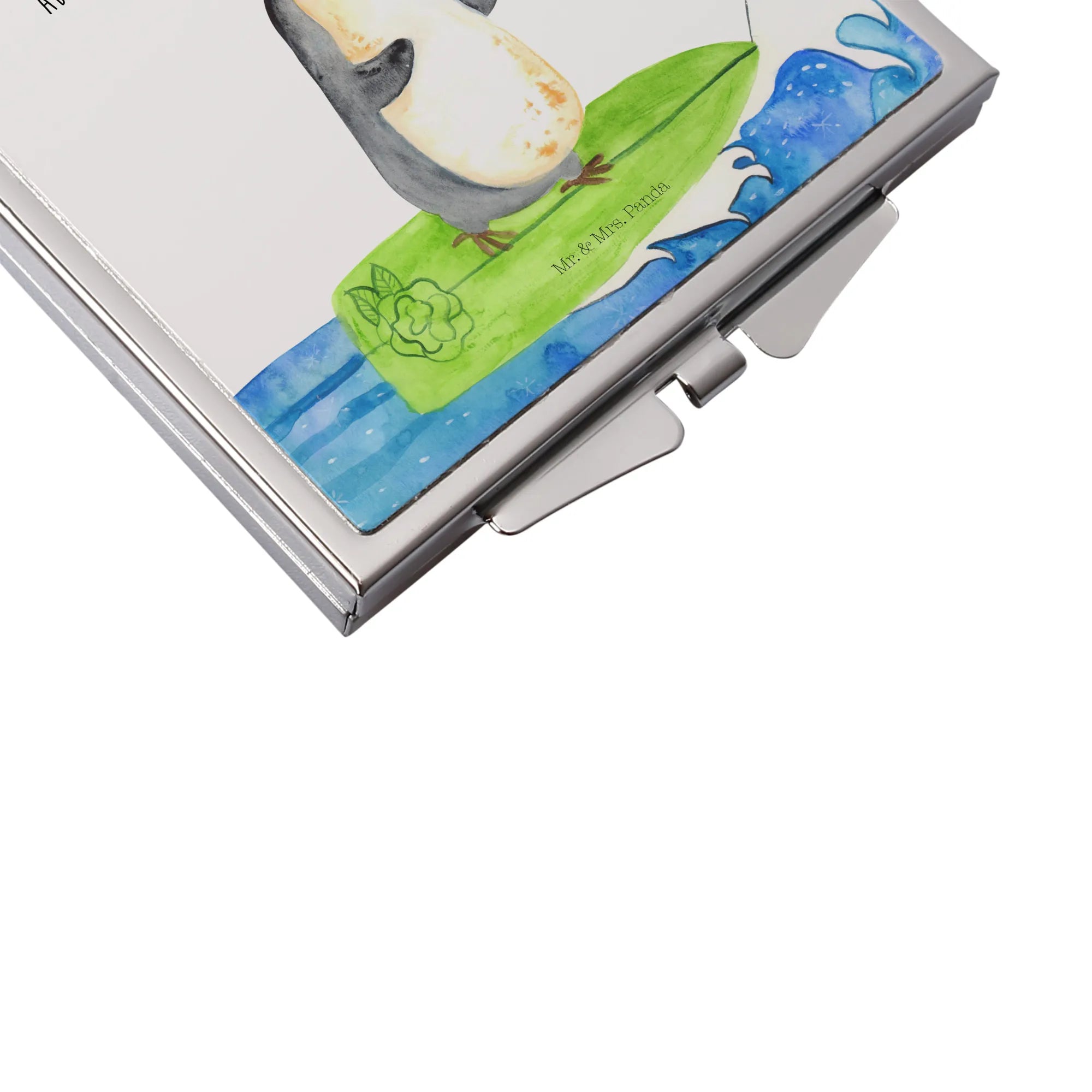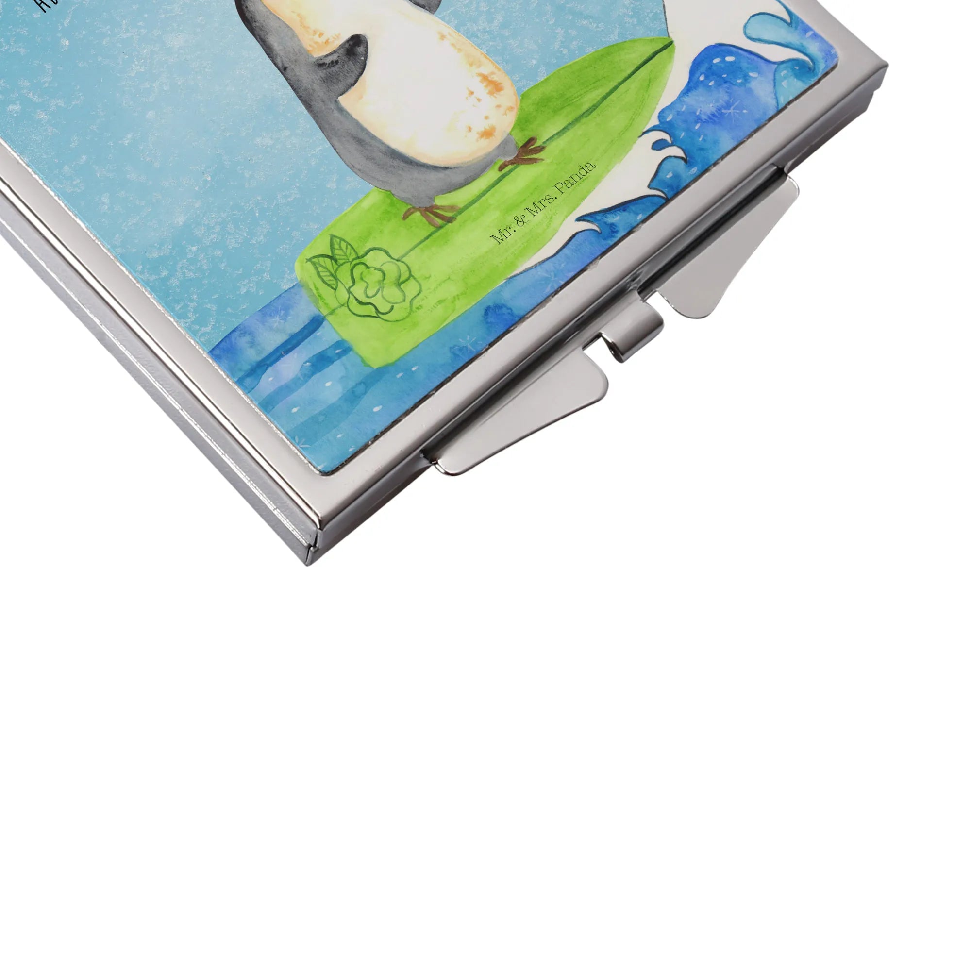 Kwadratowe lusterko do torebki Pingwin surfista - z napisem - biały