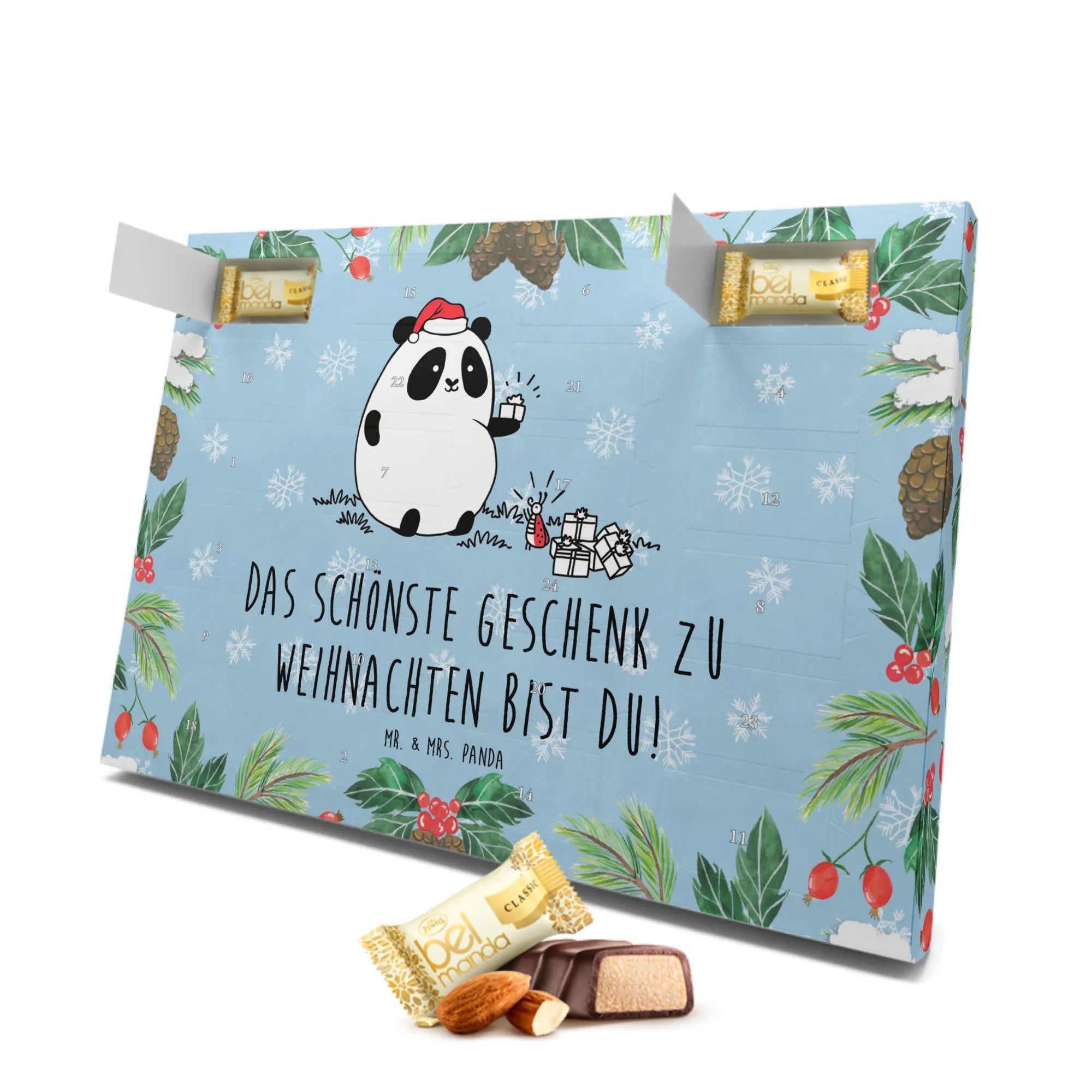 Der liebevolle Panda, der gemeinsam mit seinem Freund, dem Marienkäfer, beschenkt wird, versprüht pure Weihnachtsfreude und die Botschaft: "Das schönste Geschenk zu Weihnachten bist du!" Diese nette Botschaft macht den Kalender zu einem besonders persönlichen Geschenk für Freunde, Familie oder auch für dich selbst.