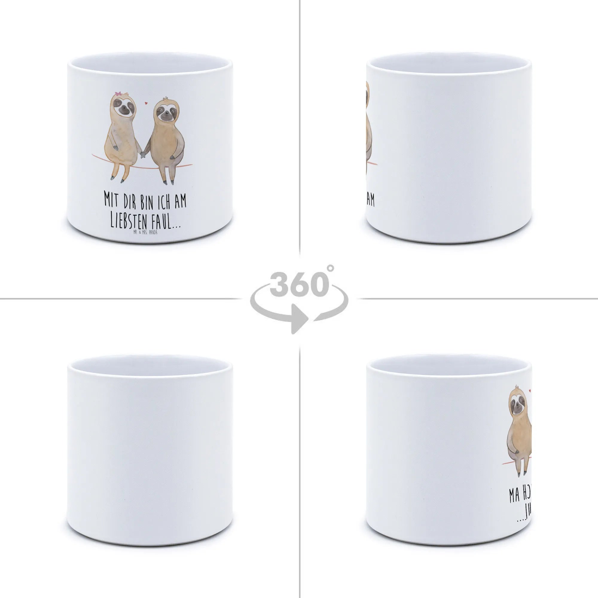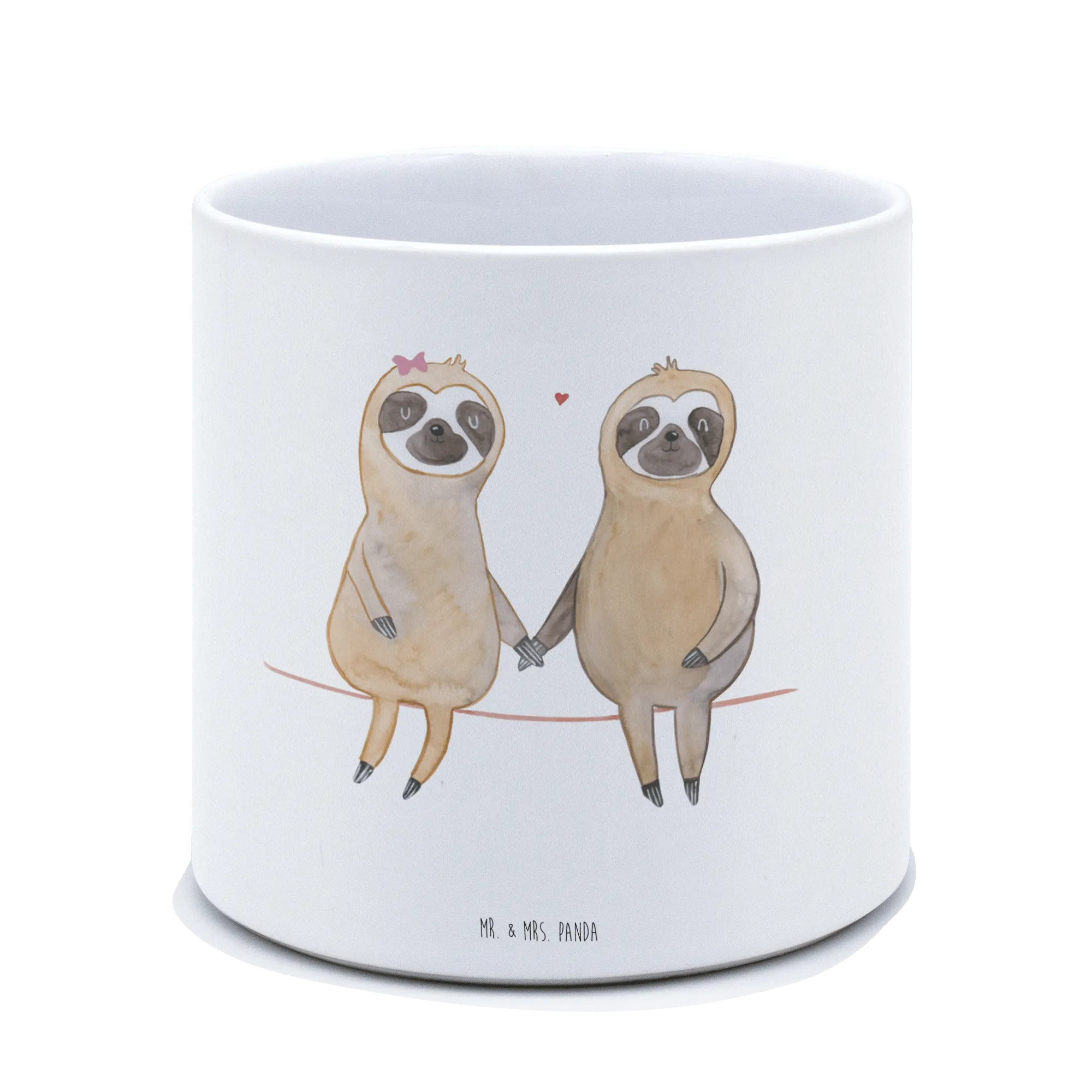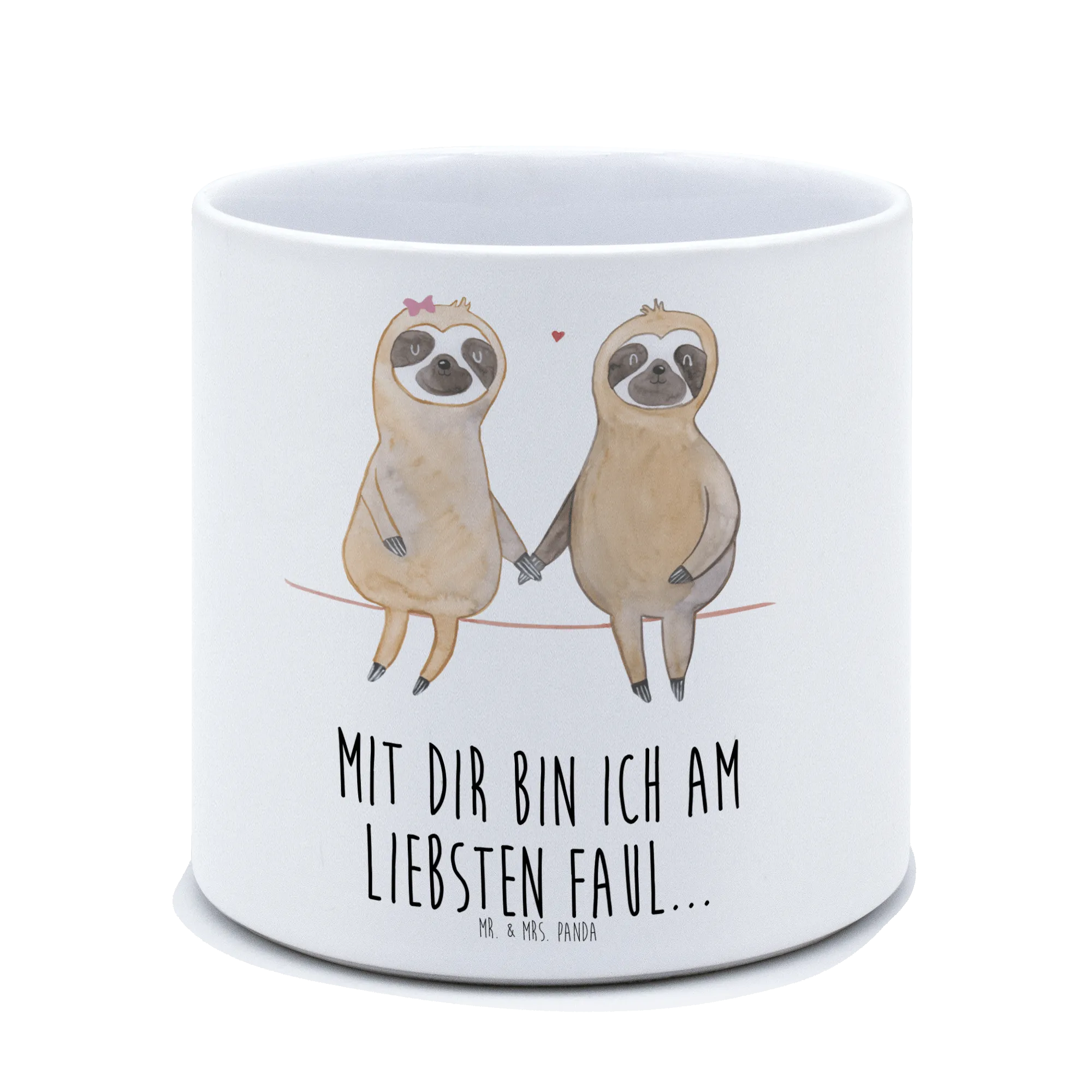 Suchst du das perfekte Geschenk für einen Faultierliebhaber? Unser XL Blumentopf mit dem süßen Faultierpärchen-Design aus der Faultier-Kollektion ist genau das Richtige! Dieses handgezeichnete Aquarell von Mr. & Mrs. Panda zeigt zwei verliebte Faultiere, die sich an den Händen halten und damit symbolisieren, dass sie einander nie loslassen werden. Der Spruch 'Mit dir bin ich am Liebsten faul...' ergänzt das herzliche Design und sorgt für eine entspannte Atmosphäre in deinen vier Wänden.