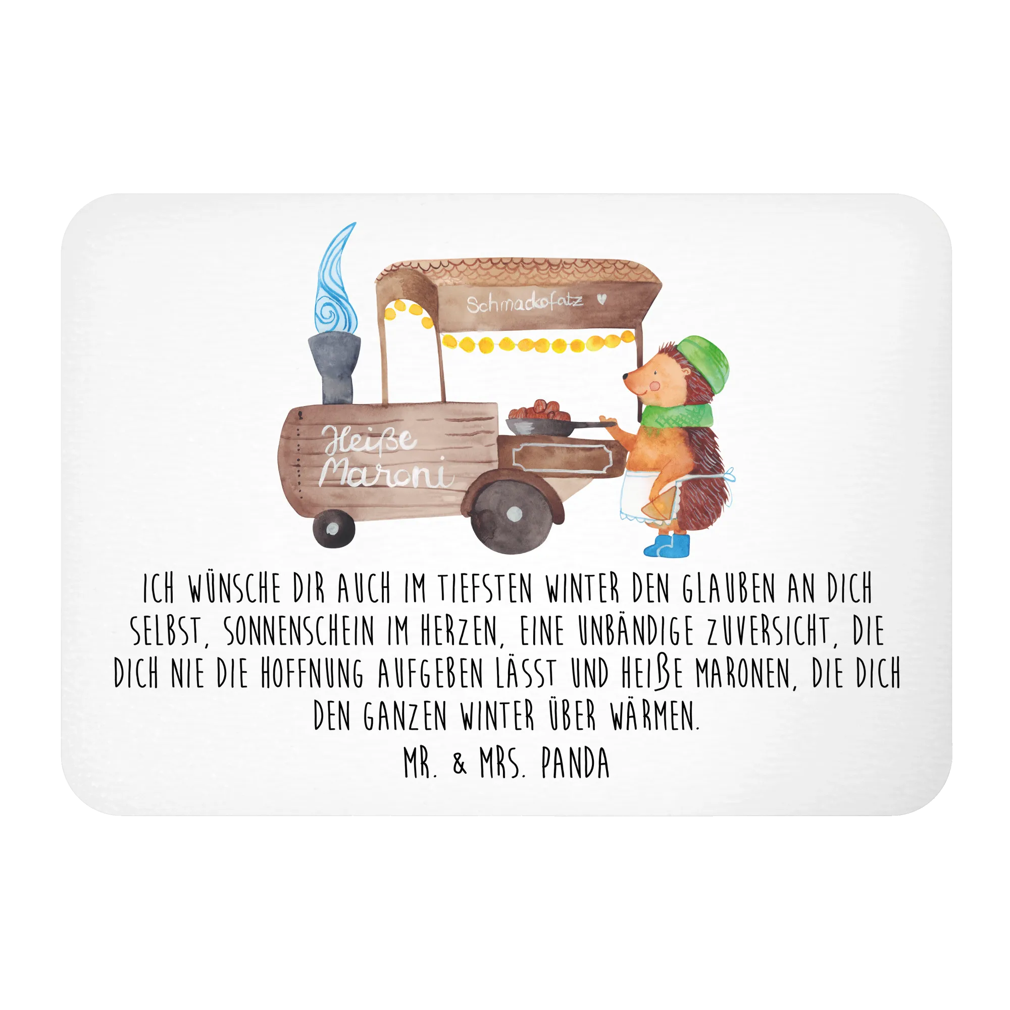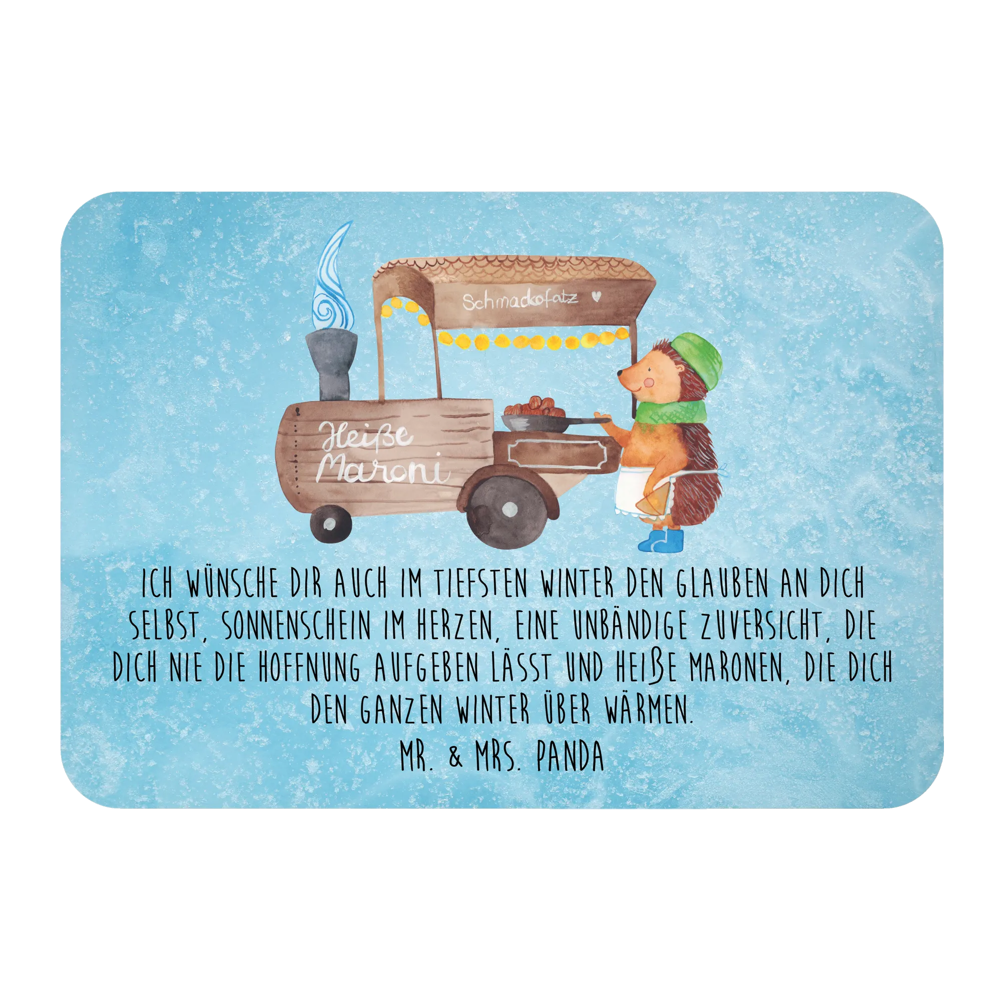 Abgerundet wird das Ganze durch den liebevollen Spruch: "Ich wünsche dir auch im tiefsten Winter den Glauben an dich selbst, Sonnenschein im Herzen, eine unbändige Zuversicht, die dich nie die Hoffnung aufgeben lässt und heiße Maronen, die dich den ganzen Winter über wärmen."