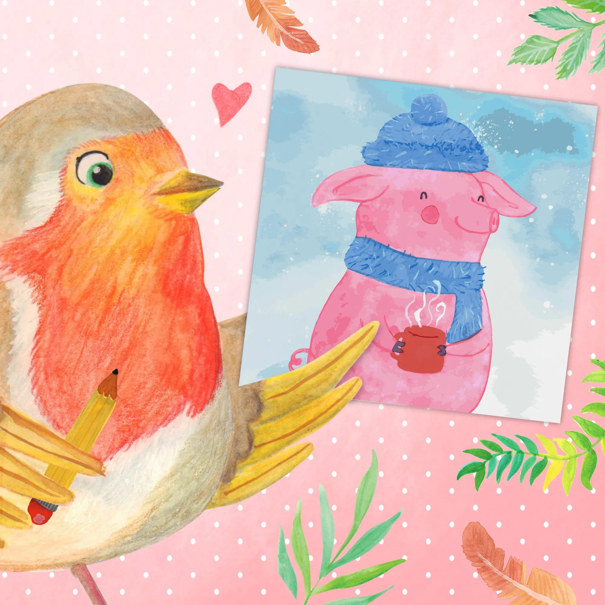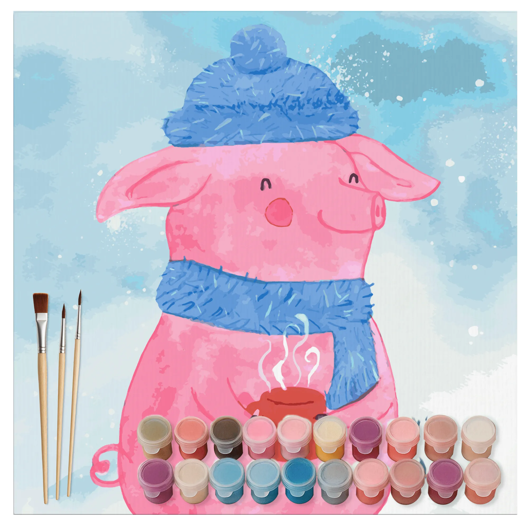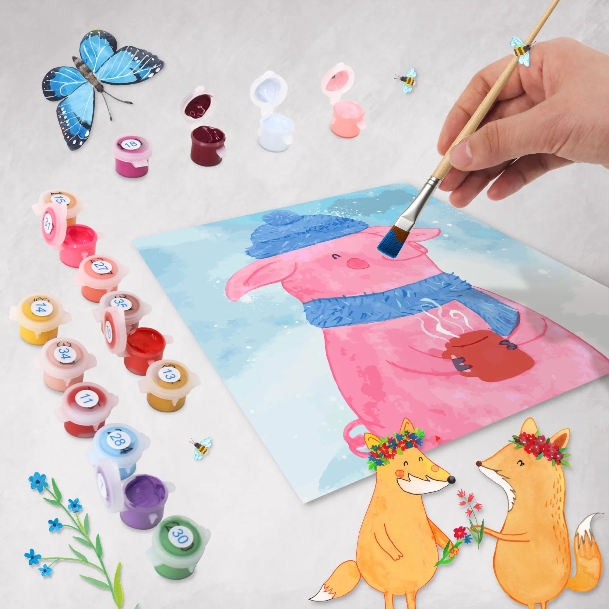 Entdecke mein zauberhaftes Malen nach Zahlen Set mit dem niedlichen Glühschwein-Motiv aus der Winter Kollektion von Mr. & Mrs. Panda! Perfekt für alle kreativen Seelen, die ihre Liebe zur Winterzeit und zu Glühwein beim Malen ausleben möchten. Das Glühschwein zeigt ein fröhliches, rosa Schwein, das in stilvolle Winterkleidung gehüllt ist, einschließlich einer blauen Mütze mit Pompon und einem passenden Schal. In den Hufen hält es eine dampfende rote Tasse, die ein Gefühl der Gemütlichkeit und des Wohlbefindens vermittelt und wunderbar in die kalte Jahreszeit passt.