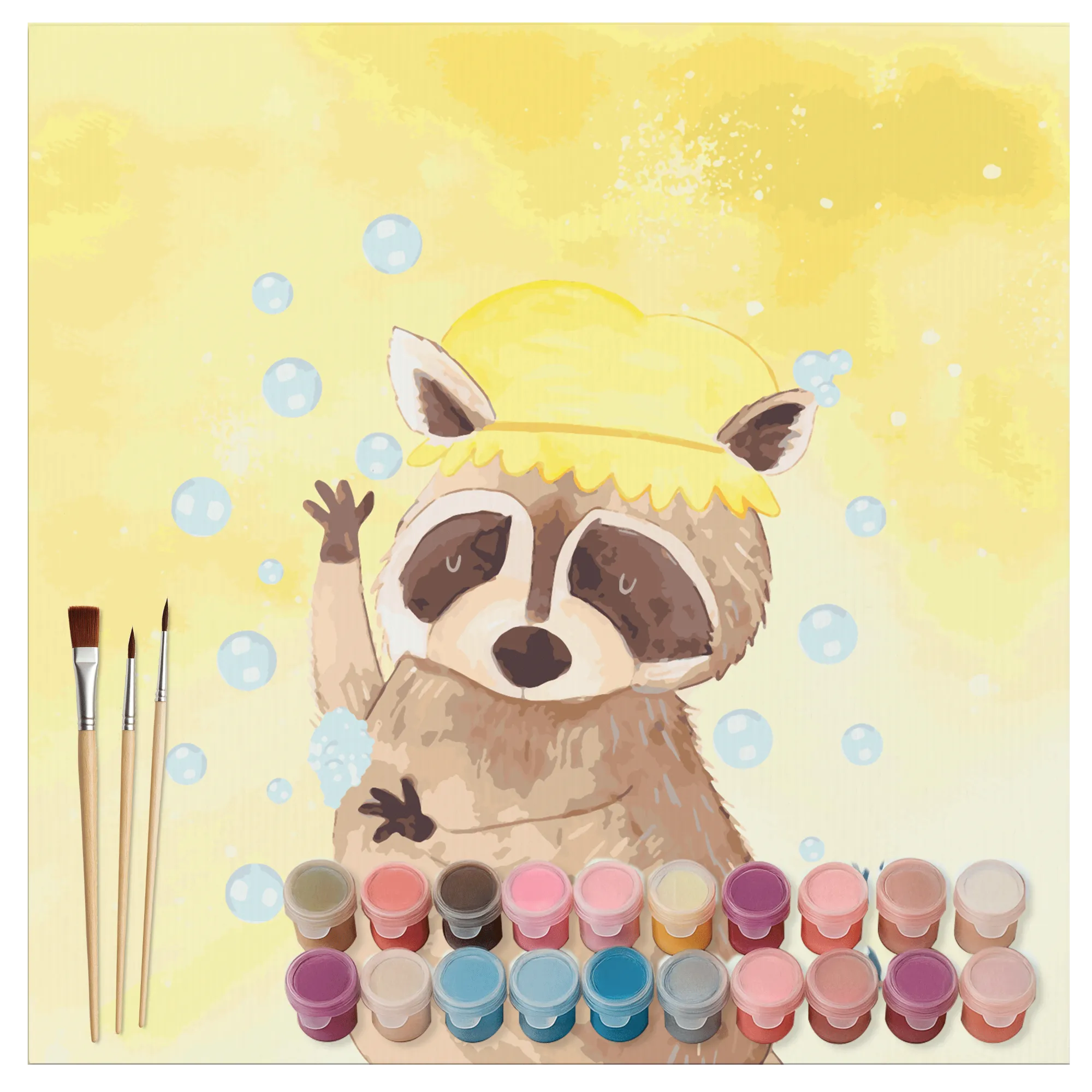 Mit hochwertigen Acrylfarben in 24 leuchtenden Tönen und drei formstabilen Kunsthaarpinseln macht das Ausmalen richtig Spaß. Lass dich von unserem süßen Waschbär motivieren, der gerade genüsslich unter der Dusche steht und fröhlich mit Seifenblasen spielt. Sein fröhliches Wesen wird deine Wände in ein wahres Kunstwerk verwandeln!