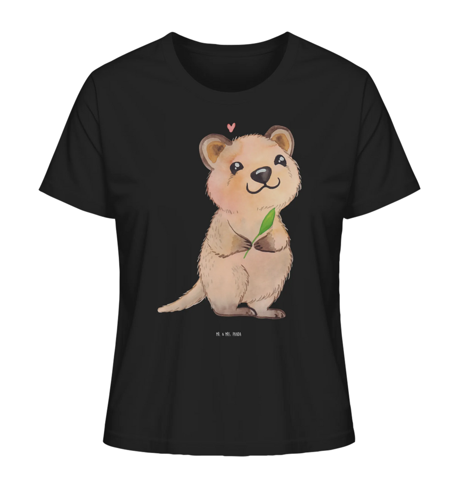 Mit diesem liebevoll gestalteten Shirt Damen von Mr. & Mrs. Panda trägst Du ein kleines Stück Freude überall hin. Das niedliche Quokka-Motiv steht im Mittelpunkt: aufrecht, mit einem grünen Blatt in den Pfoten und einem rosa Herz über dem Kopf — ein Bild, das sofort gute Laune verbreitet. Auf dem schwarzen Hintergrund kommen die Farben besonders strahlend zur Geltung. 🌿💗
