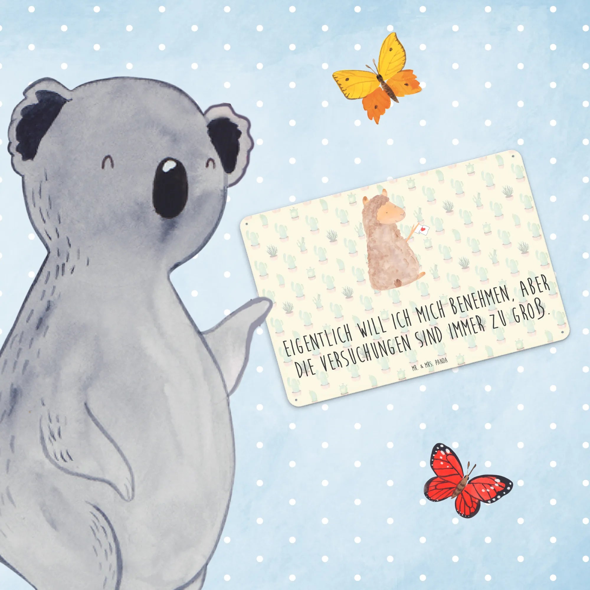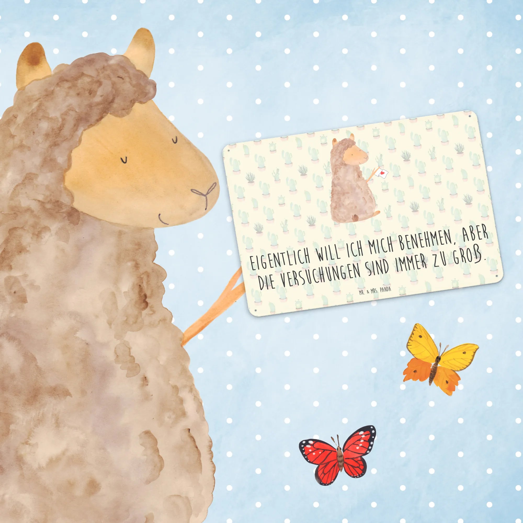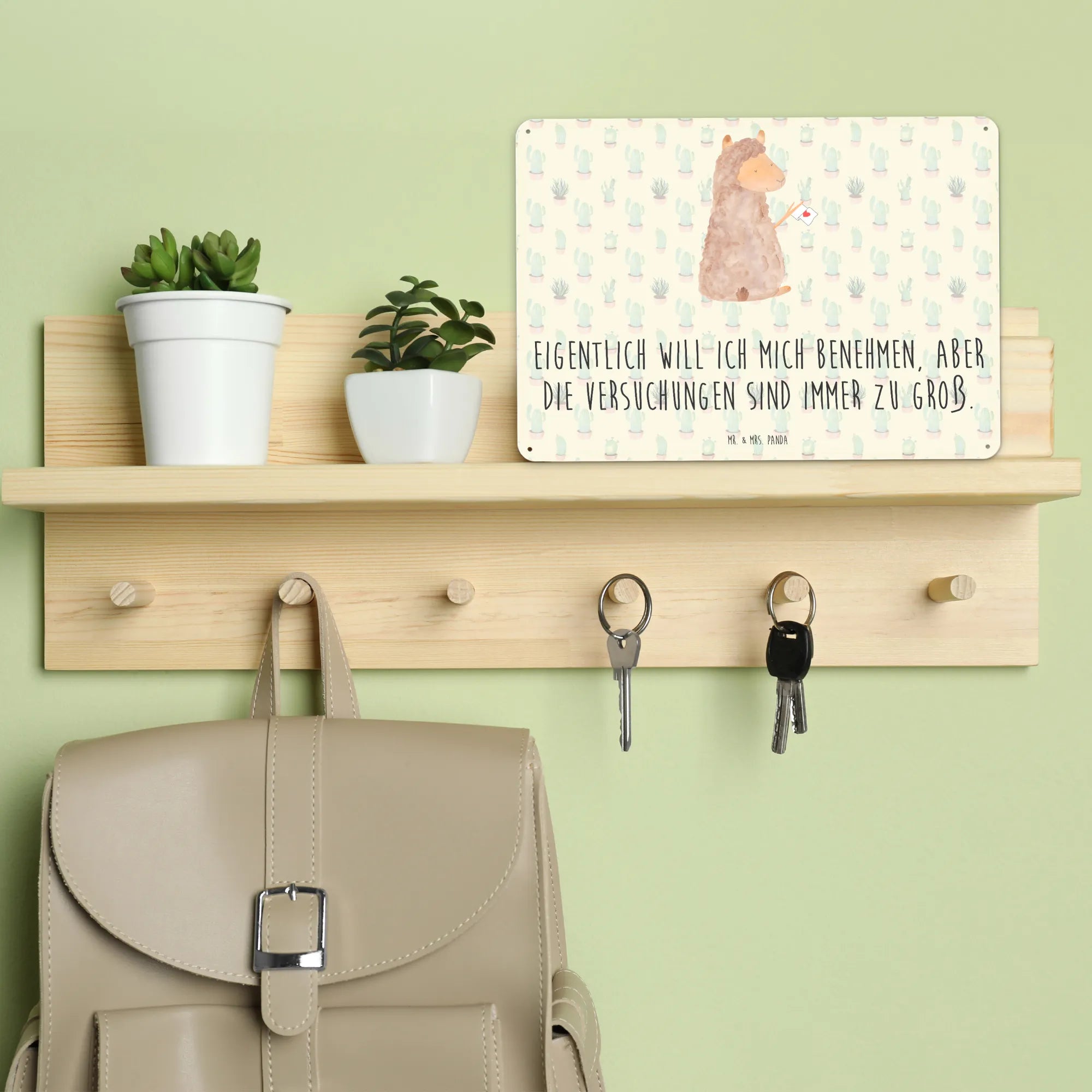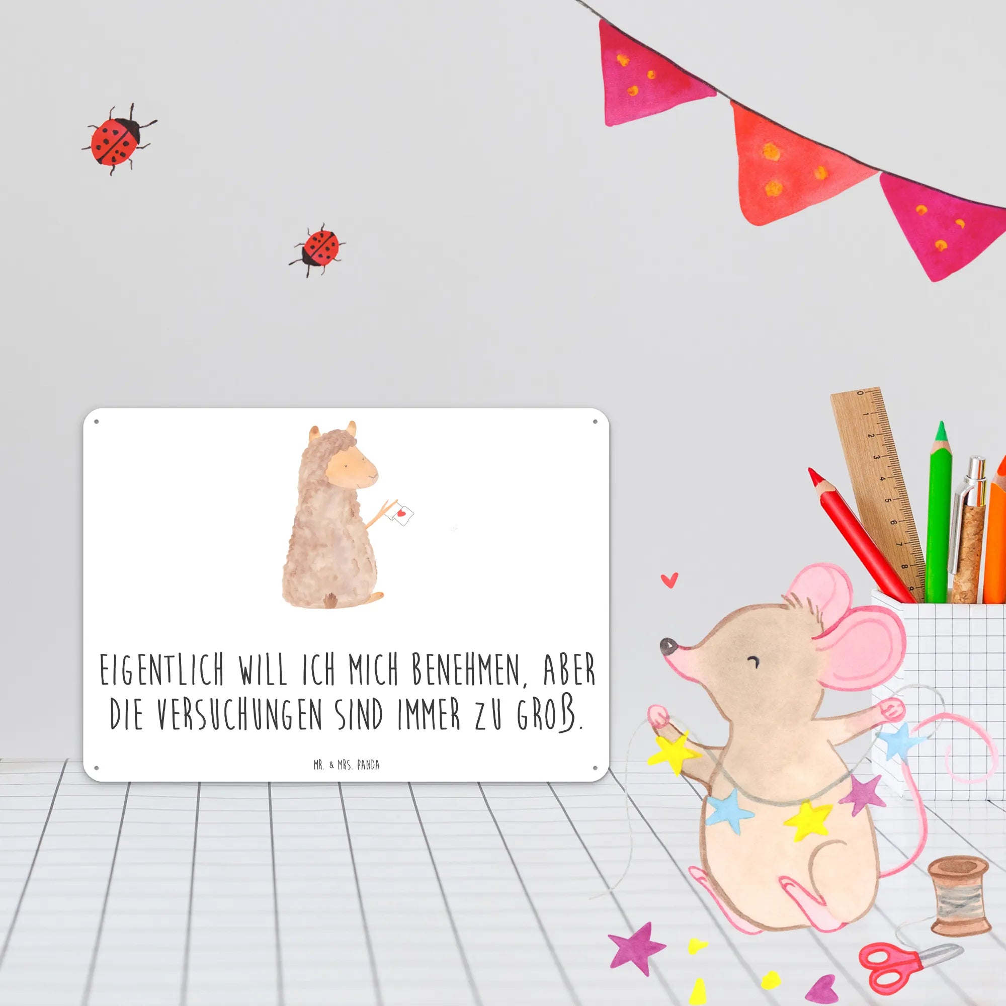 Entdecke das charmante Blechschild mit der herrlichen Alpaka Fahne von Mr. & Mrs. Panda! Dieses zauberhafte Schild bringt nicht nur Farbe in Dein Zuhause, sondern auch ein Lächeln in Deinen Alltag. 🦙💕 Das süße Alpaka auf der Fahne, das ein Herz in der Hand hält, ist nicht nur dekorativ, sondern sorgt auch dafür, dass Du jeden Tag freundlich begrüßt wirst. Mit dem Spruch "Eigentlich will ich mich benehmen, aber die Versuchungen sind immer zu groß" bringt das Schild eine humorvolle Note in Deine Wände und sorgt für ein kuscheliges Gefühl. Ob an der Wand im Wohnzimmer, in der Küche oder an der Tür, unser Blechschild ist die perfekte Wanddekoration, um Dein Zuhause individuell zu gestalten.