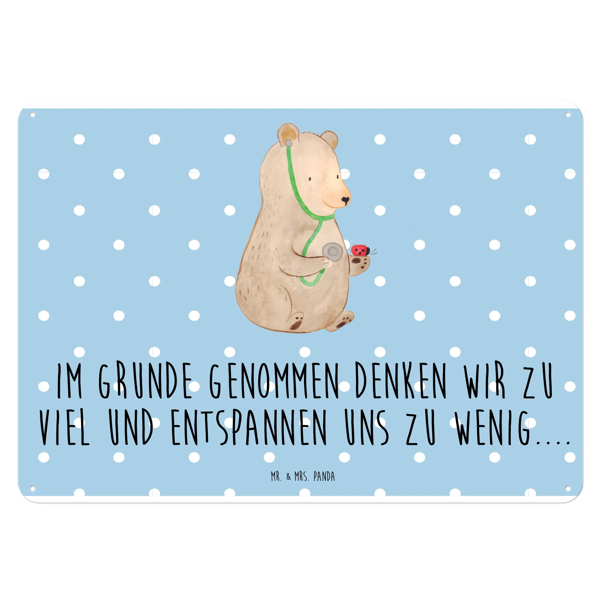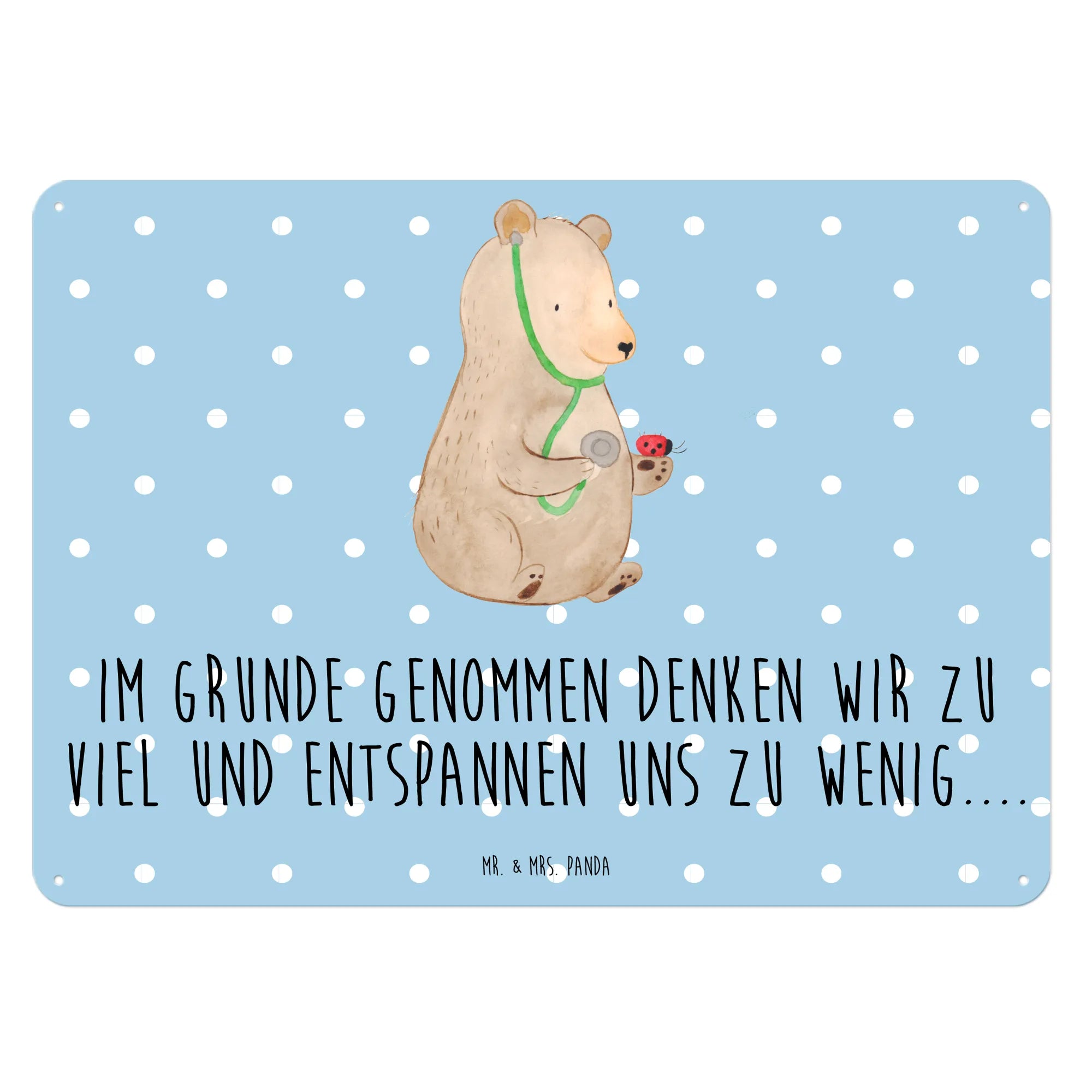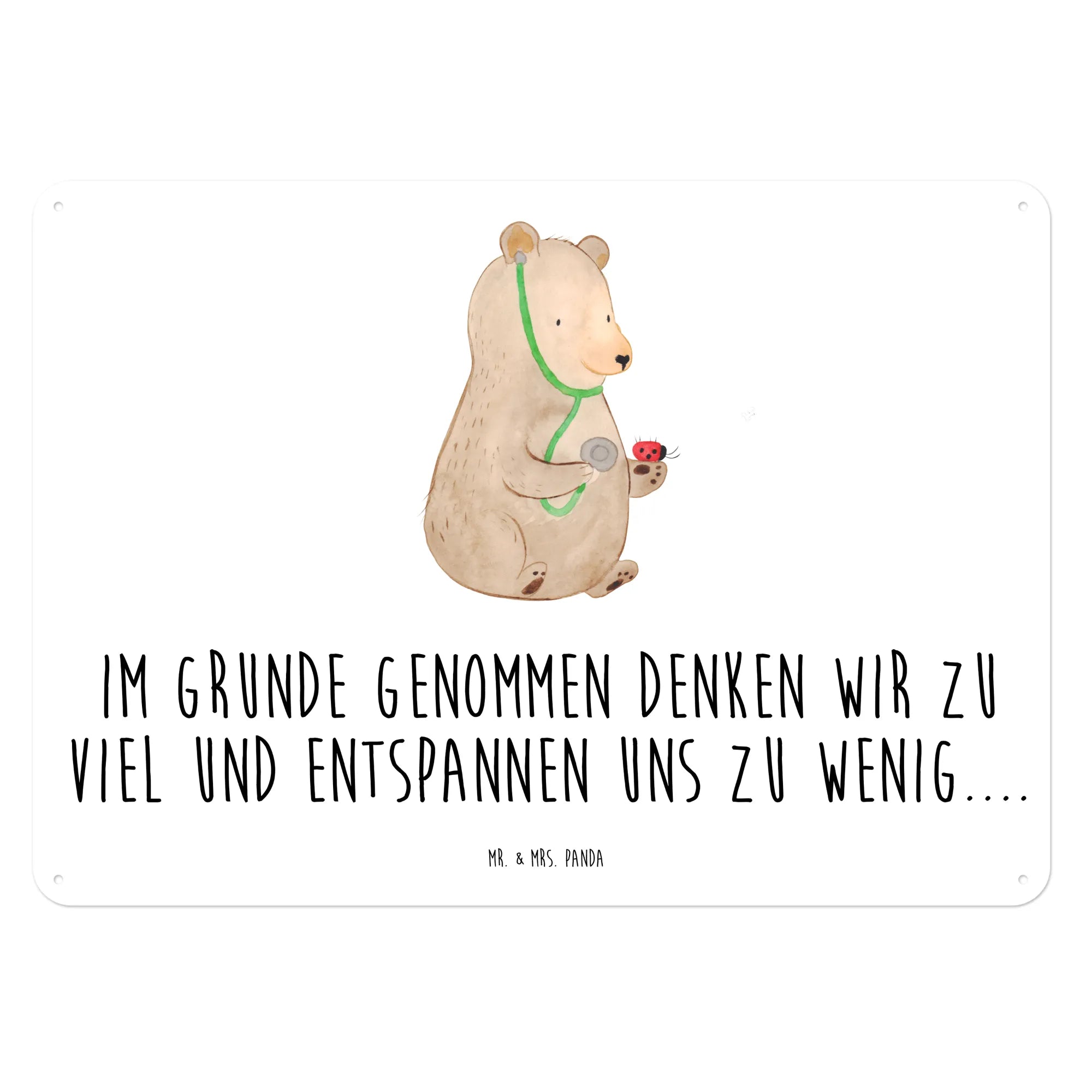 Das edle Blechschild mit dem süßen Motiv "Bär Arzt" von Mr. & Mrs. Panda ist das perfekte Geschenk für jeden, der Tiere und vor allem Bären liebt.