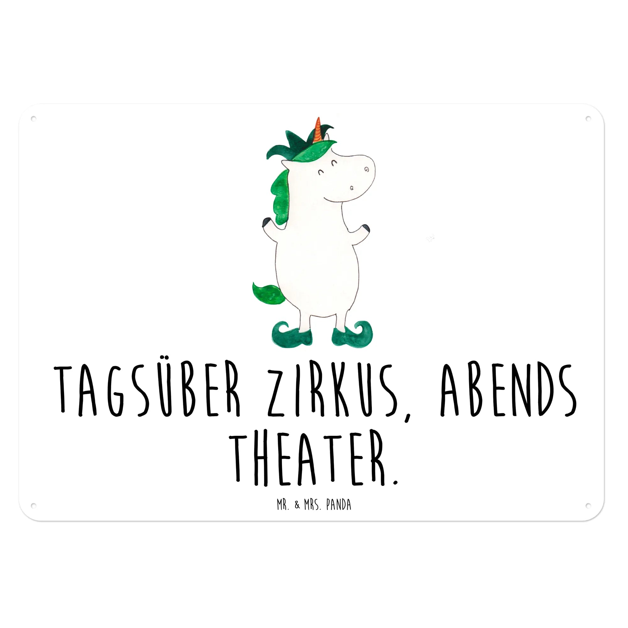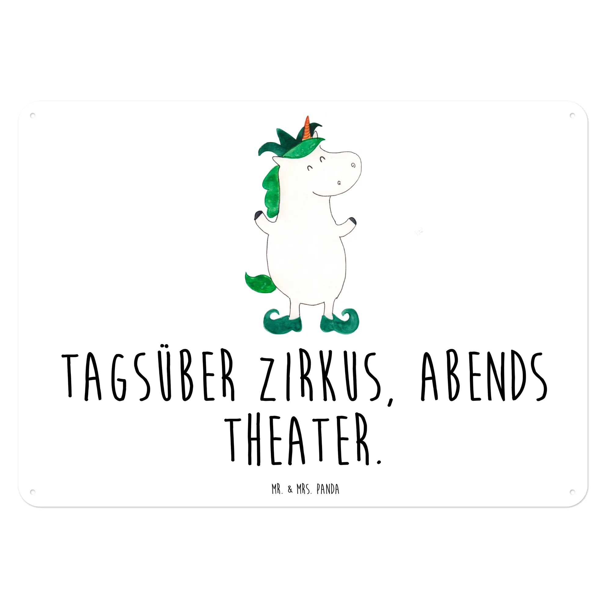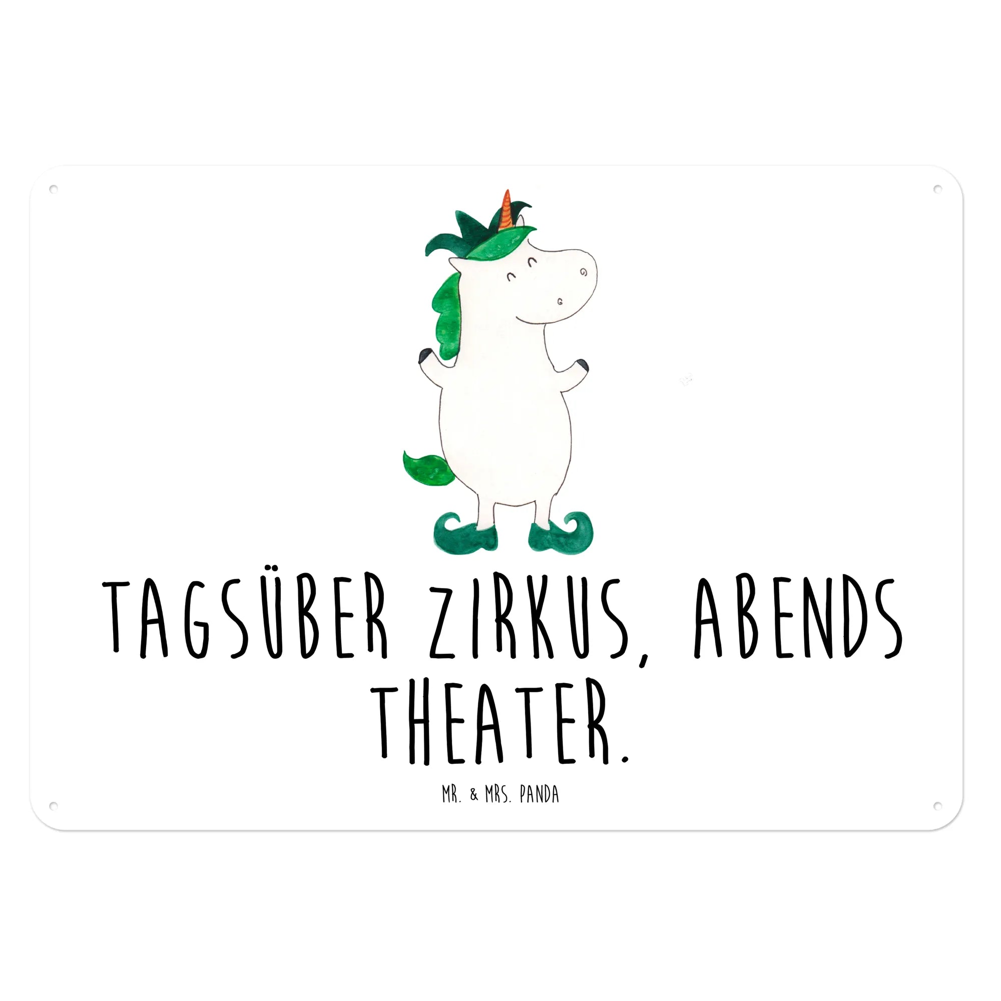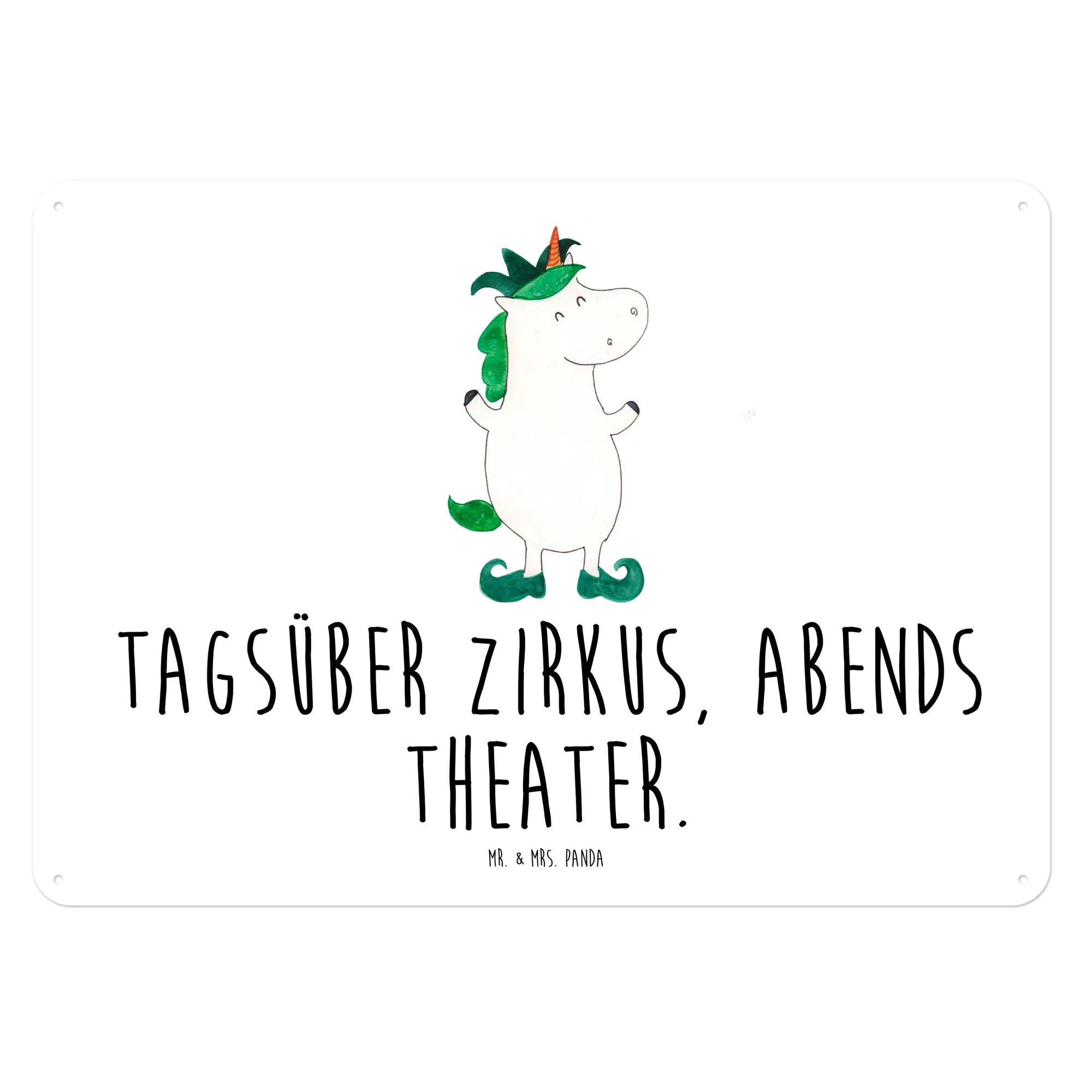 Das wunderschöne Blechschild "Einhorn Joker" aus der Einhorn-Kollektion von Mr. & Mrs. Panda ist eine zauberhafte Ergänzung für jedes Zuhause! Mit dem liebevoll handgezeichneten Motiv eines Einhorns, das gleichzeitig ein Gaukler ist, bringt dieses Schild ein Stück Magie und Freude in dein Leben. Es zeigt den lustigen Slogan "Tagsüber Zirkus, abends Theater", der perfekt zu diesem fröhlichen Design passt.