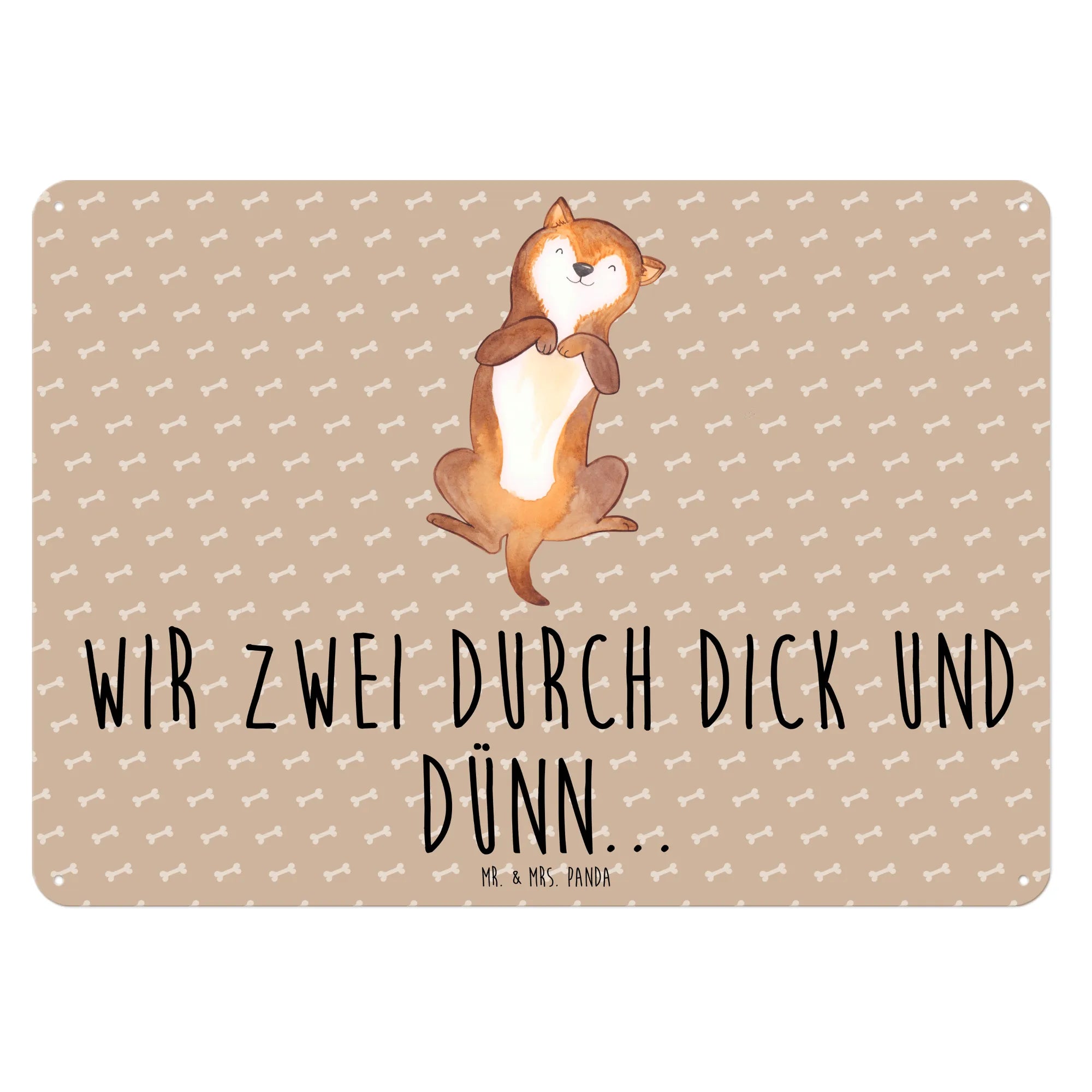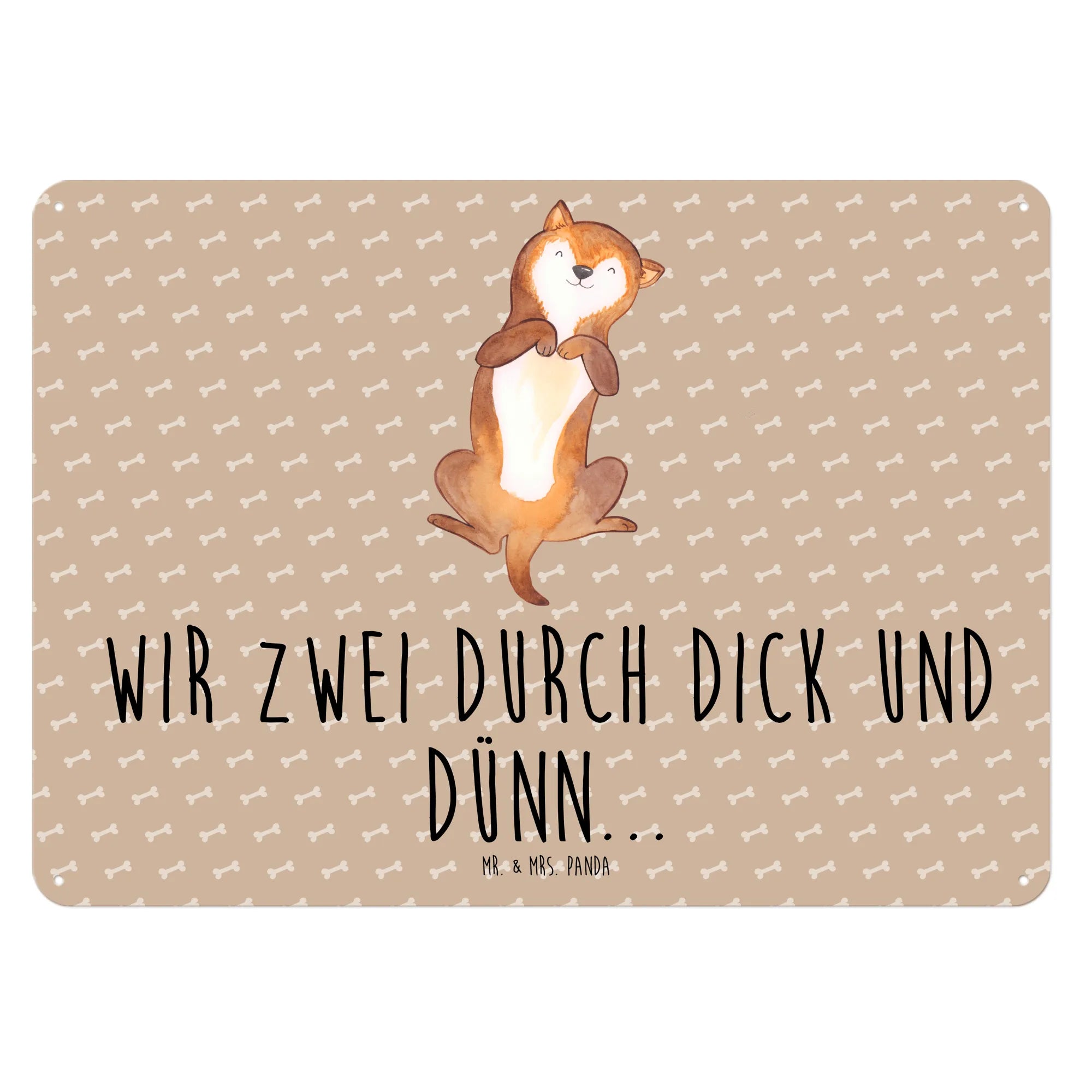 Das wunderschöne Blechschild "Hund Bauchkraulen" aus der Hunde Kollektion von Mr. & Mrs. Panda ist das perfekte Geschenk für alle Hundeliebhaber und Hundebesitzer. Wenn du einen besonderen Menschen in deinem Leben kennst, der Hunde liebt oder vielleicht sogar einen treuen vierbeinigen Freund besitzt, dann wirst du mit diesem Schild garantiert ein Lächeln auf ihr Gesicht zaubern. Der süße Hund, der begeistert auf dem Rücken liegt und sich den Bauch kraulen lässt, verkörpert pure Lebensfreude und den besonderen Moment, den viele Hundehalter täglich erleben. Mit dem liebevollen Slogan "Wir zwei durch dick und dünn..." wird dieses Schild zu einem herzlich willkommenen dekorativen Highlight in jedem Zuhause.