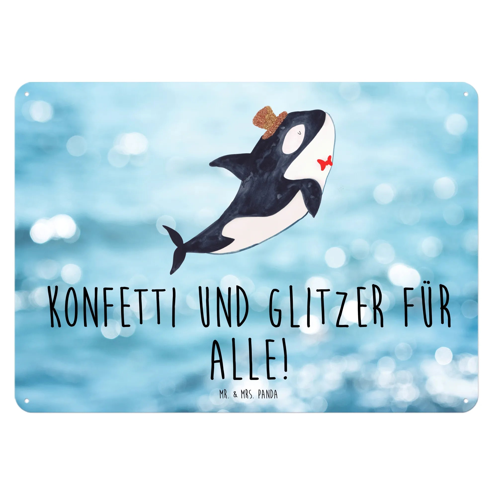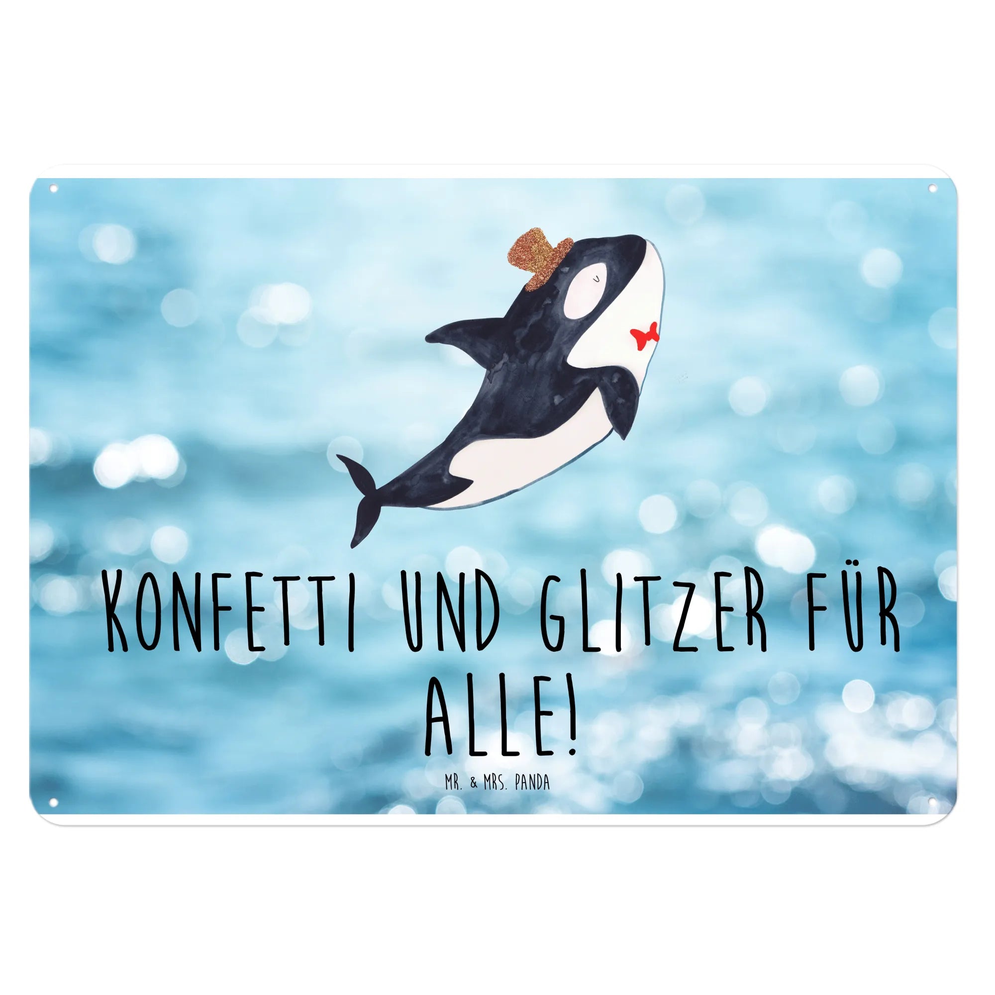 Ein wunderschönes und edles Blechschild von Mr. & Mrs. Panda, das das Herz eines jeden Meerestiere-Liebhabers höher schlagen lässt! Mit einem charmanten Motiv eines Orcas, der einen Zylinder trägt und verspielten Glitzer-Elementen, zieht dieses Schild alle Blicke auf sich.