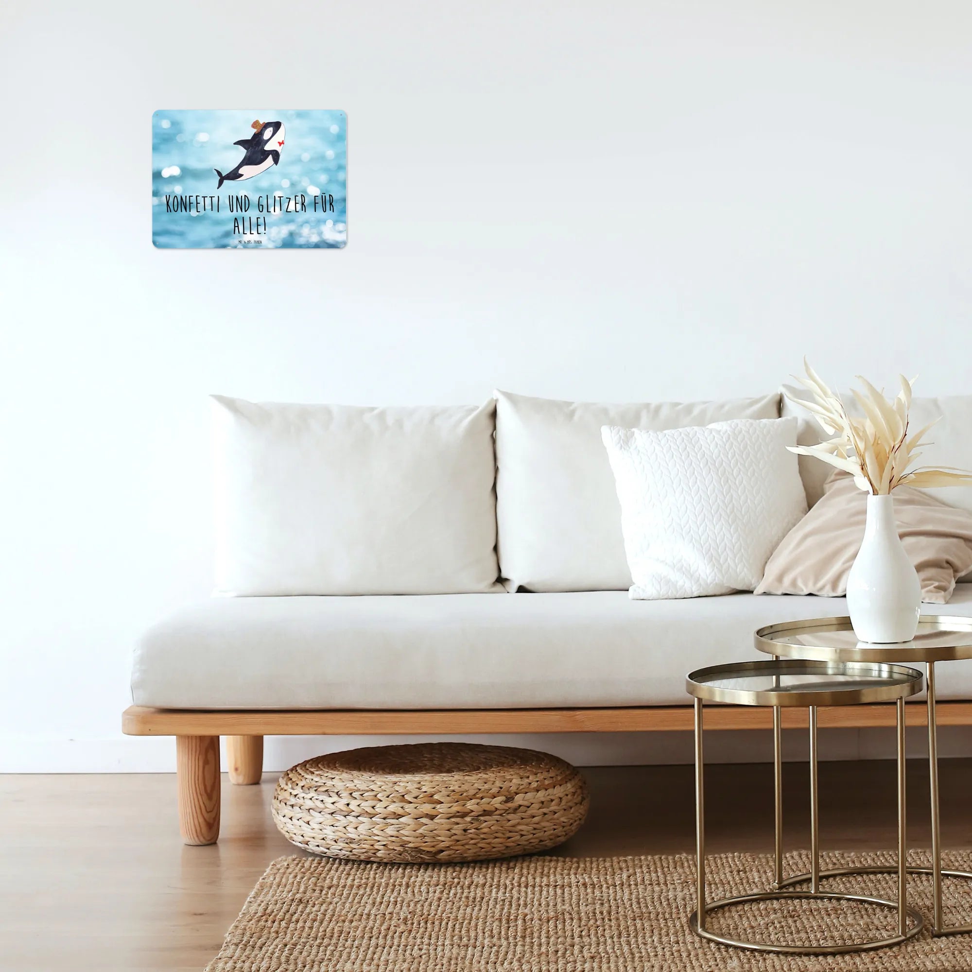 Das Blechschild mit dem niedlichen Orca Zylinder von Mr. & Mrs. Panda ist das perfekte Geschenk für alle Liebhaber der Meerestiere und sorgt für gute Laune in jedem Zuhause. Mit seinem liebevoll gestalteten Motiv eines fröhlichen Orcas, der einen Zylinder trägt, zaubert es jedem, der es sieht, ein Lächeln ins Gesicht. Das Schild ist nicht nur eine außergewöhnliche Wanddekoration, sondern auch eine tolle Möglichkeit, besonderen Anlässen wie Geburtstagen oder Feierlichkeiten einen Hauch von Glitzer und Konfetti zu verleihen.