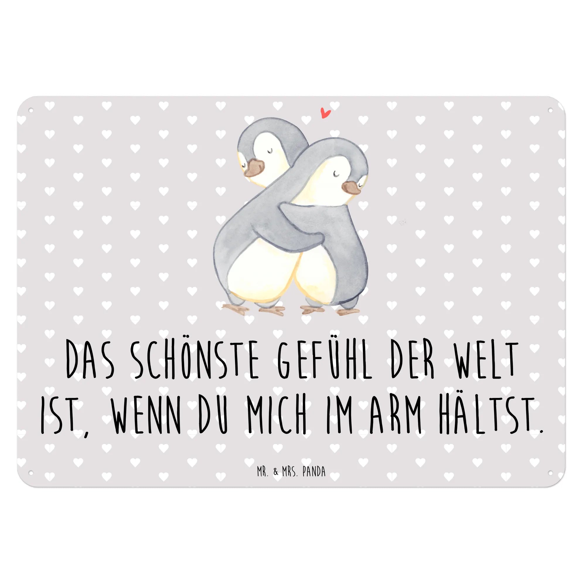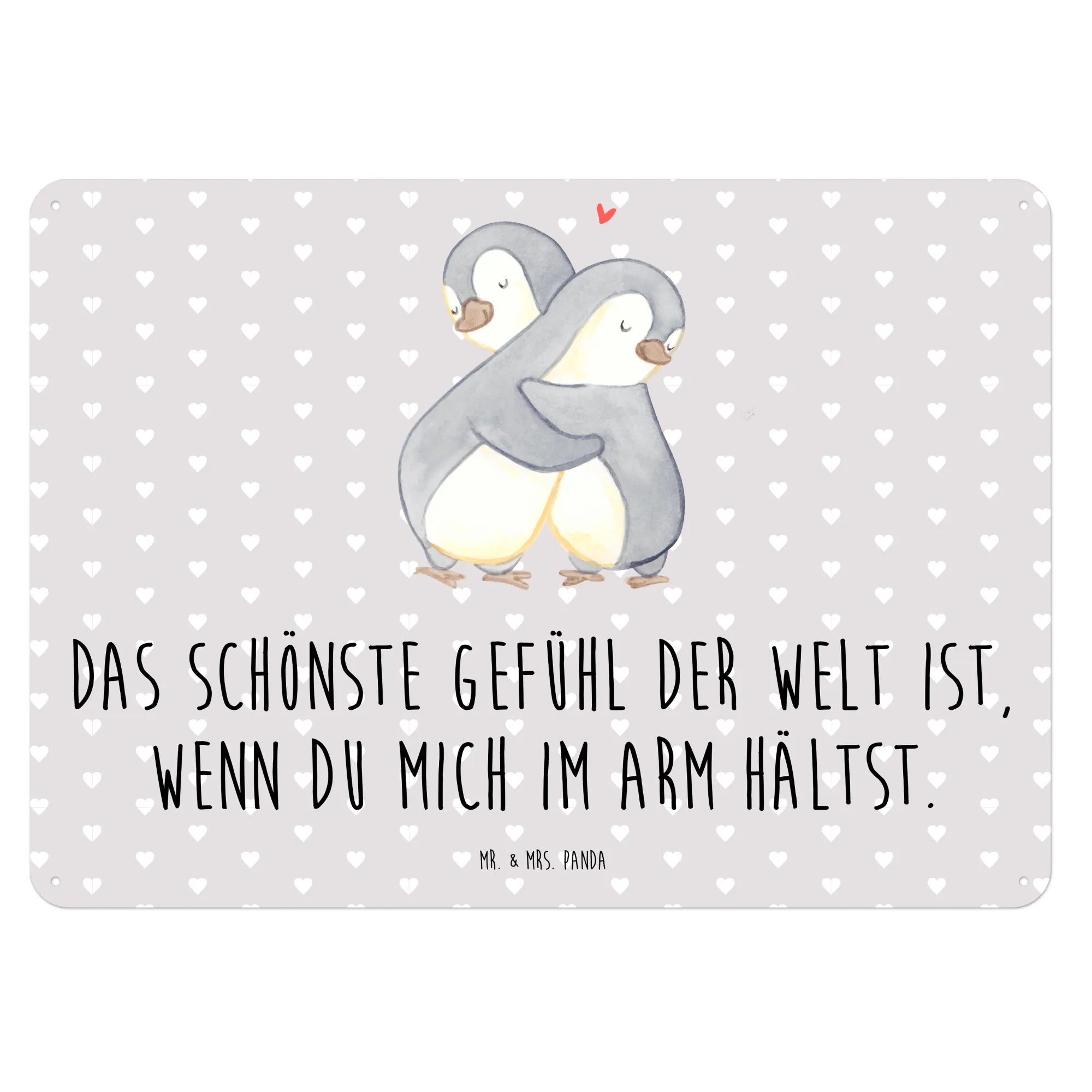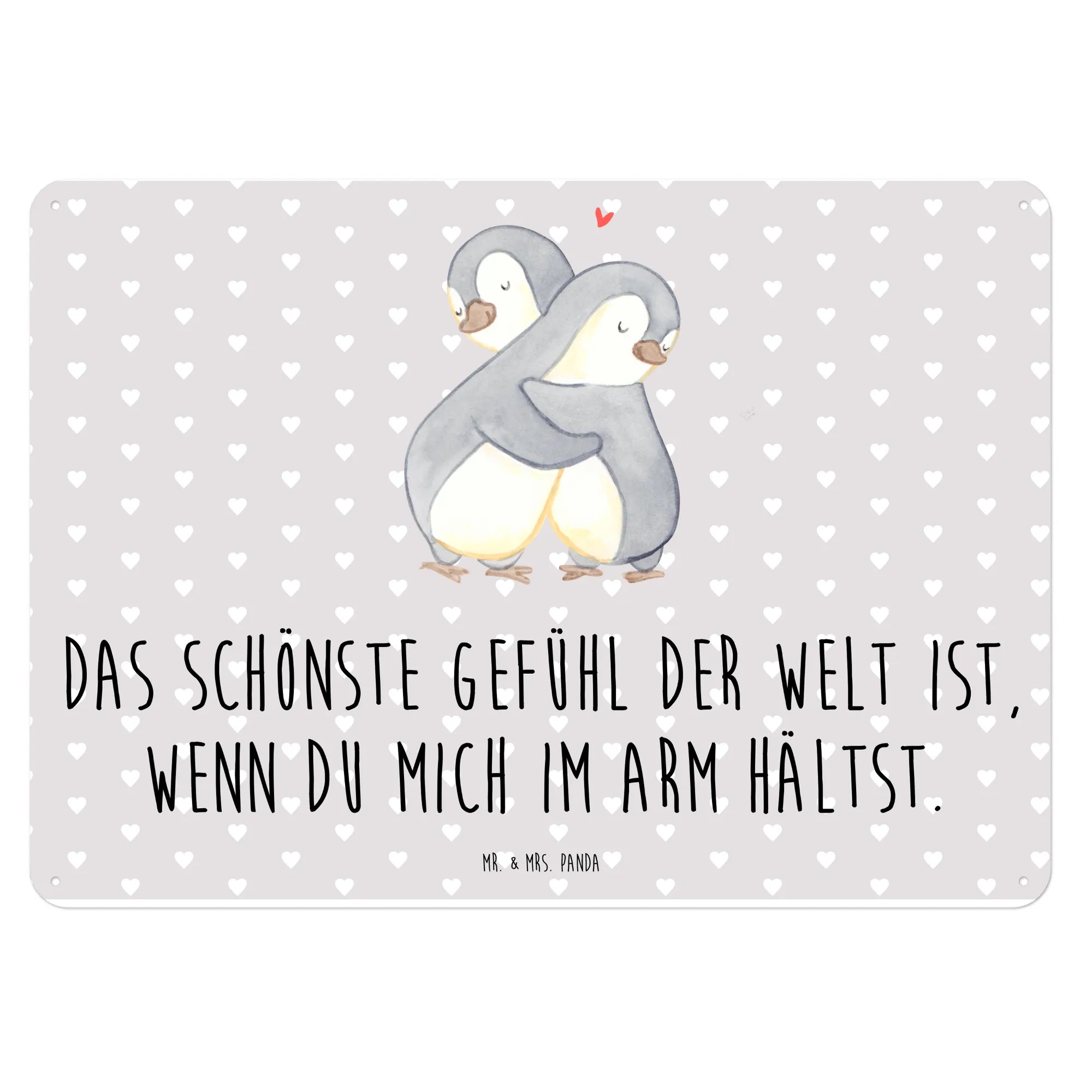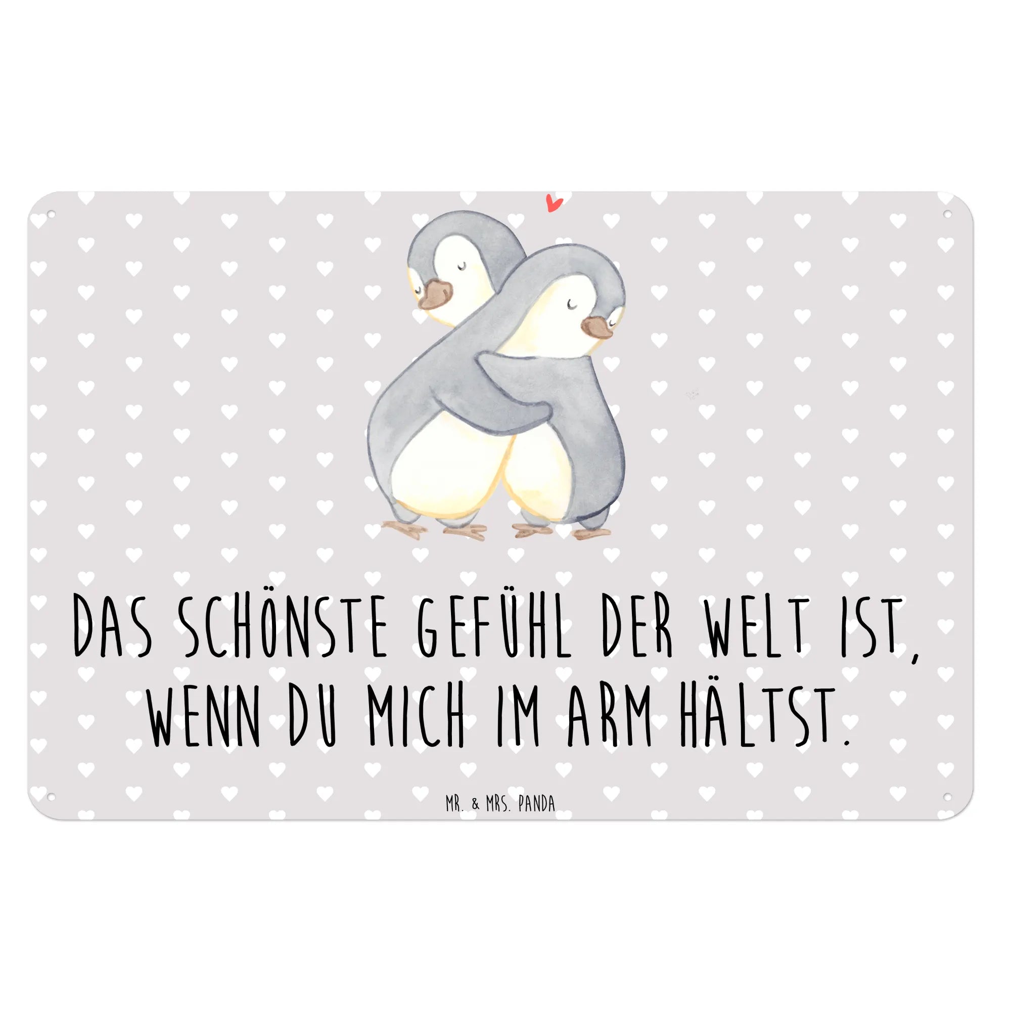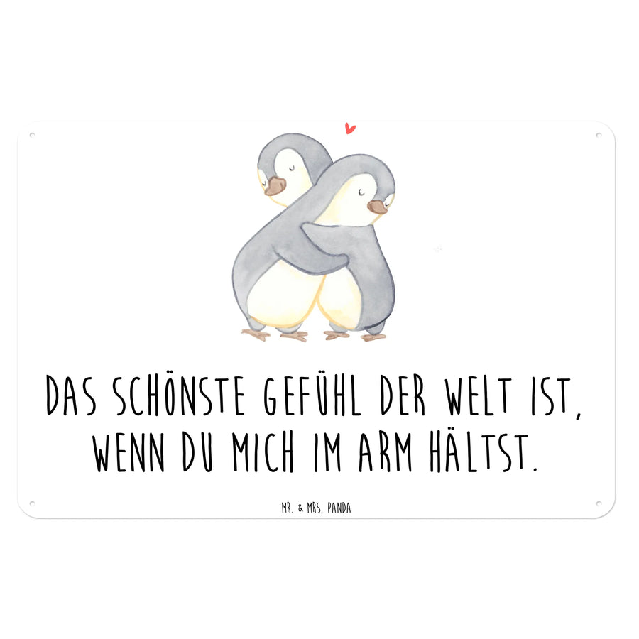 Das edle Blechschild "Pinguine Kuscheln" von Mr. & Mrs. Panda ist das perfekte Geschenk für Verliebte. Mit einem liebevollen Motiv, das zwei niedliche Pinguine zeigt, die sich innig umarmen, zaubert es ein Lächeln auf jedes Gesicht. Der Slogan "Das schönste Gefühl der Welt ist, wenn du mich im Arm hältst." spricht romantische Herzen an und eignet sich hervorragend als Liebesbeweis für deinen Partner oder deine Partnerin.