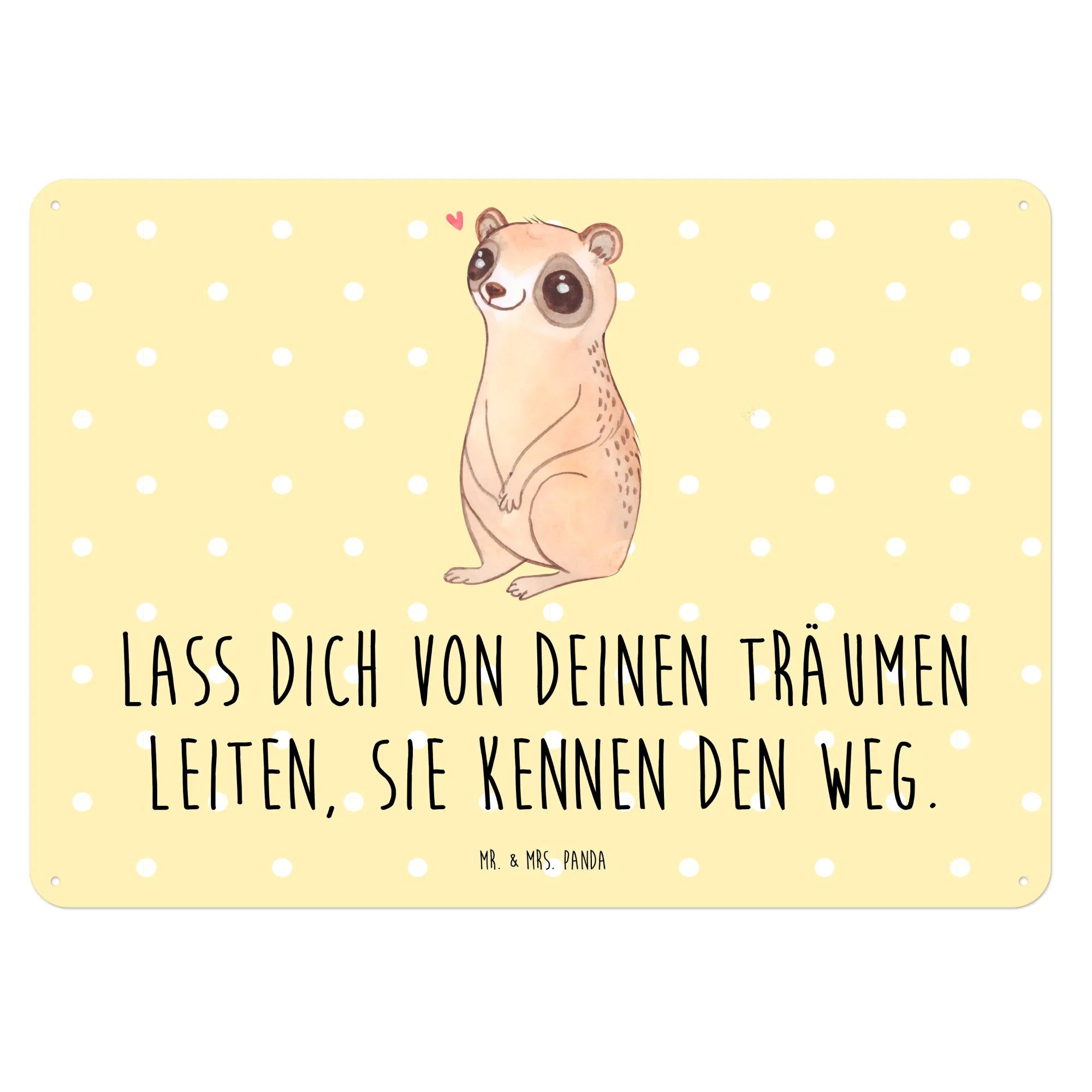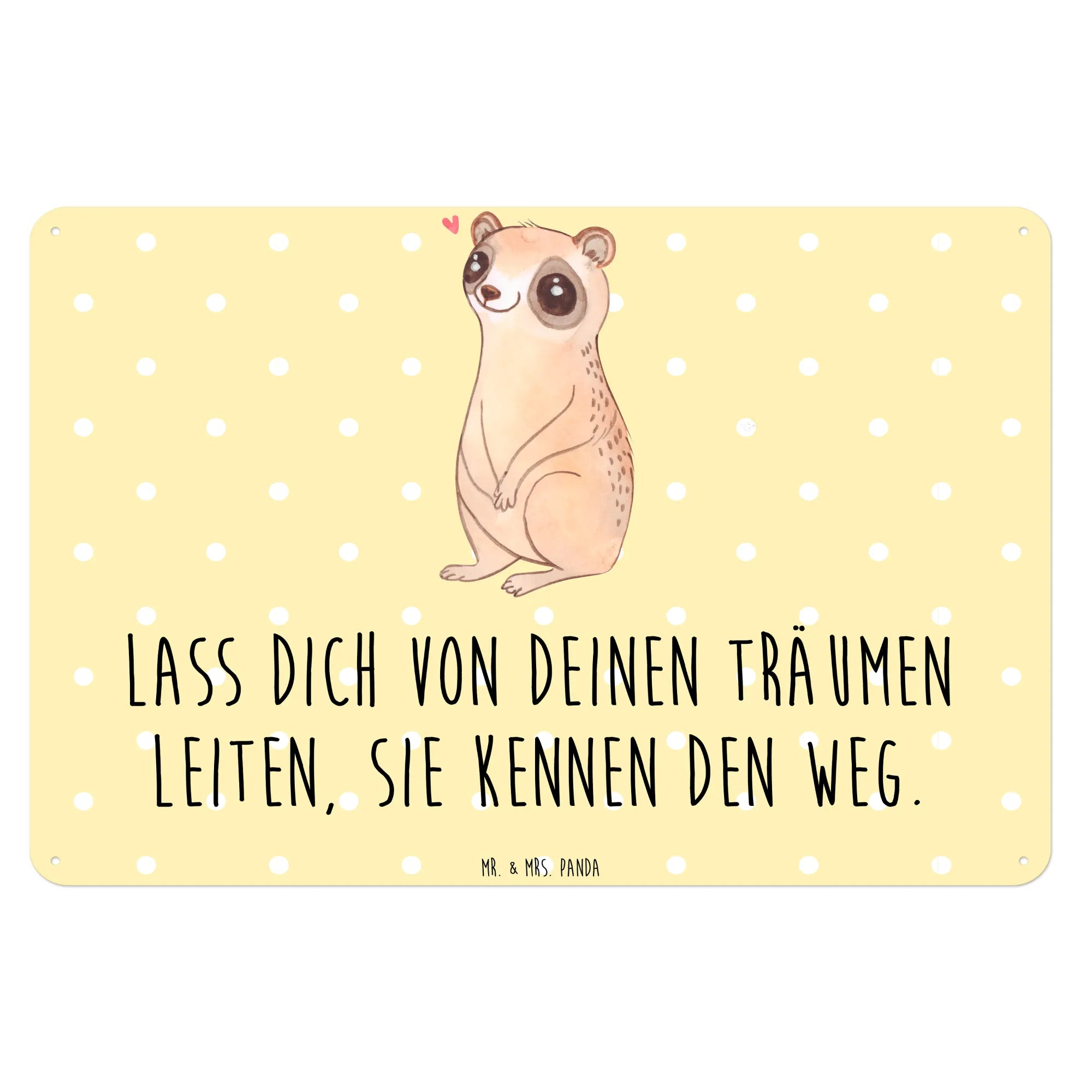 Das wunderschöne und edle Blechschild "Plumplori Glücklich" von Mr. & Mrs. Panda ist der perfekte Begleiter für alle, die Freude und gute Laune in ihrem Zuhause verbreiten möchten. Mit einem liebevoll handgezeichneten Motiv eines niedlichen Plumploris und dem inspirierenden Spruch "Lass dich von deinen Träumen leiten, sie kennen den Weg." zaubert dieses Schild jedem ein Lächeln ins Gesicht.