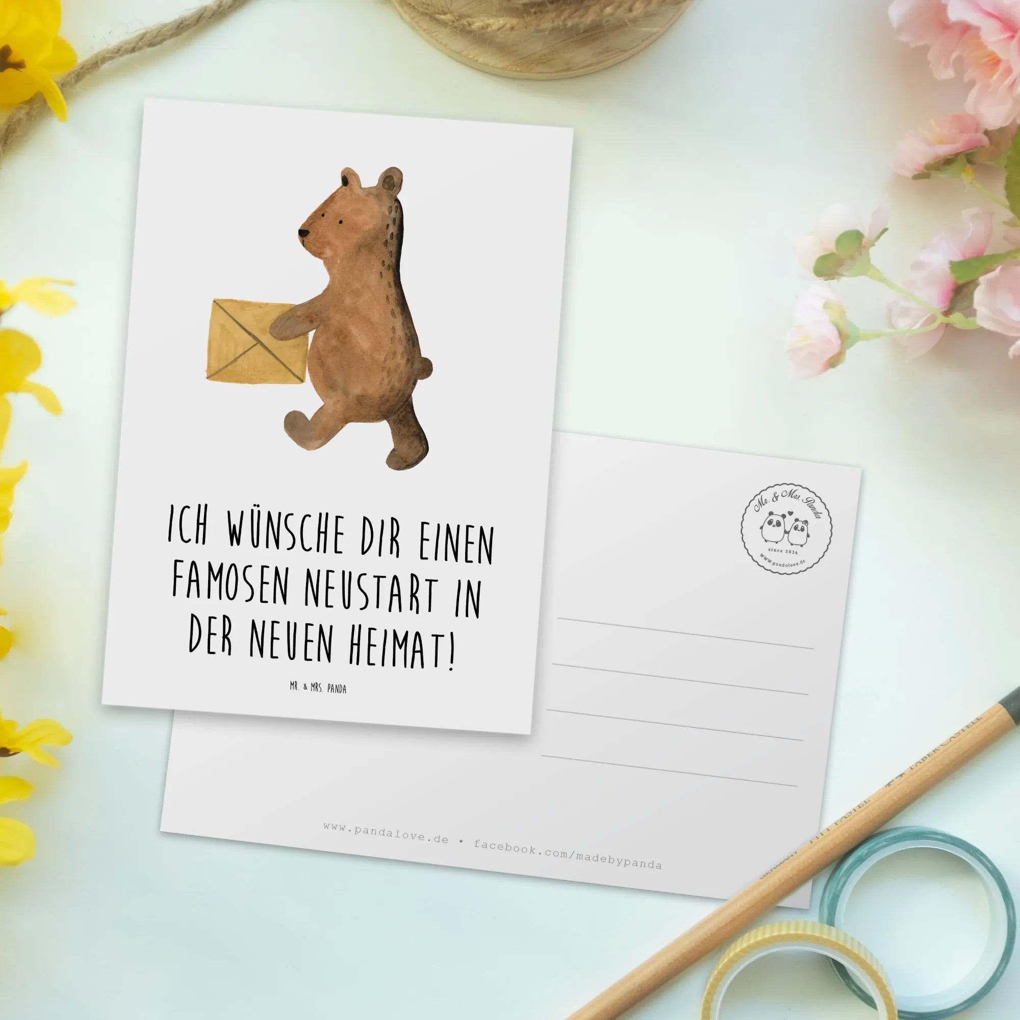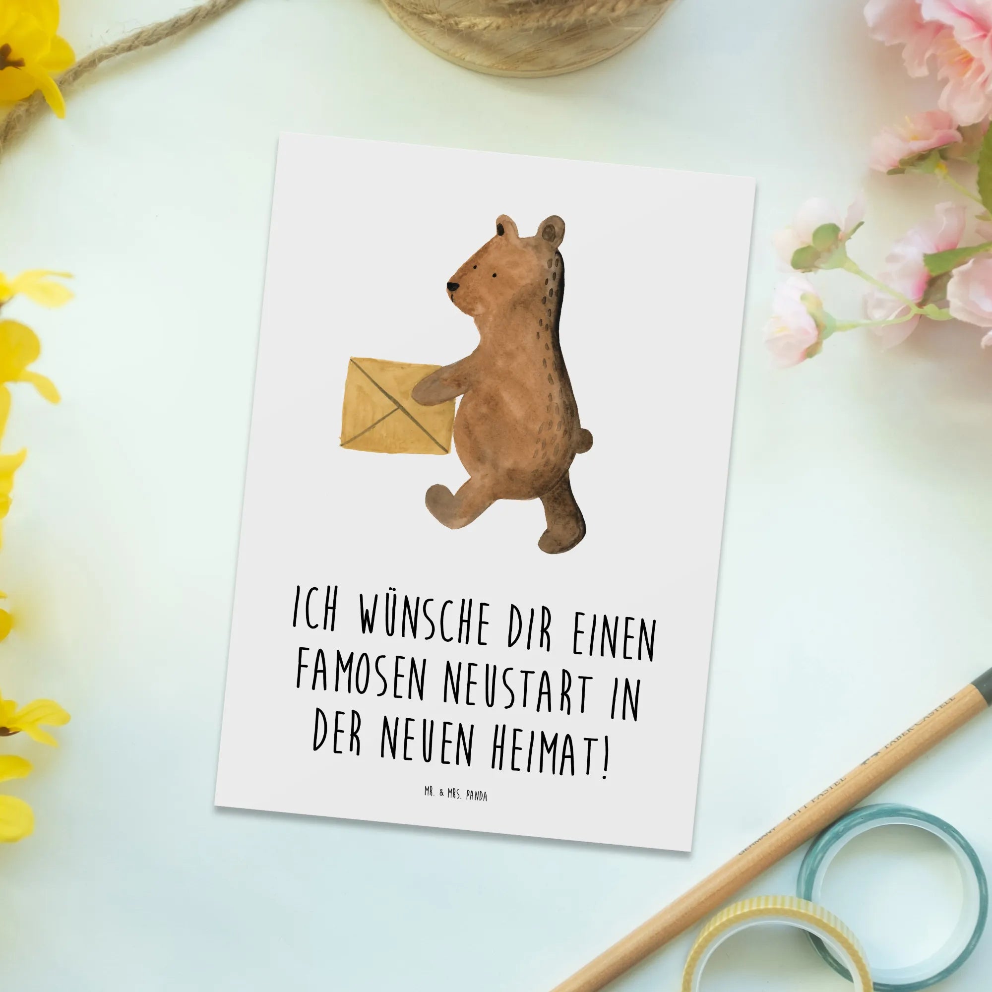 Suchst du eine liebevolle Geste für den Neuanfang? Unsere Postkarte „Umzug in eine neue Stadt“ aus der Mutmacher-Kollektion von Mr. & Mrs. Panda ist genau dafür gemacht. Mit dem herzlichen Slogan „Ich wünsche dir einen famosen Neustart in der neuen Heimat!“ schickst du sofort Zuversicht und ein Lächeln 😊
