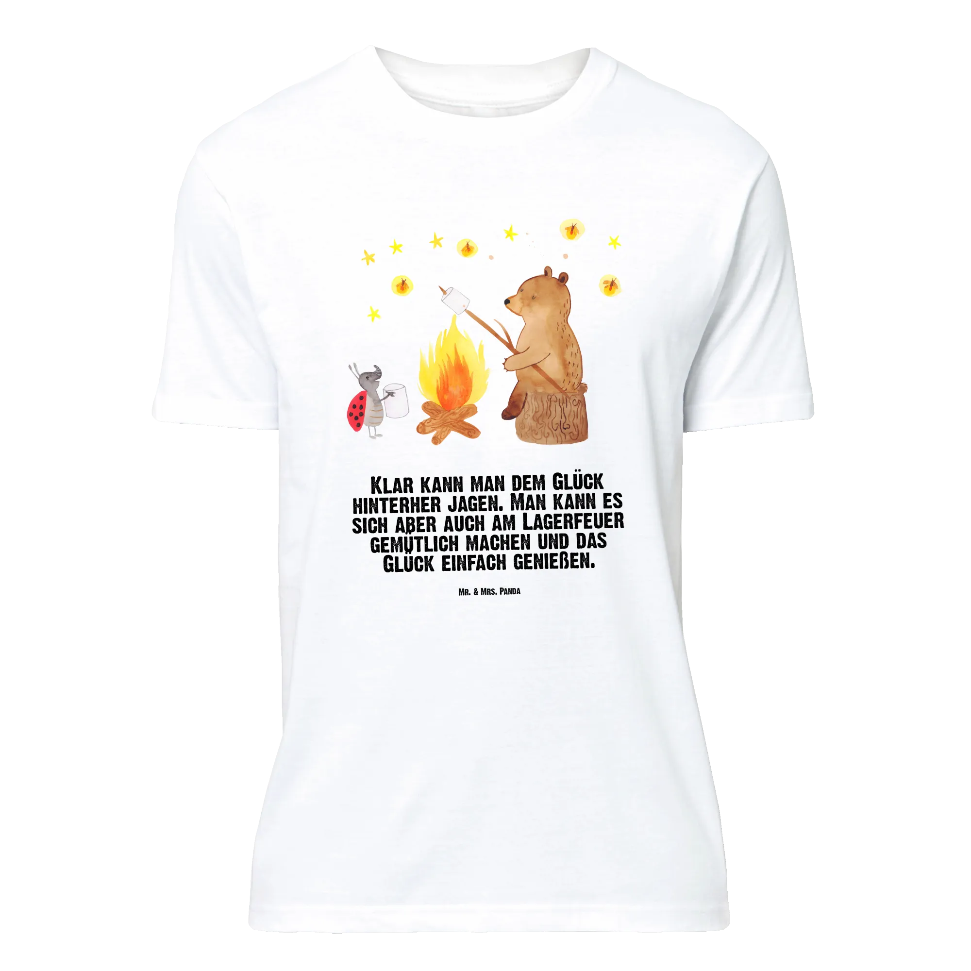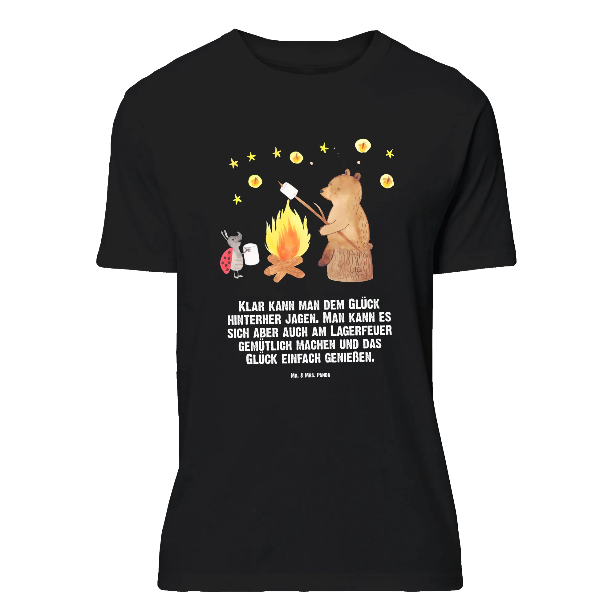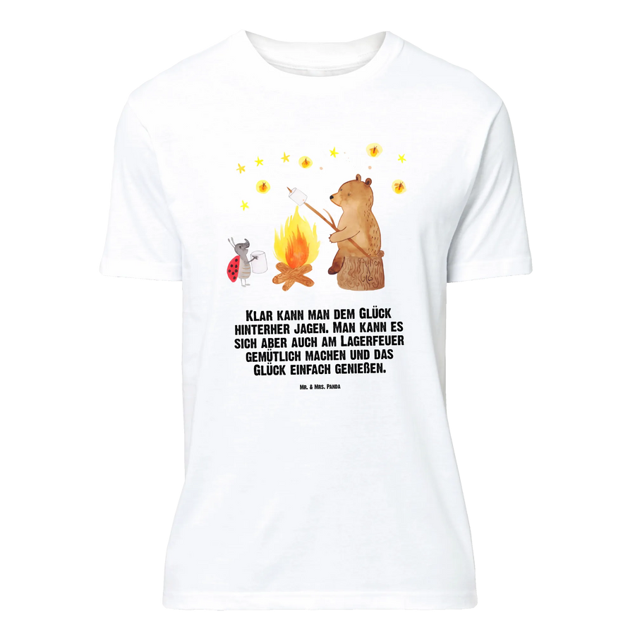 Du liebst niedliche Bärenmotive und suchst ein Shirt, das Gemütlichkeit und Charme ausstrahlt? Dieses T-Shirt zeigt einen fröhlichen Bären, der auf einem Baumstumpf sitzt und einen Marshmallow über dem Lagerfeuer röstet, während ein kleiner Marienkäfer daneben steht. Der sternenklare Himmel und die kleinen Feuerfliegen sorgen für einen märchenhaften Look. Dazu unser Spruch: „Klar kann man dem Glück hinterher jagen. Man kann es sich aber auch am Lagerfeuer gemütlich machen und das Glück einfach genießen.“