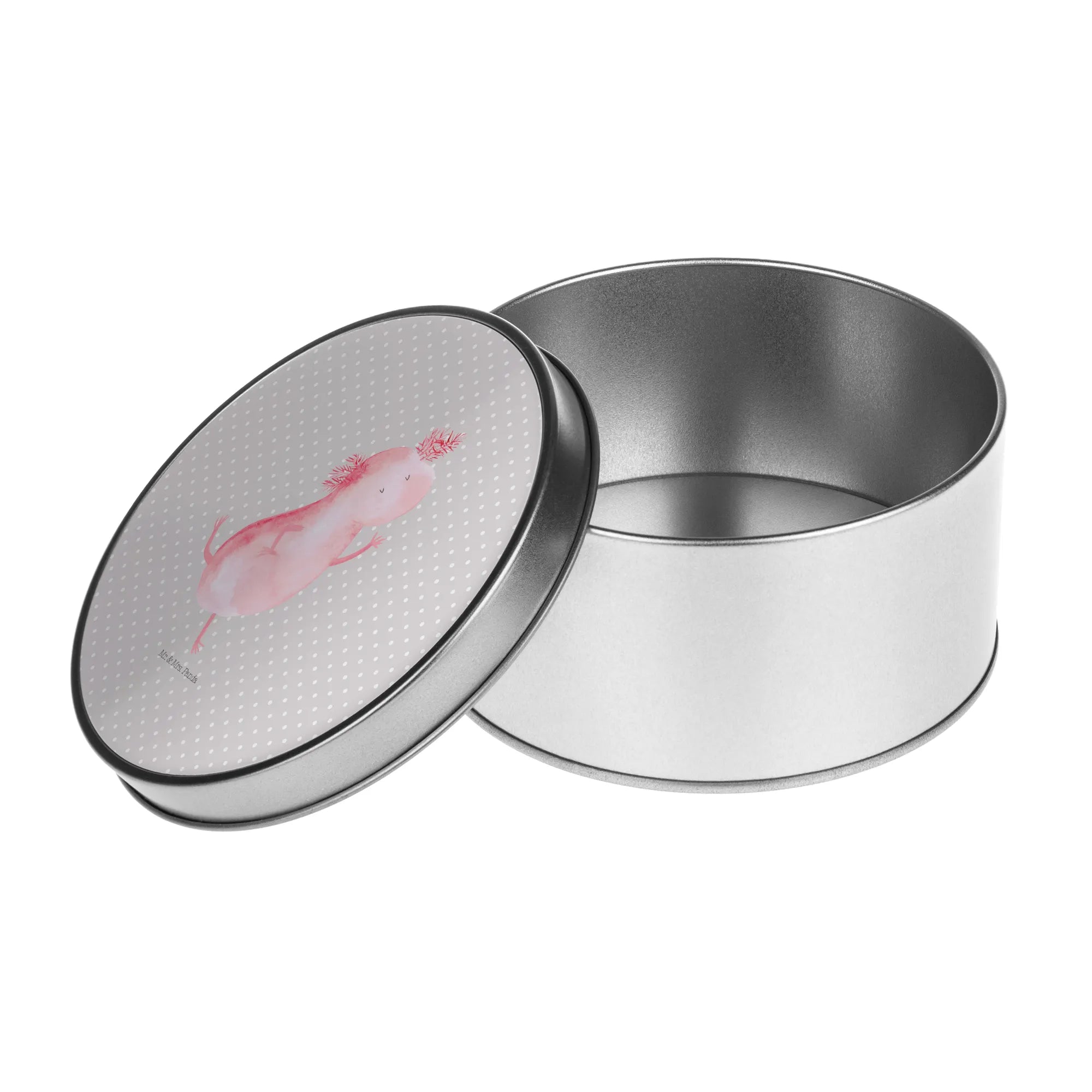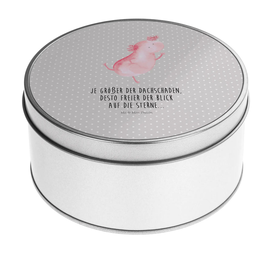 okrągła puszka z blachy aksolotl tańczyć - z napisem