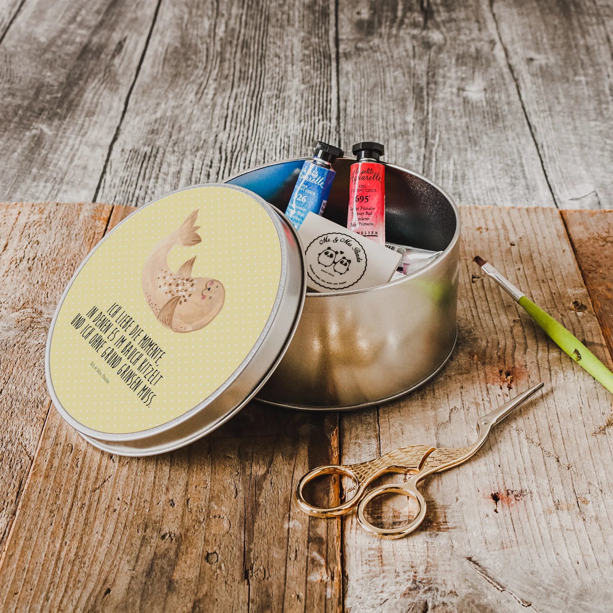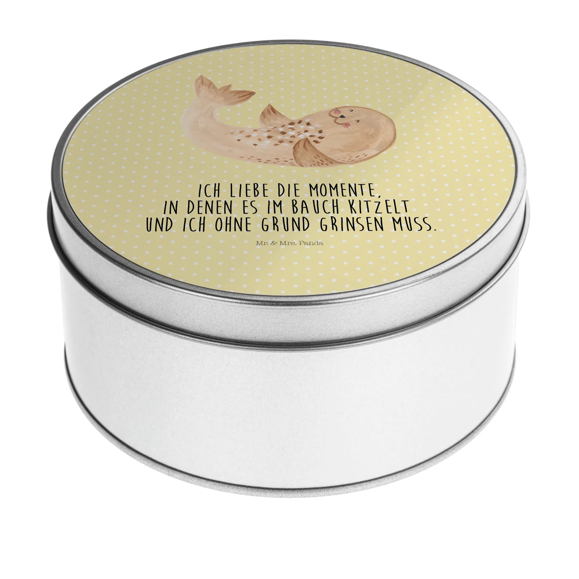 okrągła puszka z blachy foka Leżeć - z napisem