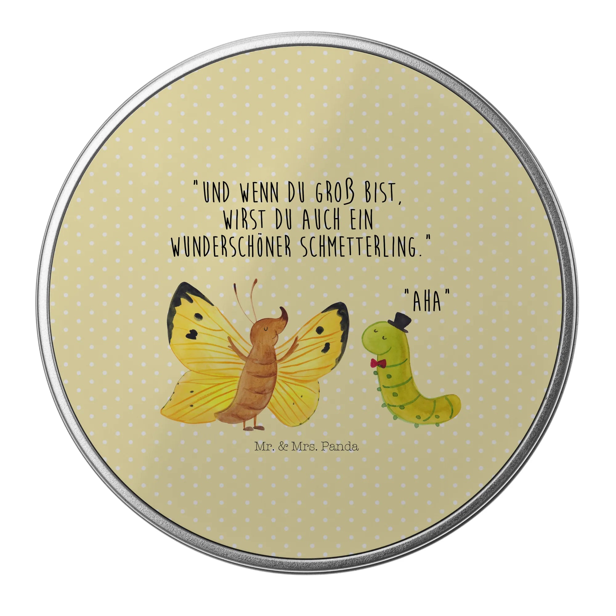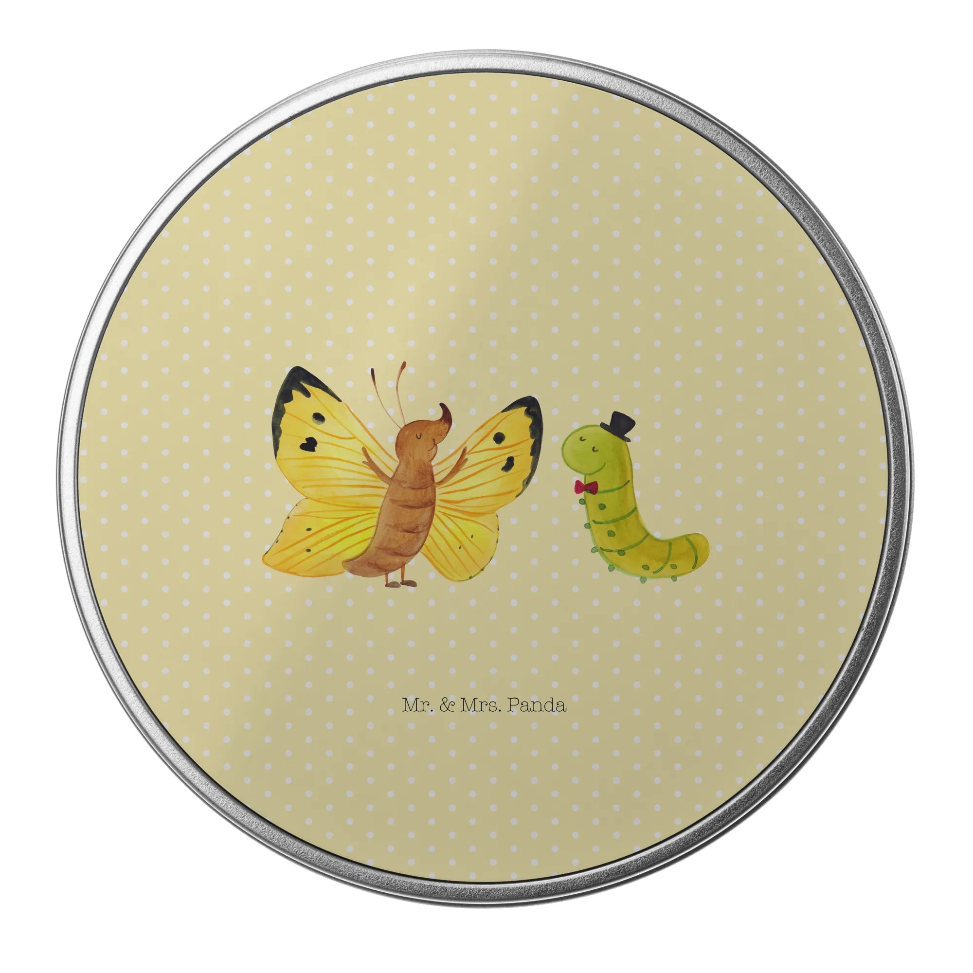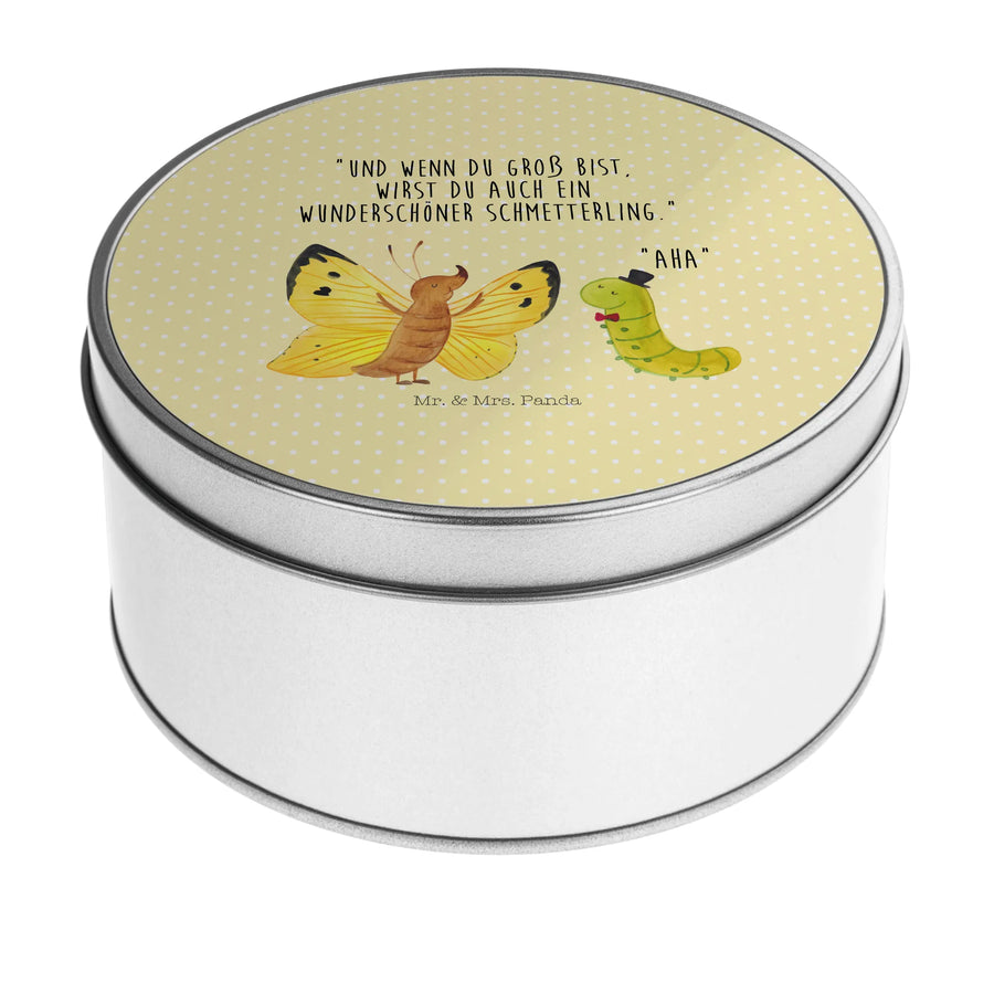 okrągła puszka z blachy gąsienica motyl - z napisem