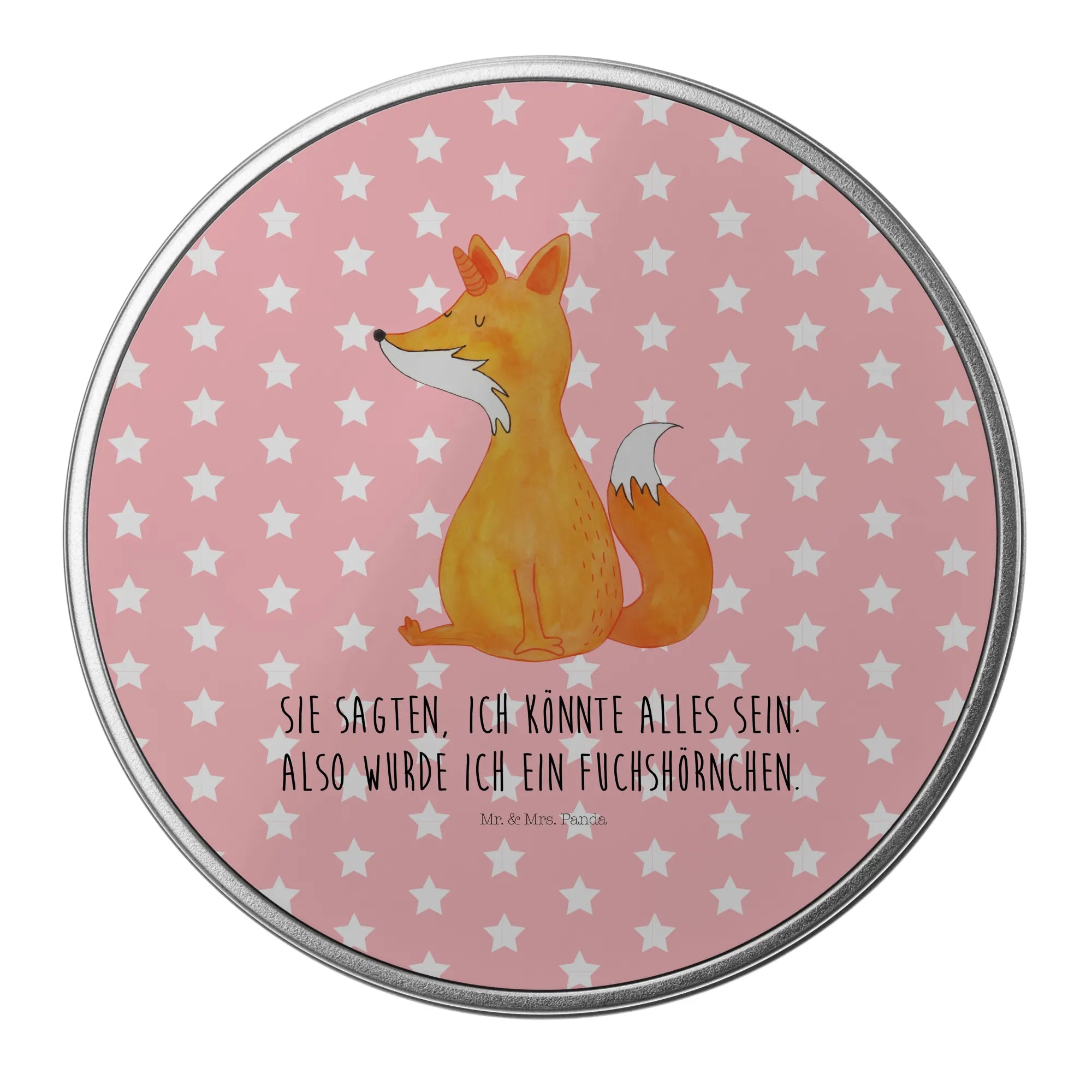 okrągła puszka z blachy Jednorożec lis - z napisem