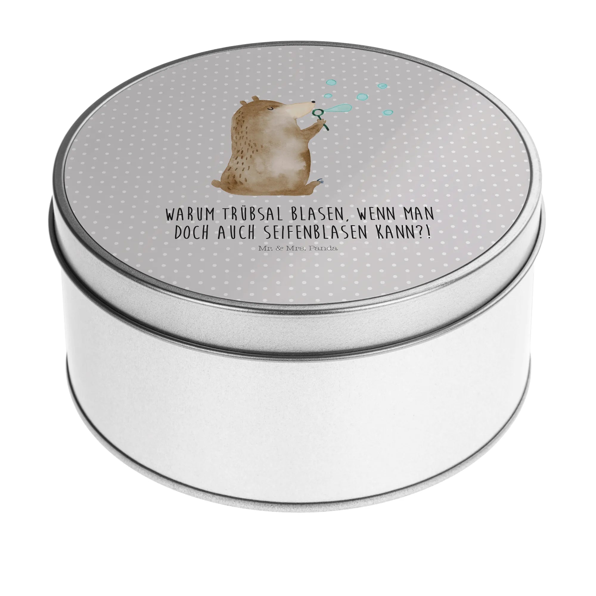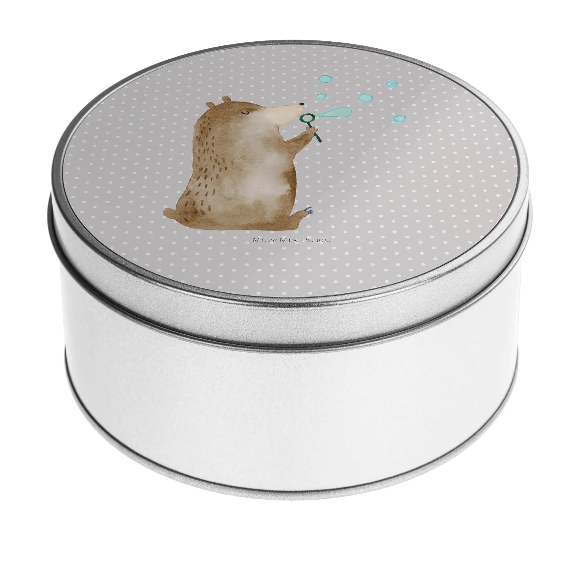 okrągła puszka z blachy niedźwiedź bańki mydlane - z napisem