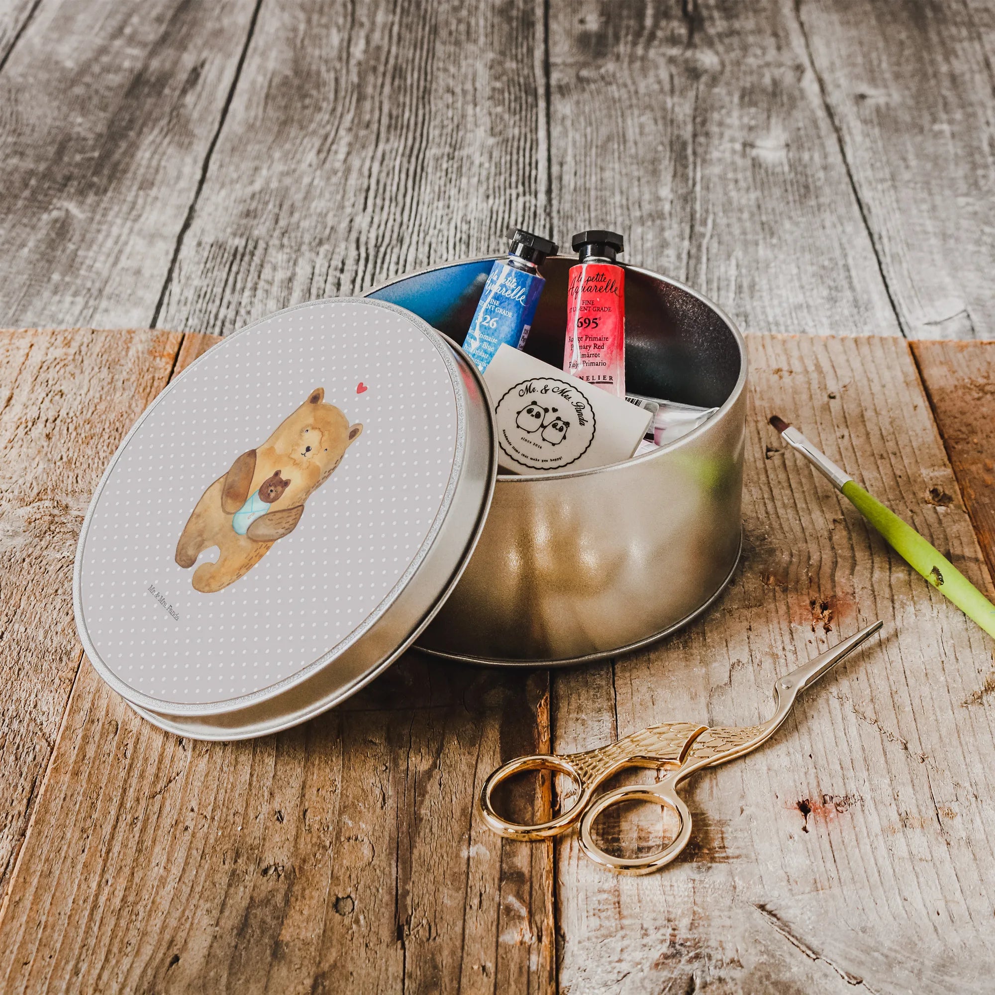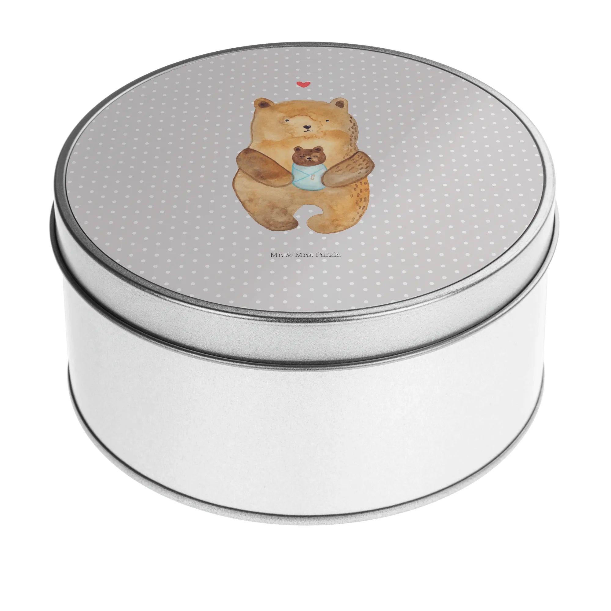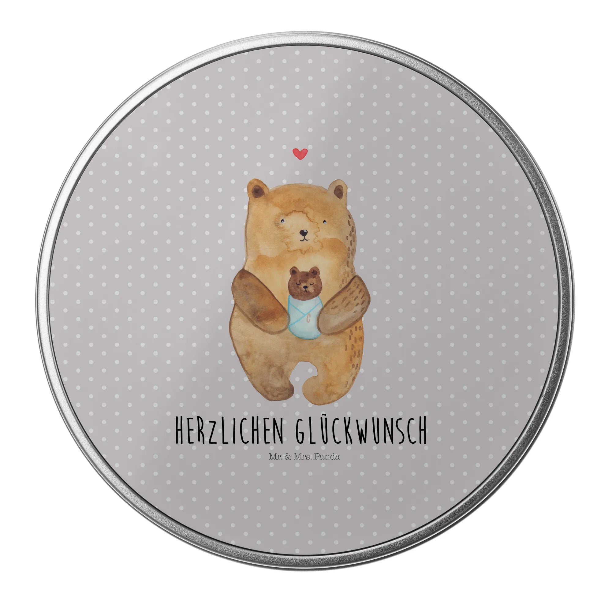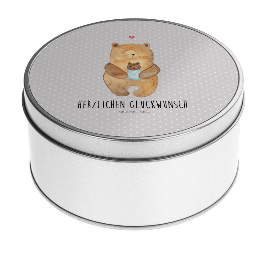 okrągła puszka z blachy Niedźwiedź Niemowlę - z napisem