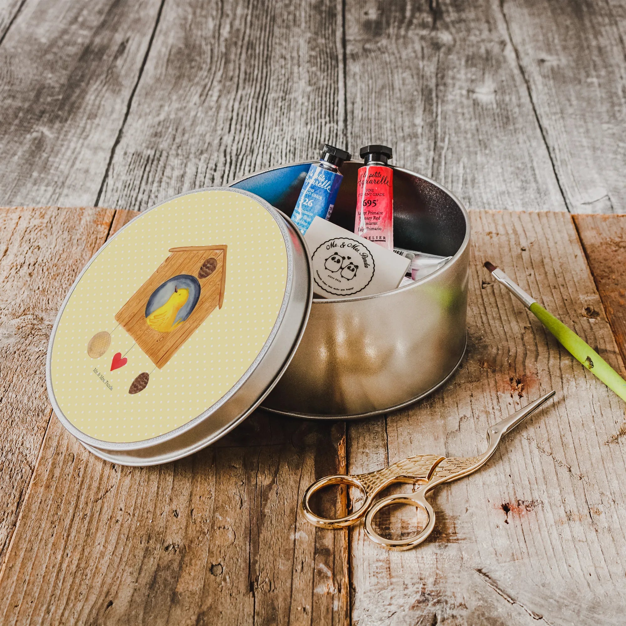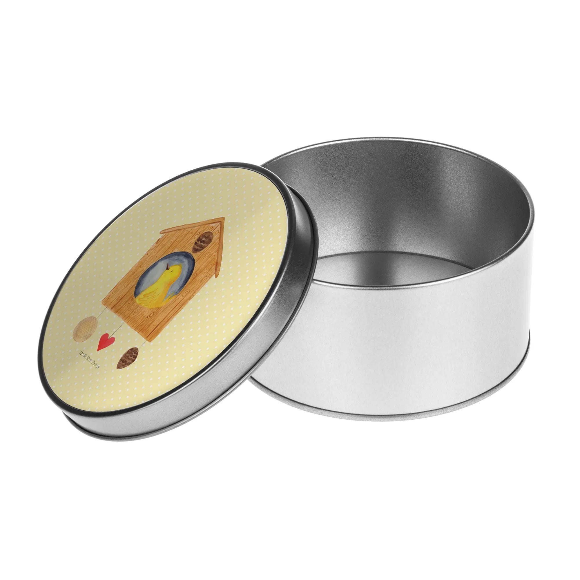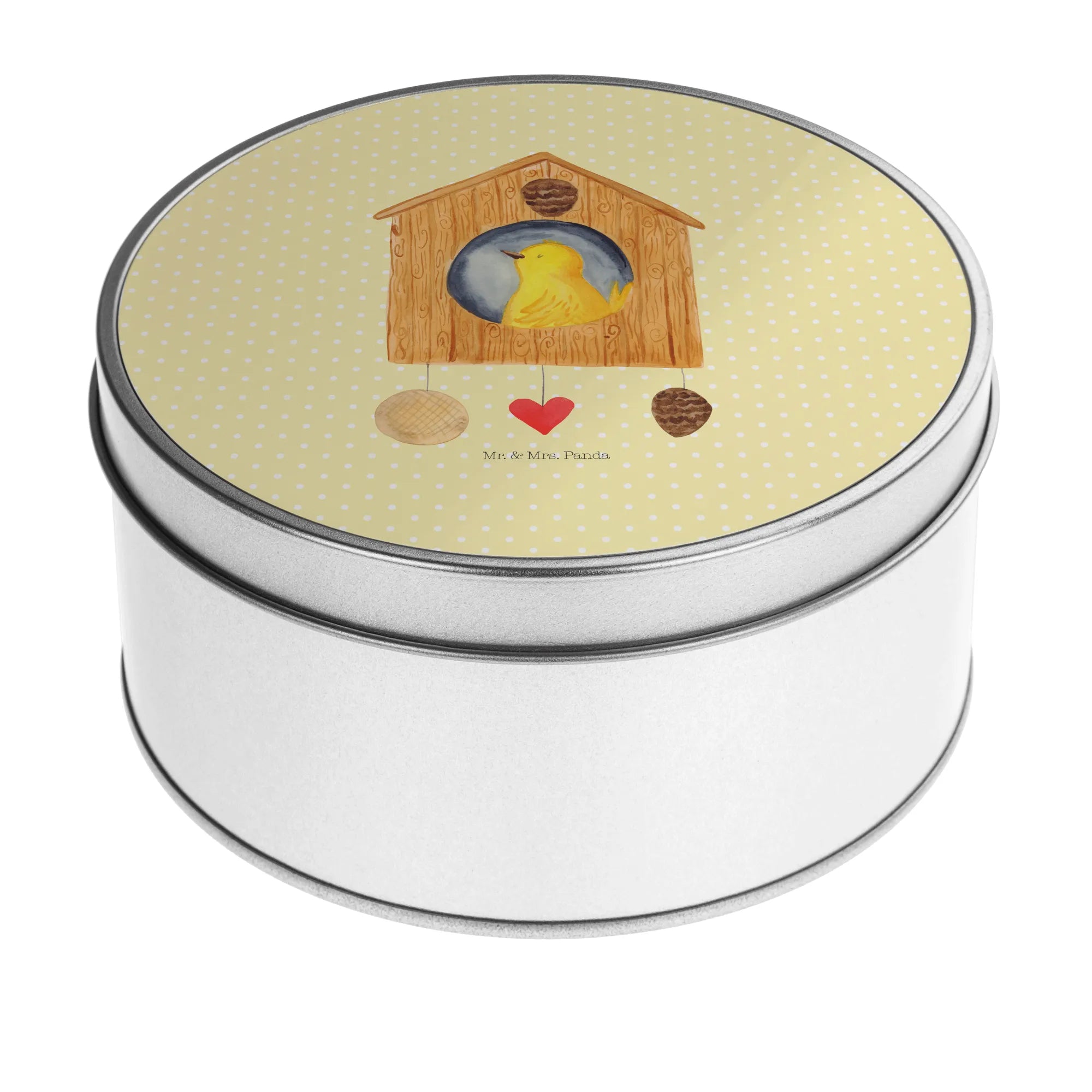 okrągła puszka z blachy ptasi domek Strona główna - z napisem
