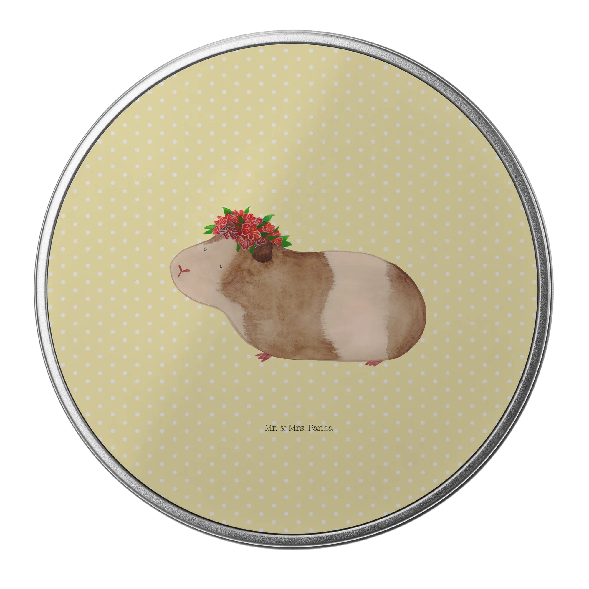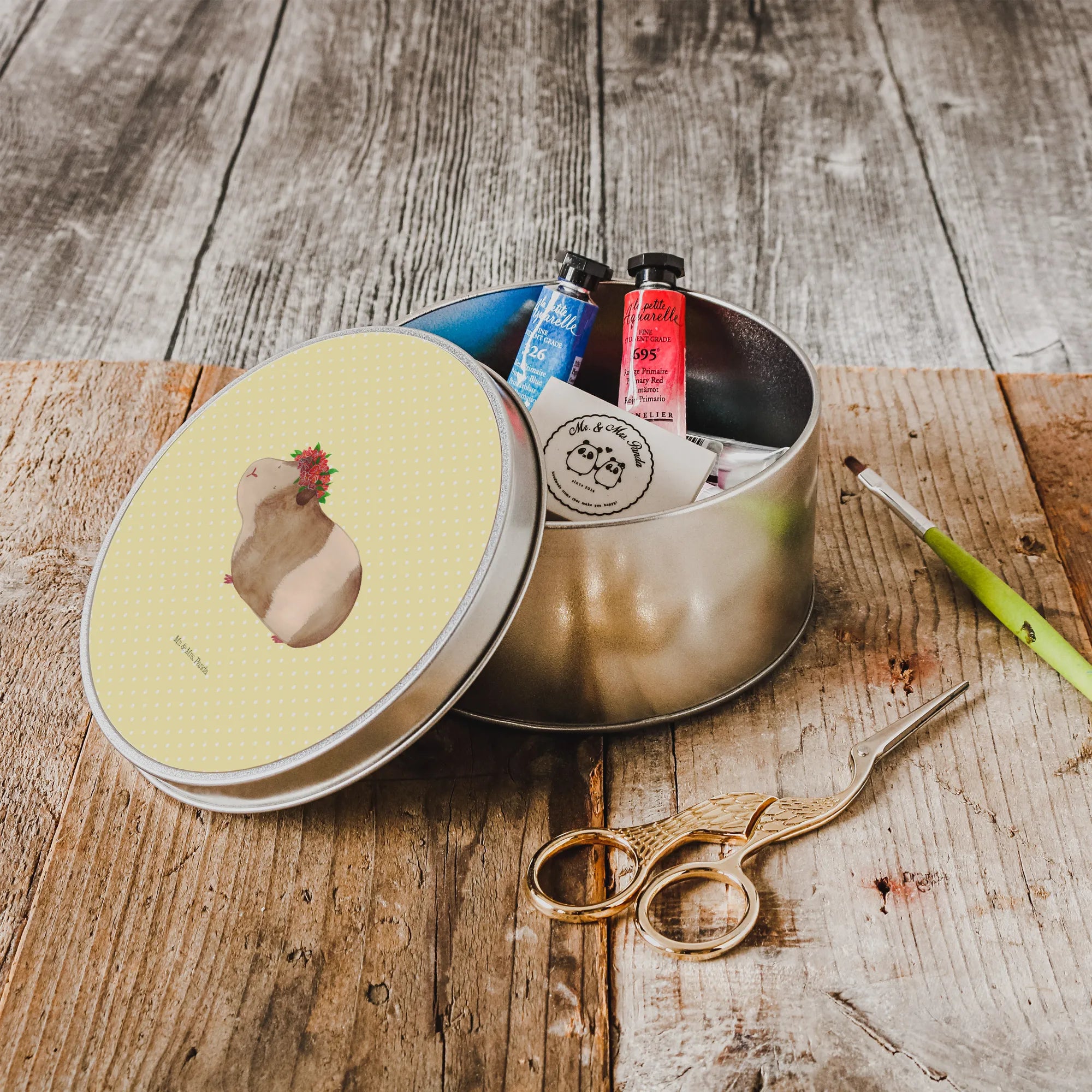 okrągła puszka z blachy świnka morska mądrość - z napisem